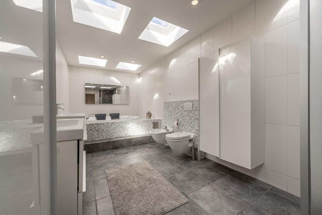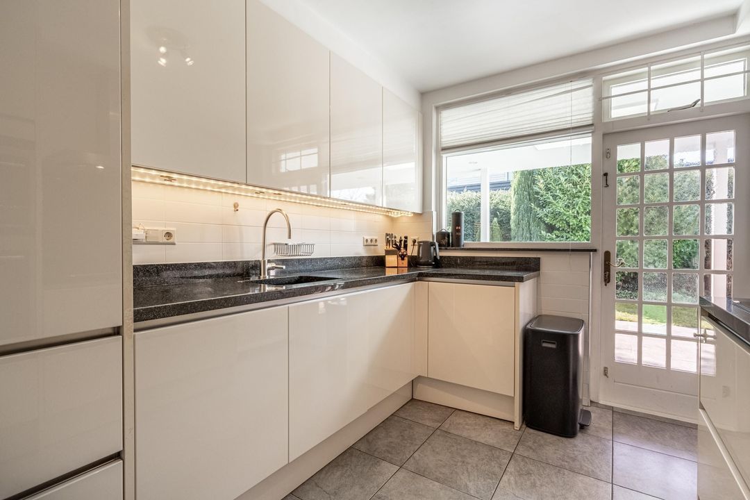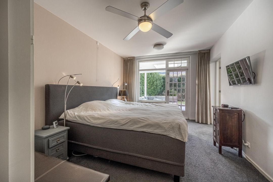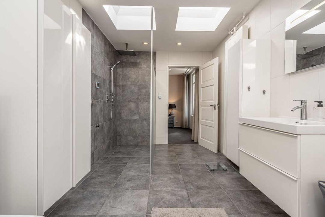 De keuken is uitgevoerd in een lichte kleurstelling en voorzien van diverse inbouwapparatuur, waaronder een vaatwasser, oven, combioven, koel-/vriescombinatie en elektrische kookplaat. Ook vanuit de keuken loop je zo door naar de veranda. Naast de keuken ligt de ouderslaapkamer, voorzien van enkele vaste kasten en met directe toegang tot zowel de veranda als de badkamer. Die badkamer is, zonder te overdrijven, indrukwekkend te noemen. Met een afmeting van circa 7,19 x 2,57 meter met maar liefst zes grote lichtkoepels, vloerverwarming, twee wastafelmeubels, toilet, bidet, jacuzzi en een royale inloopdouche, voelt deze ruimte bijna als een eigen wellness. Direct tegenover de ouderslaapkamer is in een voormalige badkamer een praktische kastenkamer gerealiseerd.