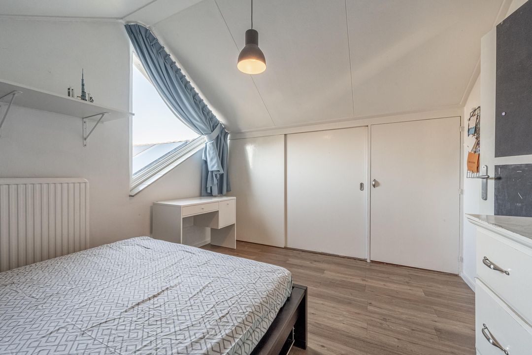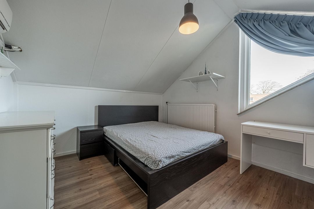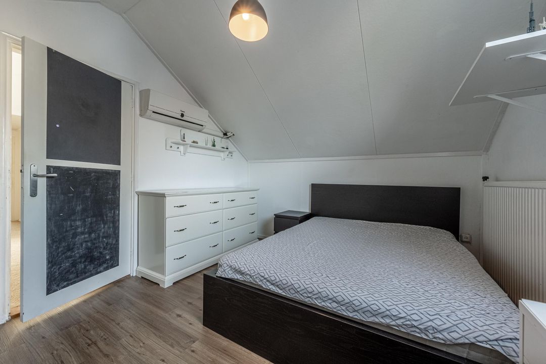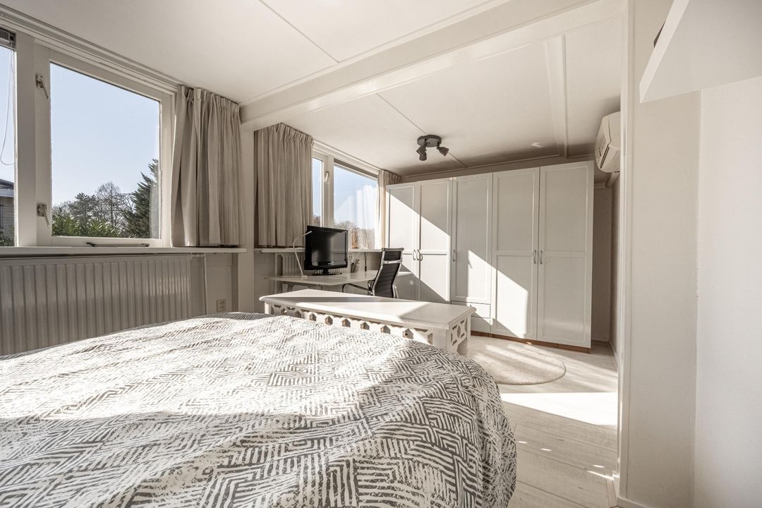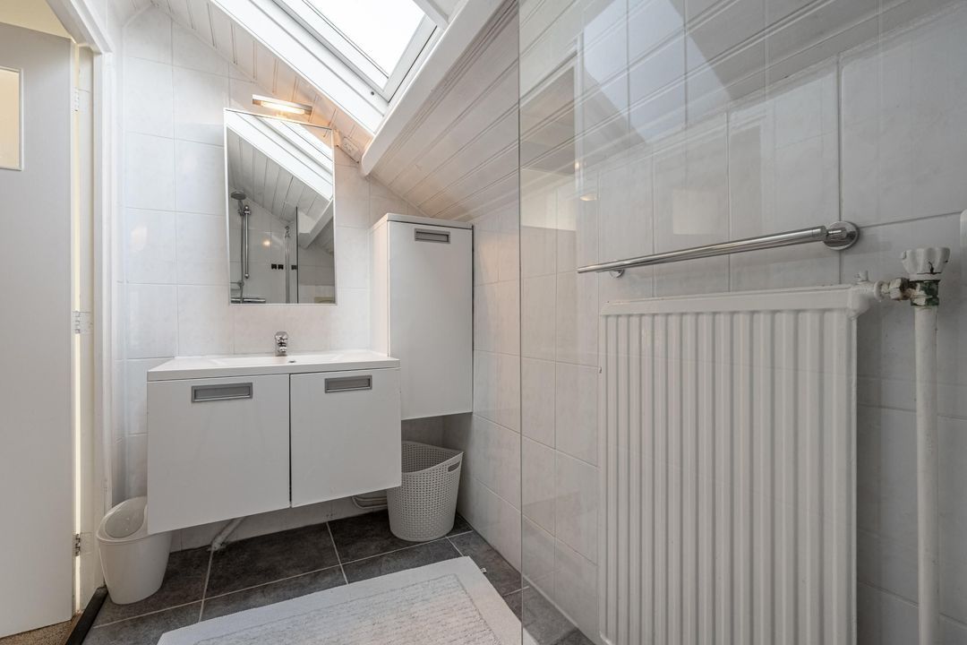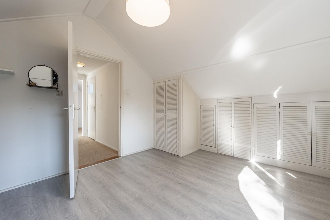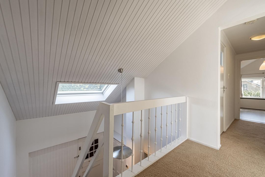 Op de eerste verdieping geeft een lange, lichte overloop toegang tot drie slaapkamers en een tweede badkamer. Ook hier zorgt het dakraam boven de vide voor prettig daglicht. De slaapkamers in het midden en rechts van de trapopgang zijn voorzien van airco en de slaapkamer in het midden heeft een grote dakkapel. De beide slaapkamers aan de uiteinden beschikken over vaste kastruimte achter diverse knieschotten. De overloop is afgewerkt met vloerbedekking en de slaapkamers zijn voorzien van laminaat. De tweede badkamer is uitgerust met een inloopdouche, toilet, wastafelmeubel en heeft daglicht via een dakraam.