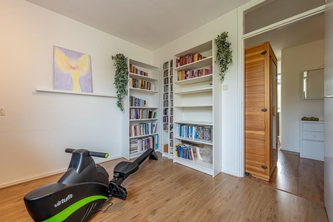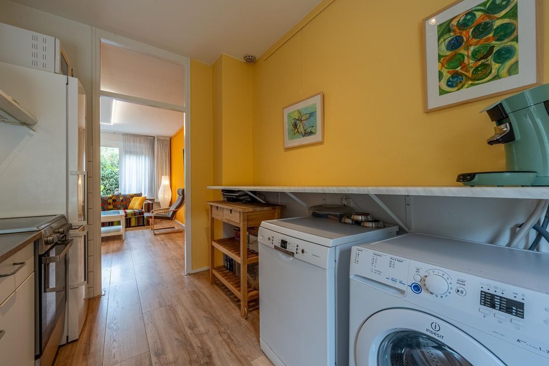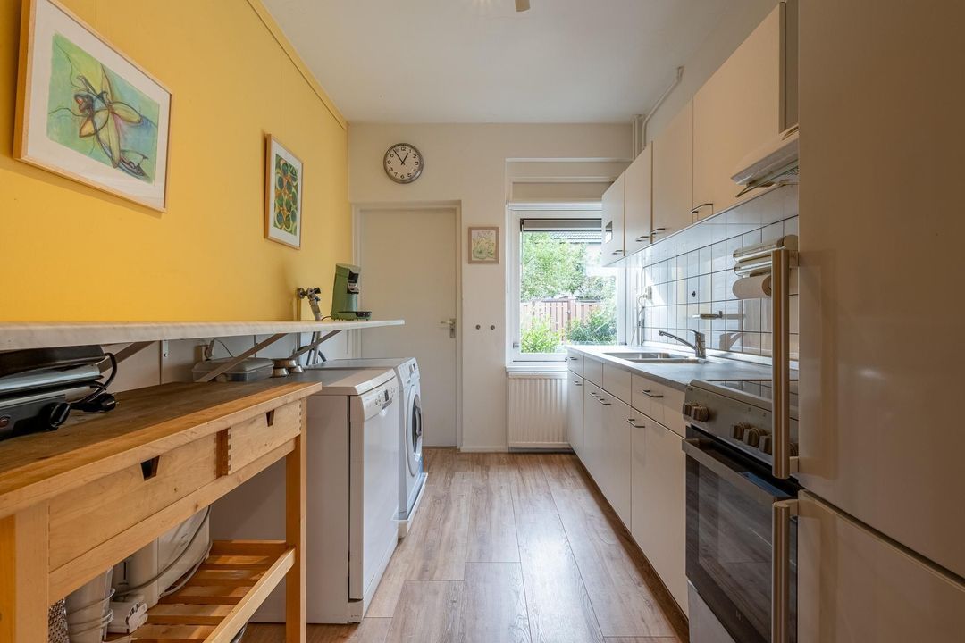 Naast de keuken bevindt zich een praktische berging met een deur die toegang biedt tot de tuin. Deze ruimte biedt voldoende opslagmogelijkheden voor fietsen, tuingereedschap en andere benodigdheden.
