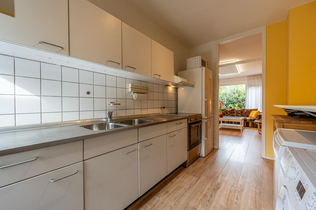 De nette keuken is doormiddel van een deur vanuit de woonkamer te bereiken en is ingericht met witte kleurstelling voor kasten en lades. Er is een mogelijkheid om de keuken open te maken en zo een leefkeuken te creëren. De boiler is inbegrepen, terwijl de overige apparaten door de verkoper worden meegenomen. Dit geeft je de vrijheid om je eigen persoonlijke stijl aan deze ruimte toe te voegen en deze aan te passen aan jouw wensen.