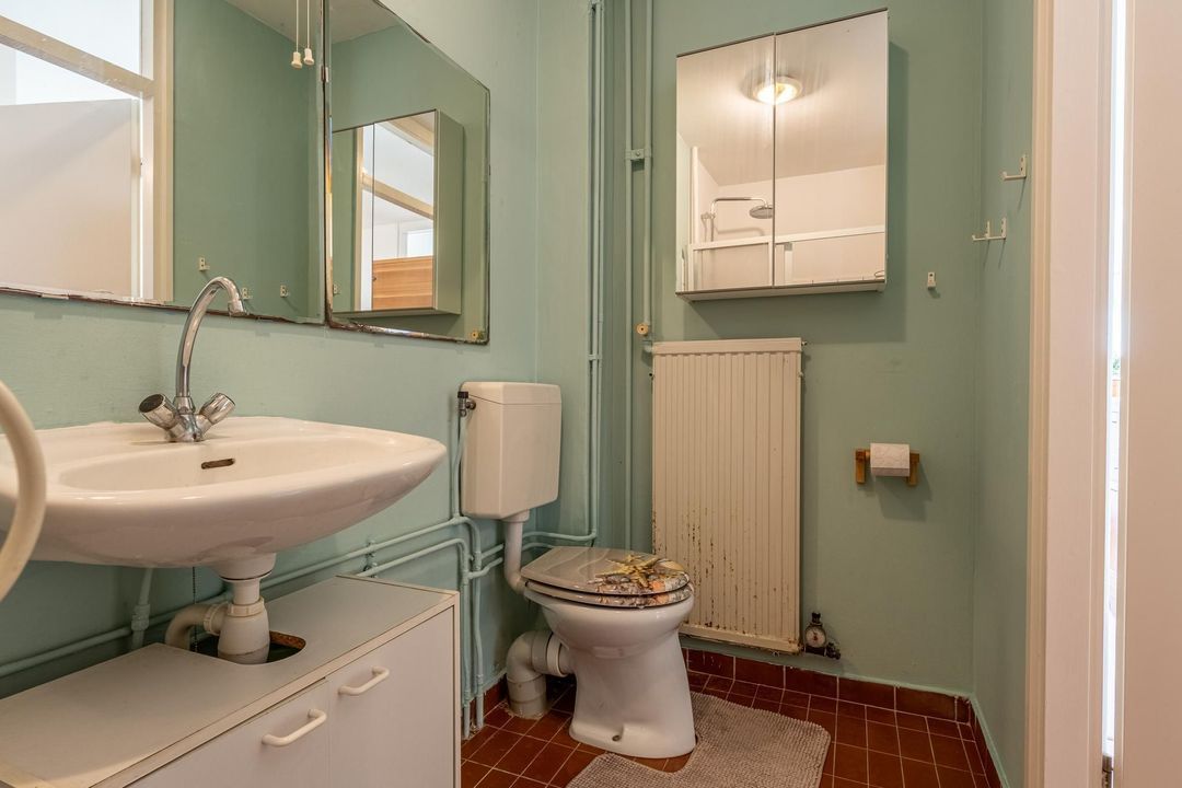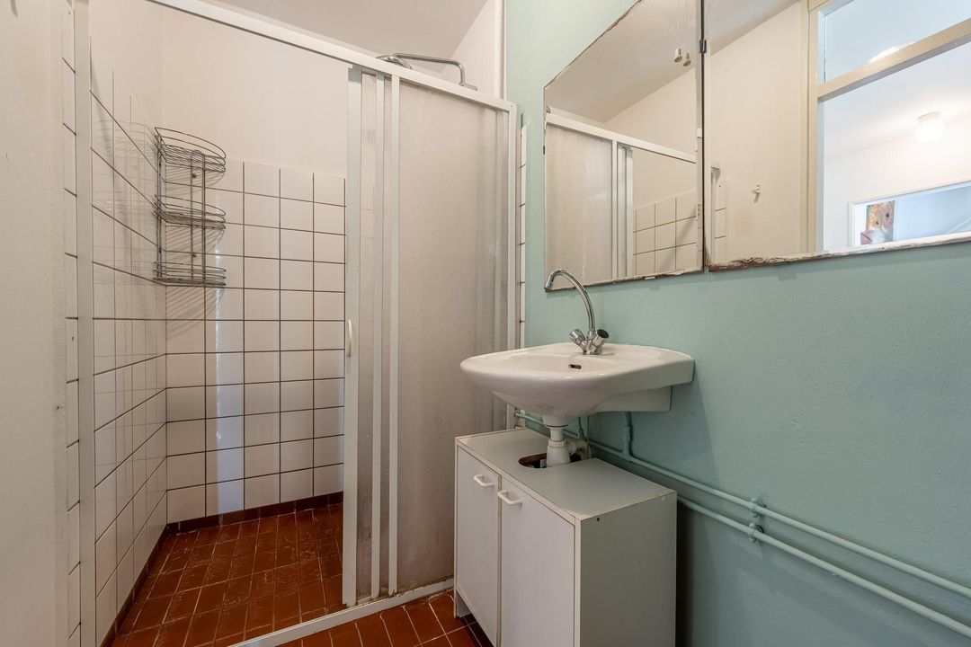 De badkamer is betegeld en biedt voorzieningen voor jouw dagelijkse comfort. Hier vind je een handige inloopdouche, een wastafel, een toilet en verwarming.