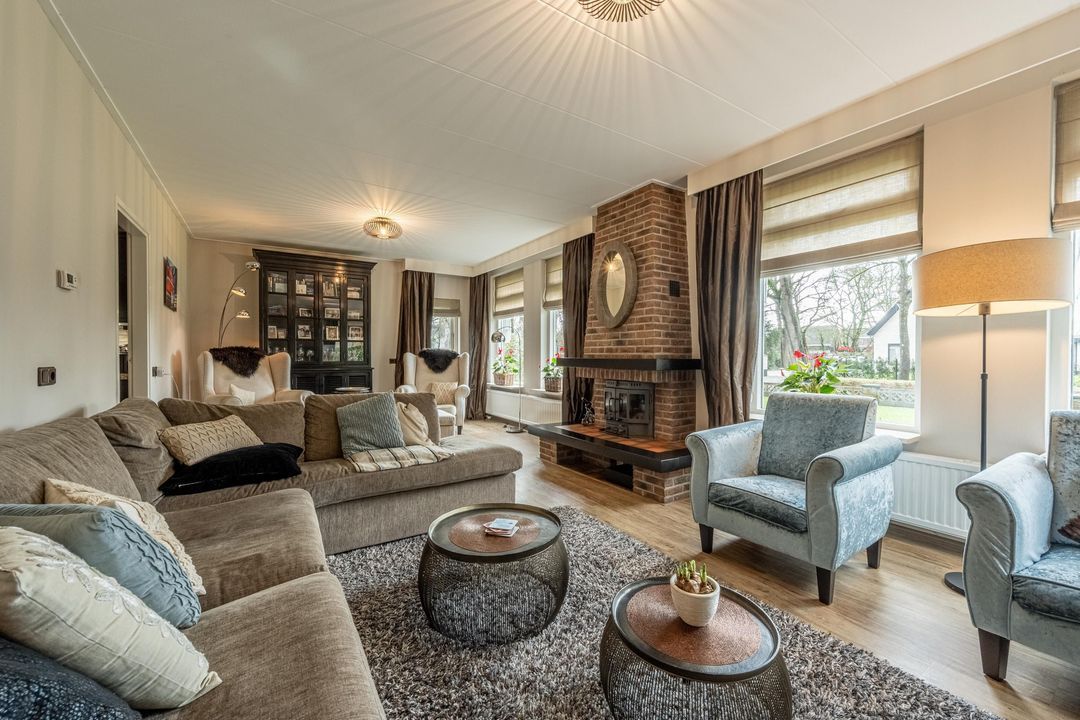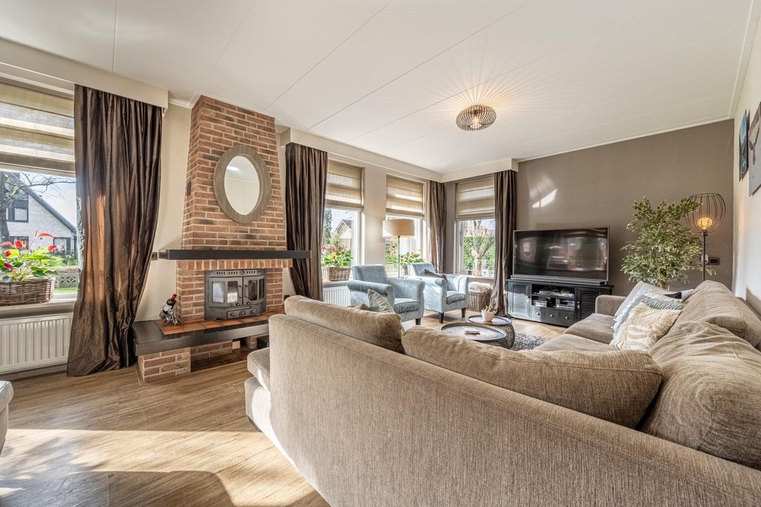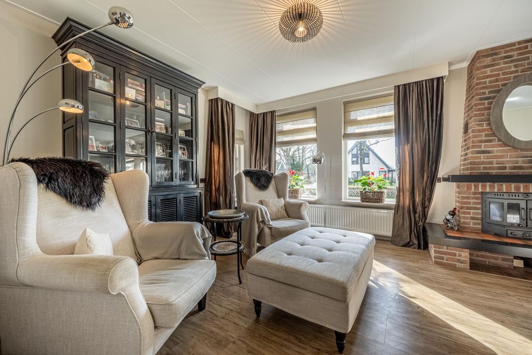 De begane grond biedt een ruime basis met diverse gebruiksmogelijkheden. De woonkamer met grote raampartijen en karakteristieke haard vormt het hart van het huis. De lichtinval en de maatvoering zorgen voor een prettige leefruimte die zich goed leent voor modernisering naar een eigentijdse woonstijl.