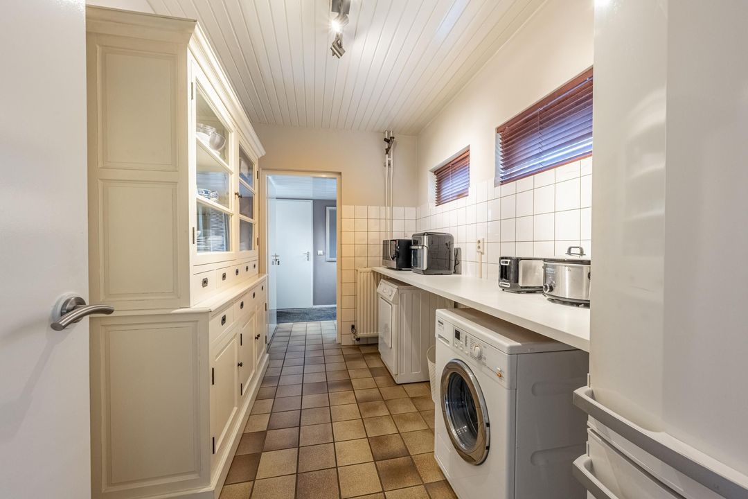 Op deze verdieping bevindt zich tevens de slaapkamer met en-suite badkamer. Deze ruimte kan uiteraard ook worden ingericht als werk- of hobbykamer. De bijkeuken biedt plaats aan wasapparatuur en extra bergruimte. Vanuit de hal is binnendoor toegang tot de garage, wat zorgt voor extra gemak in het dagelijks gebruik.