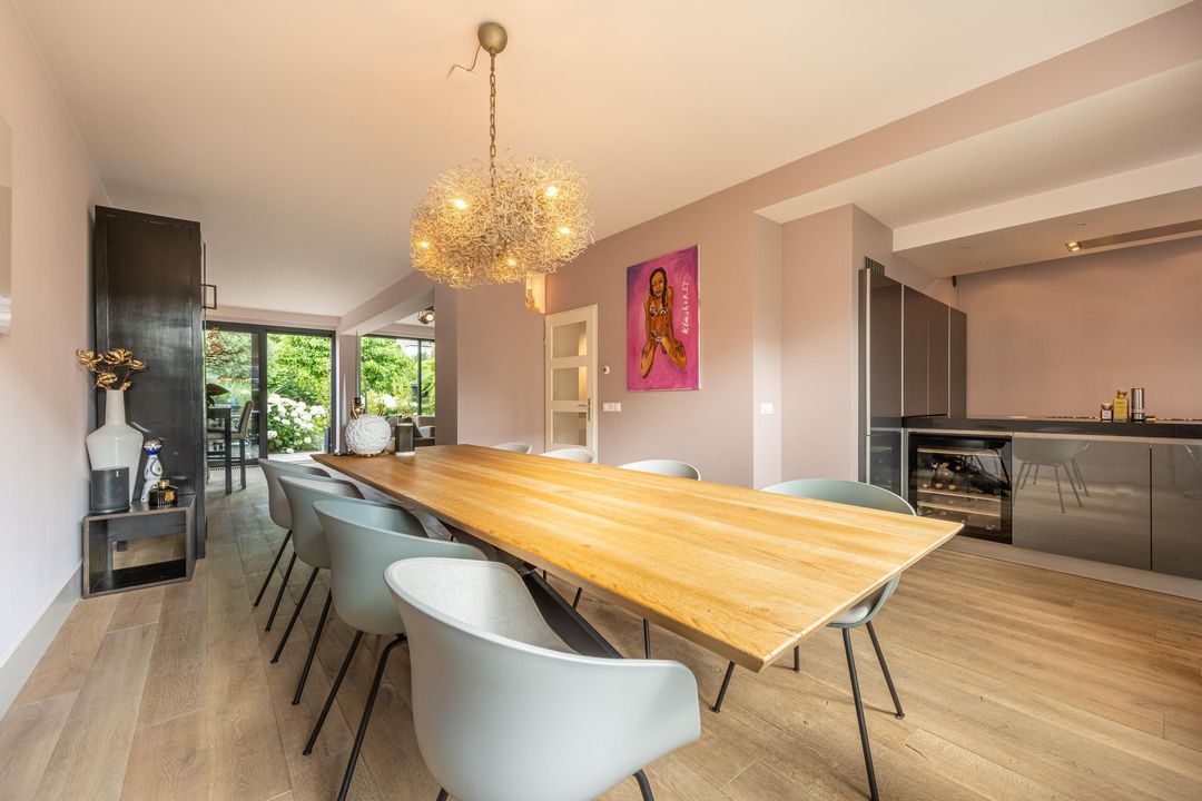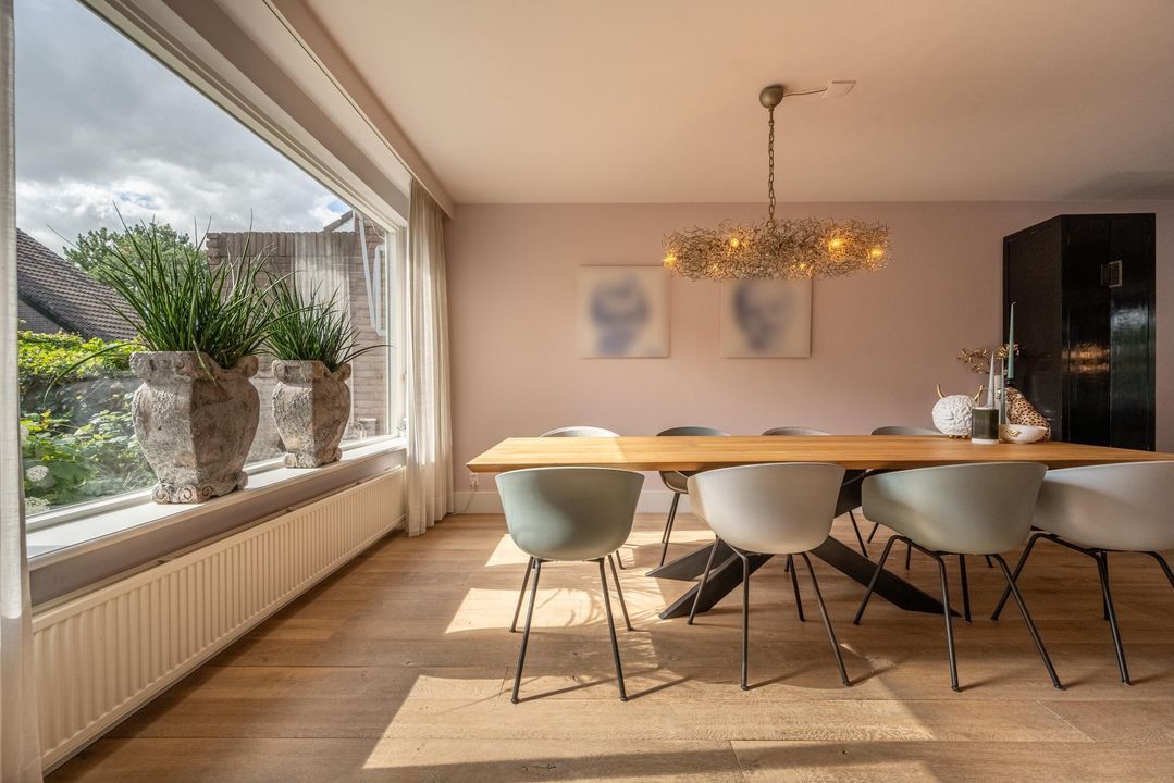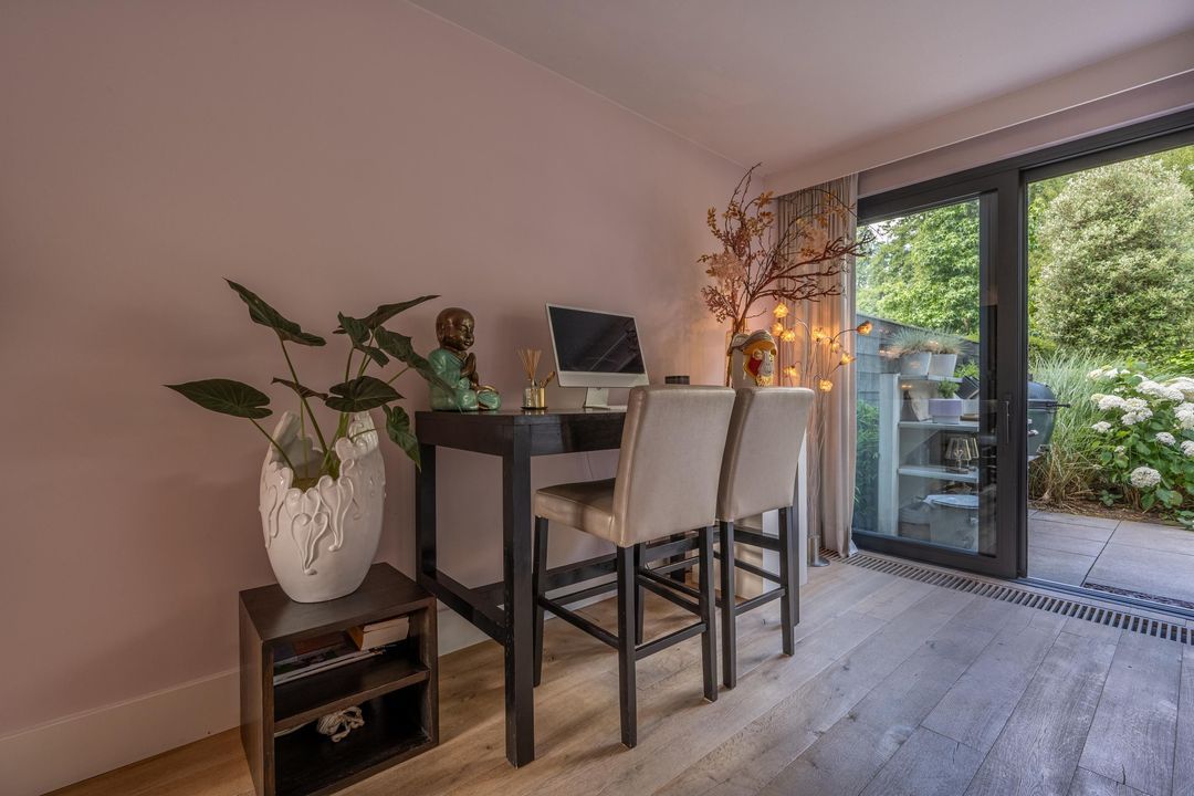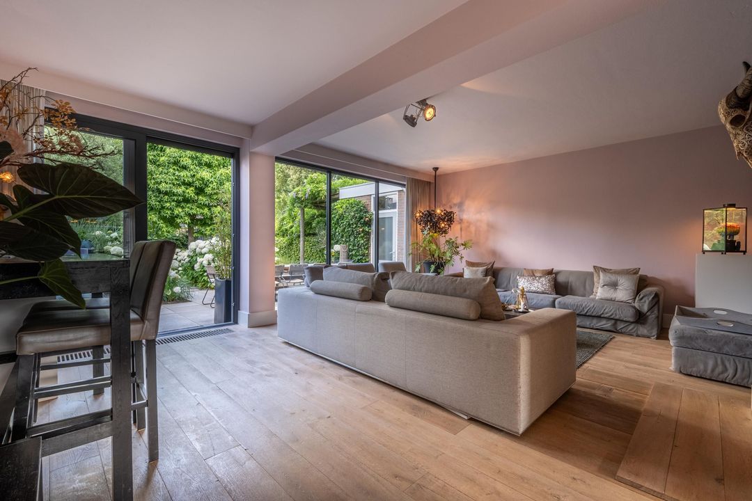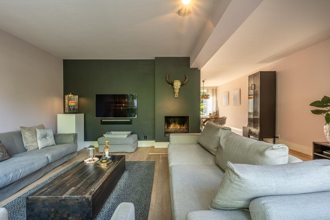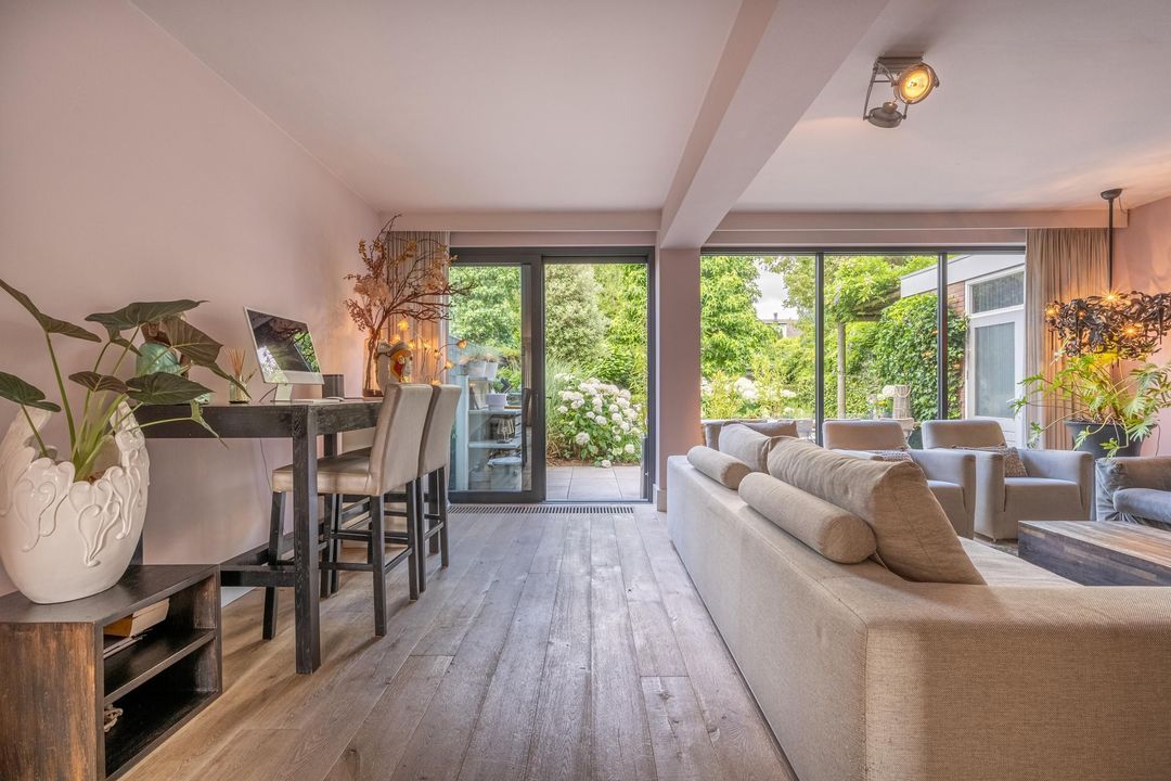 De begane grond is ingericht als een fijne leefverdieping met een ruime entree, vernieuwd toilet en een royale woonkamer. Aan de voorzijde staat de eettafel in open verbinding met de keuken. Elke maat eettafel past hier moeiteloos. Aan de achterzijde bevindt zich het grote zitgedeelte met sfeervolle open haard en zicht op de tuin. De achtergevel is in 2024 volledig vernieuwd en uitgevoerd in antraciet aluminium met een grote schuifpui naar de tuin. Ook het glas aan de voorzijde van de woning is recent vernieuwd. De woonkamer is afgewerkt met een massieve getrommelde eiken vloer en hoge plinten, wat zorgt voor een warme en luxe uitstraling.