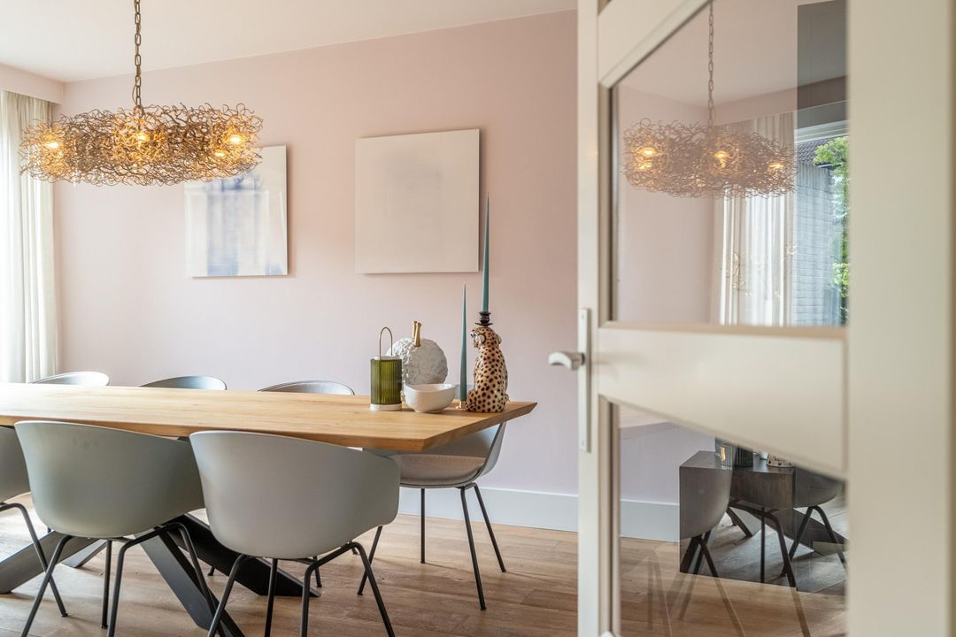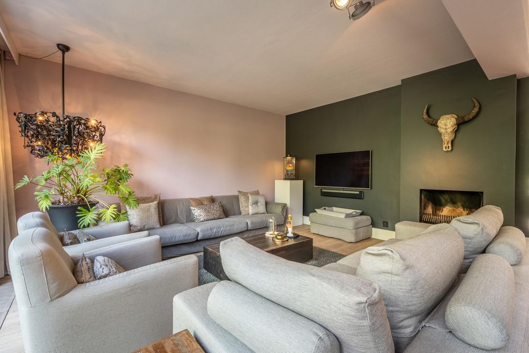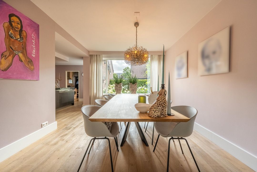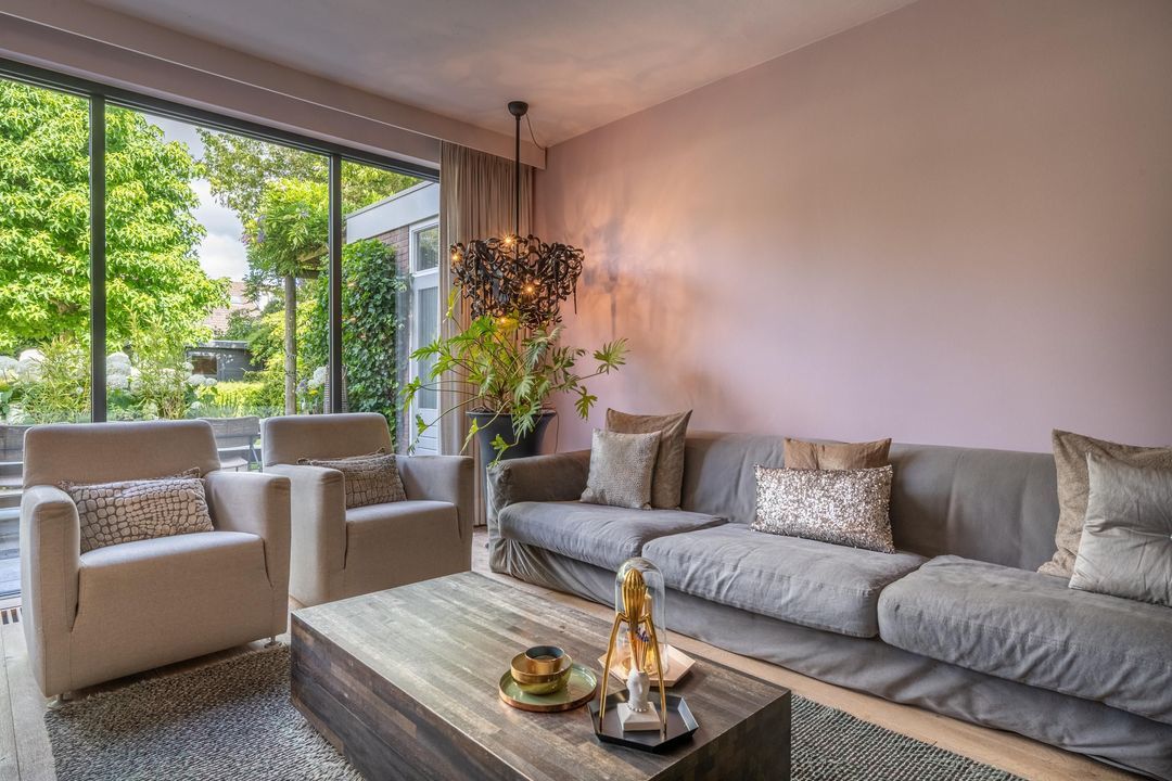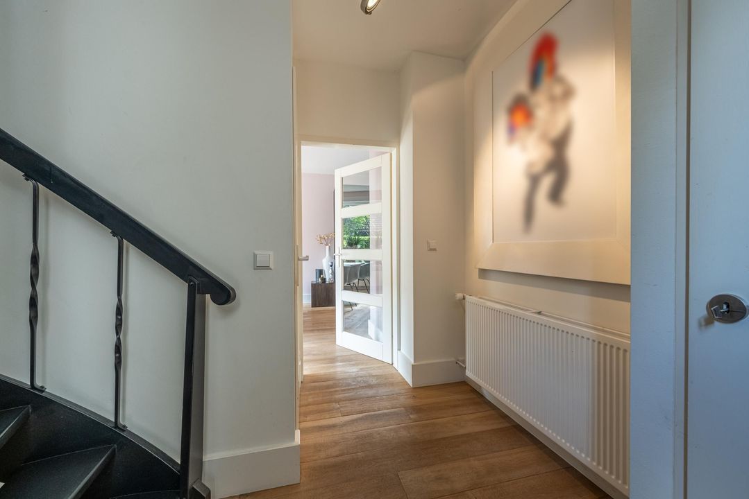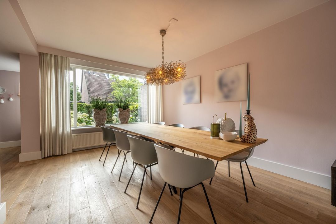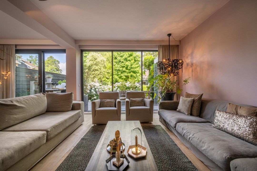 De begane grond is ingericht als een fijne leefverdieping met een ruime entree, vernieuwd toilet en een royale woonkamer. Aan de voorzijde staat de eettafel in open verbinding met de keuken. Elke maat eettafel past hier moeiteloos. Aan de achterzijde bevindt zich het grote zitgedeelte met sfeervolle open haard en zicht op de tuin. De achtergevel is in 2024 volledig vernieuwd en uitgevoerd in antraciet aluminium met een grote schuifpui naar de tuin. Ook het glas aan de voorzijde van de woning is recent vernieuwd. De woonkamer is afgewerkt met een massieve getrommelde eiken vloer en hoge plinten, wat zorgt voor een warme en luxe uitstraling.