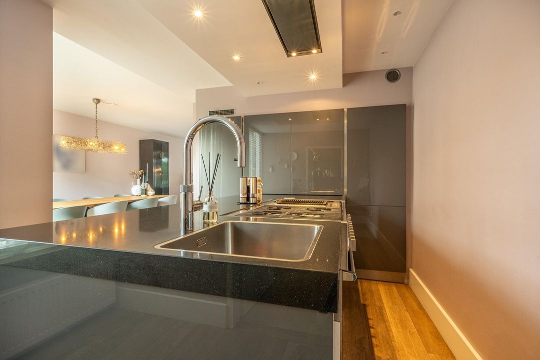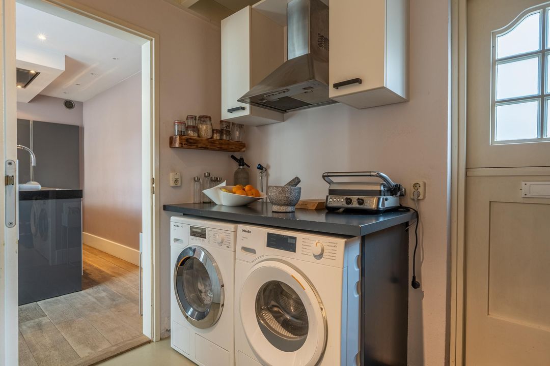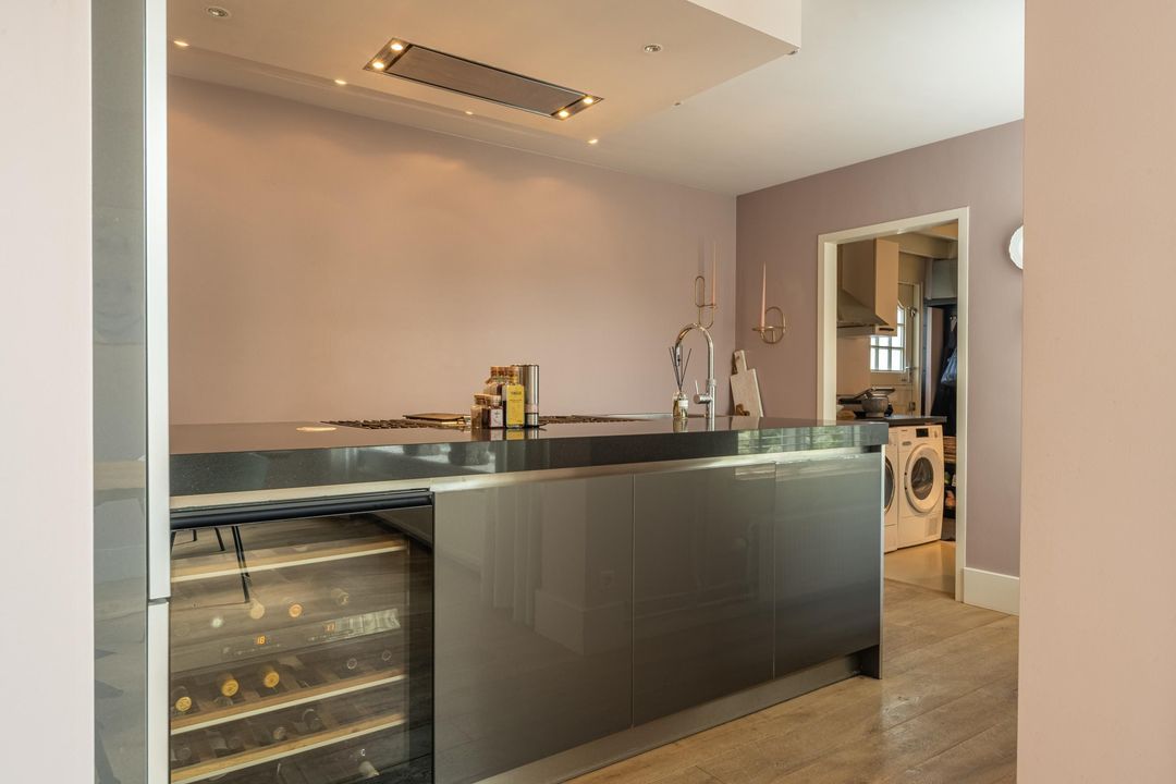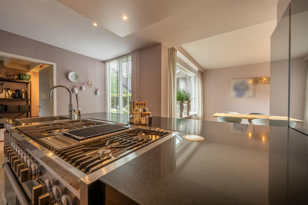 De keuken is uitgevoerd met een groot kookeiland en voorzien van hoogwaardige apparatuur: een Quooker (ook voor bruisend water), een 6-pits RVS gasfornuis met interne BBQ, twee ovens, een koel-vriescombinatie, vaatwasser en een wijnklimaatkast. De keuken is uitgevoerd in hoogglans antracietgrijs met een grijs composiet werkblad. Aangrenzend ligt de praktische bijkeuken met gietvloer, vaste kasten en opstelplaats voor wasmachine en droger. Vanuit hier is er een directe deur naar de voorzijde van de woning, die in de praktijk het meest wordt gebruikt. Ook bevindt zich hier een extra koel- en vrieskast en een afzuigkap. Boven de bijkeuken is nog een vliering aanwezig.