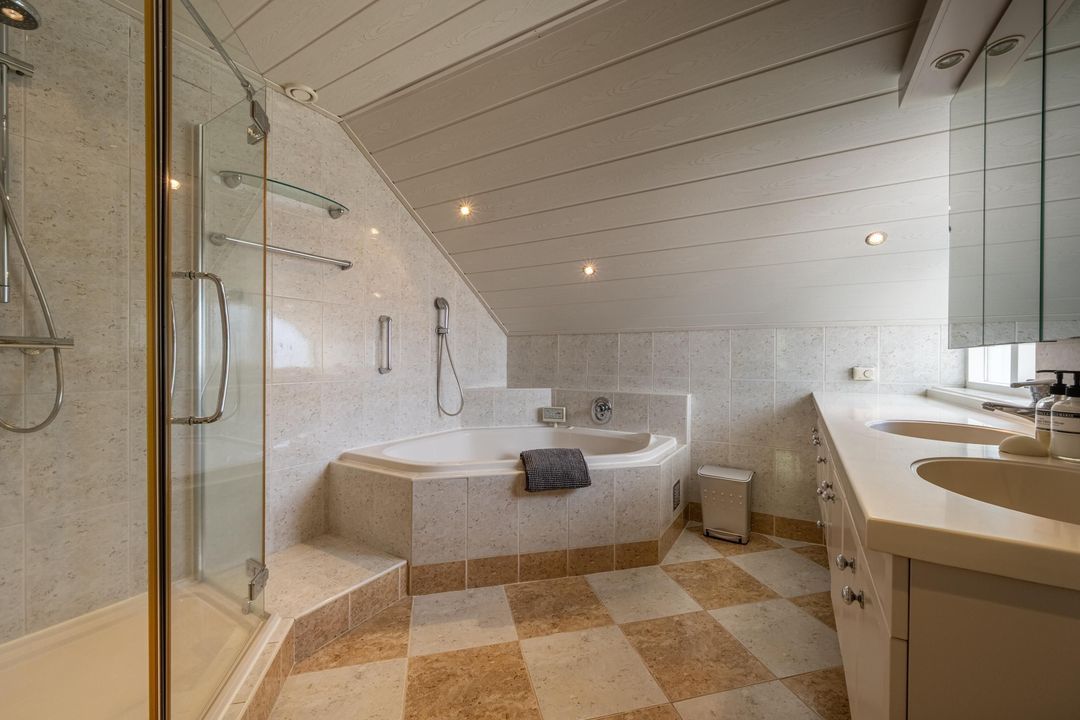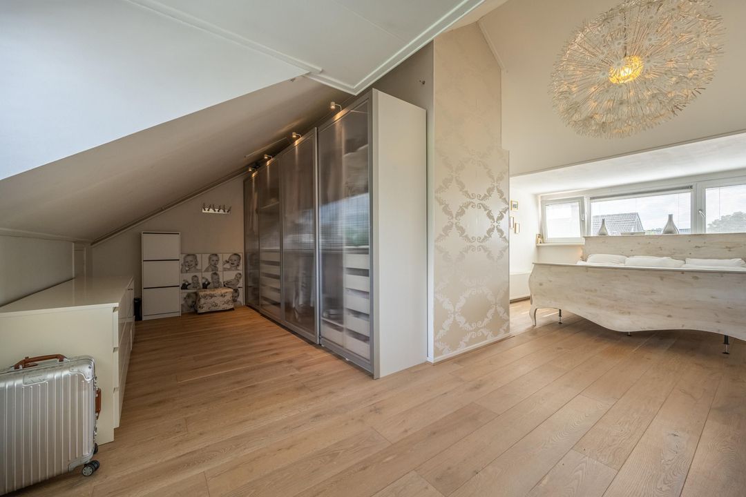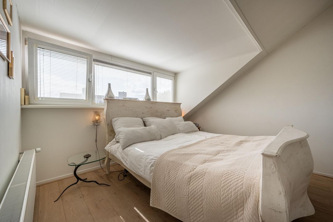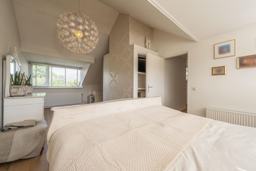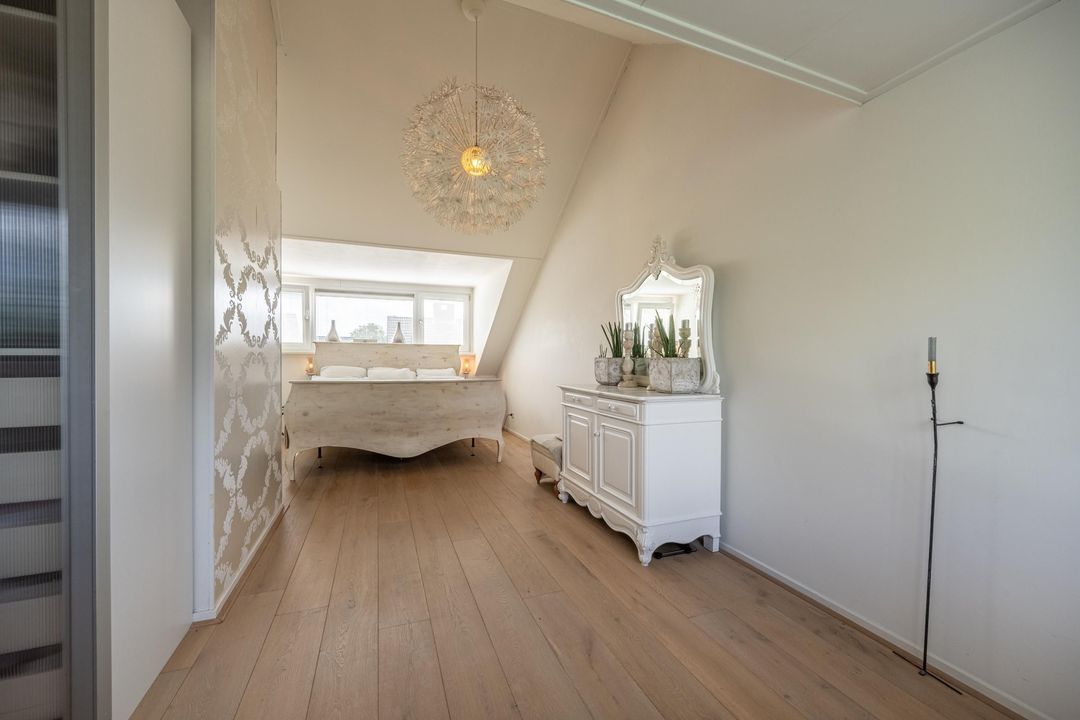 Op de eerste verdieping is een zeer riante overloop met toegang tot drie grote slaapkamers en een ruime badkamer. De slaapkamers en overloop zijn voorzien van eiken lamelparket. Eén van de slaapkamers beschikt over een balkon. De badkamer is compleet uitgevoerd met ligbad, douche en dubbele wastafel. Daarnaast is er op deze verdieping een separaat toilet. De tweede verdieping is ingericht als royale oudersuite. Hier bevindt zich een grote L-vormige slaapkamer met twee dakkapellen en een prettige nokhoogte. De korte zijde van de L-vorm biedt uitzonderlijk veel kastruimte. Aangrenzend is een recent gerealiseerde tweede badkamer in open verbinding met de overloop, voorzien van inloopdouche, toilet en design wastafel, uitgevoerd in een lichte grijstint. Via de overloop is tevens een grote berging bereikbaar met de nieuwe Remeha cv-ketel (2026) en de mechanische ventilatie.