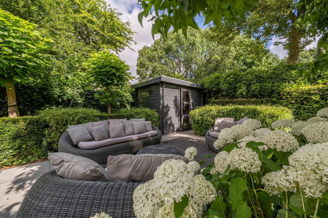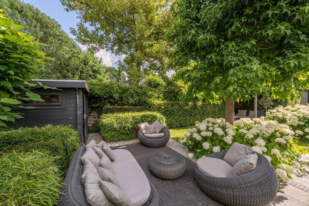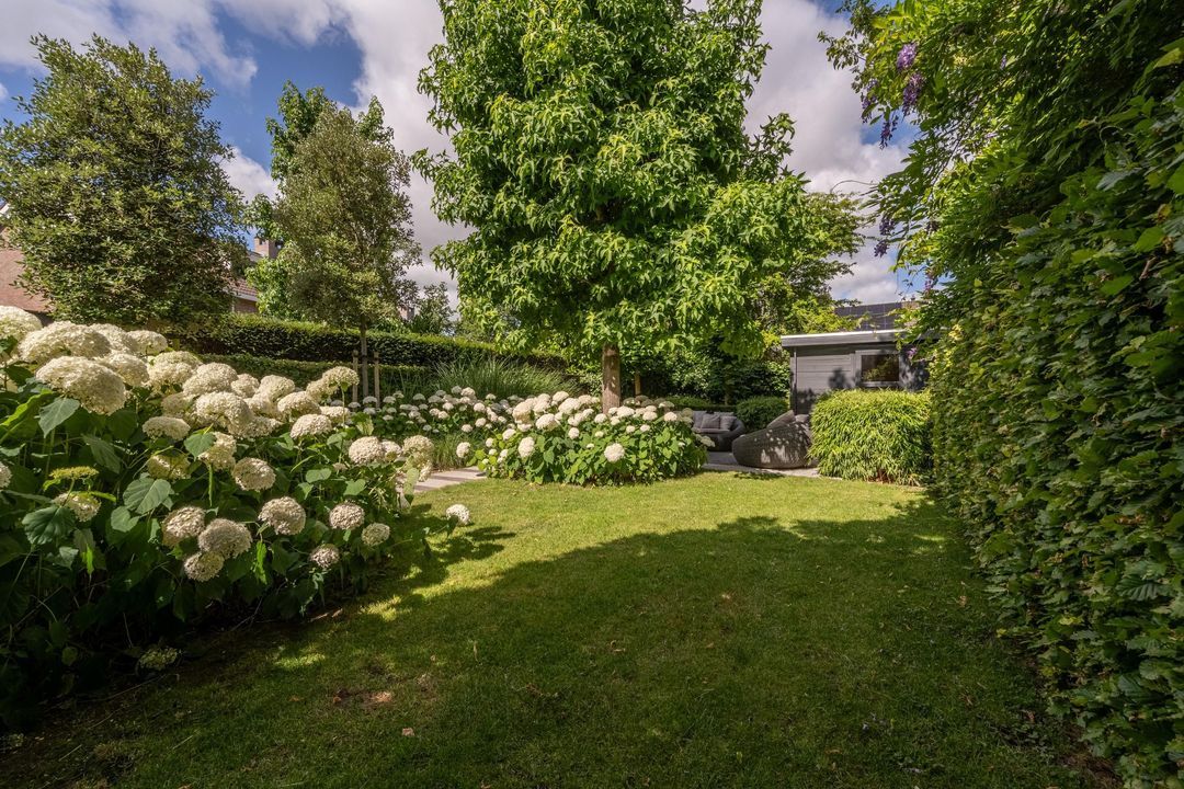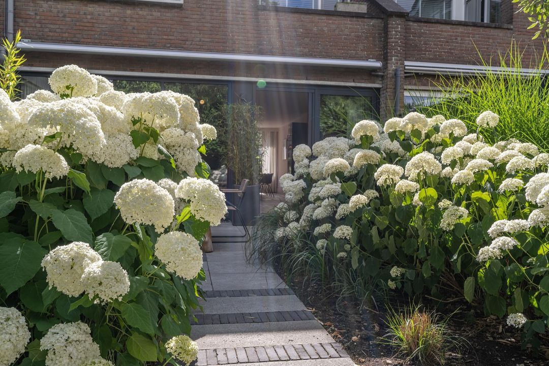 De achtertuin is fraai aangelegd, zeer verzorgd en rijk beplant met onder andere prachtige witte hortensia’s. Er zijn meerdere terrassen, een pergola, een zonnescherm en een vrijstaand schuurtje. Door de ligging aan de groenstrook voelt de tuin vrij en beschut aan. In de zomer is het hier in alle rust genieten van zon en groen.