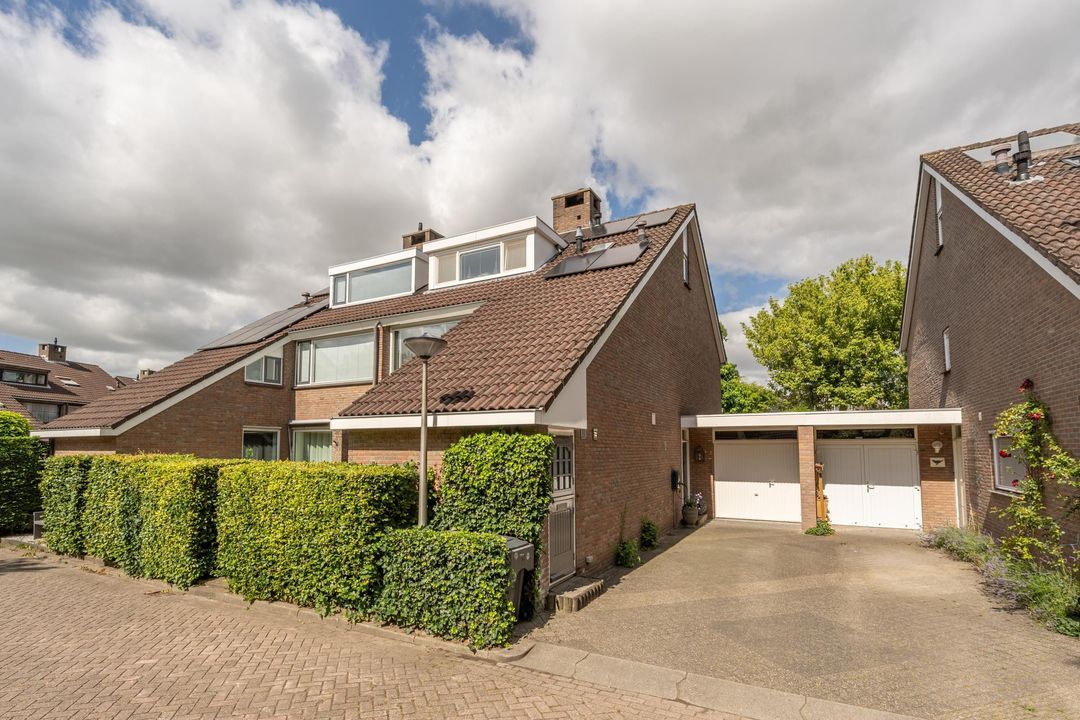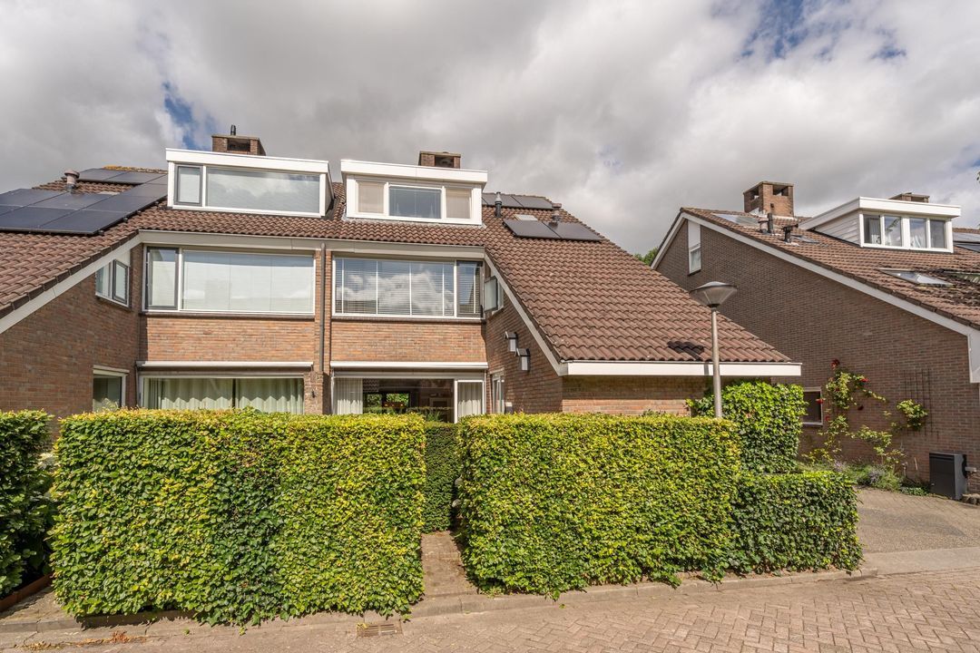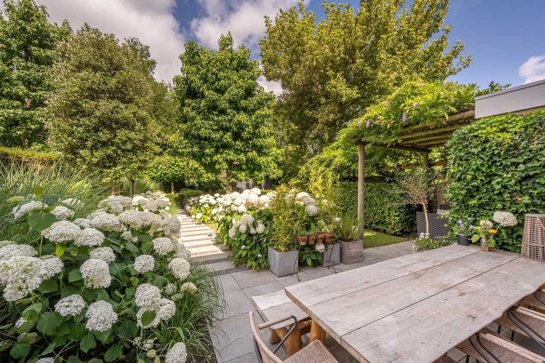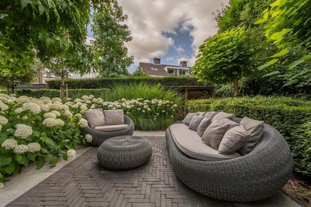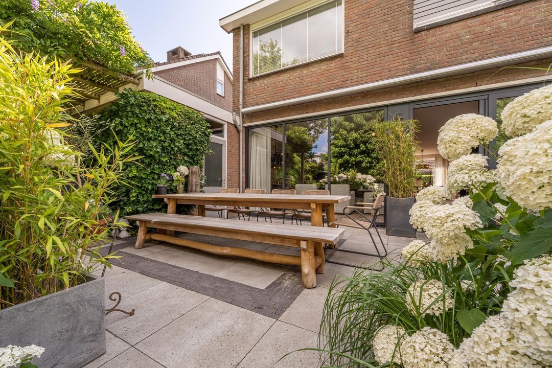 De achtertuin is fraai aangelegd, zeer verzorgd en rijk beplant met onder andere prachtige witte hortensia’s. Er zijn meerdere terrassen, een pergola, een zonnescherm en een vrijstaand schuurtje. Door de ligging aan de groenstrook voelt de tuin vrij en beschut aan. In de zomer is het hier in alle rust genieten van zon en groen.