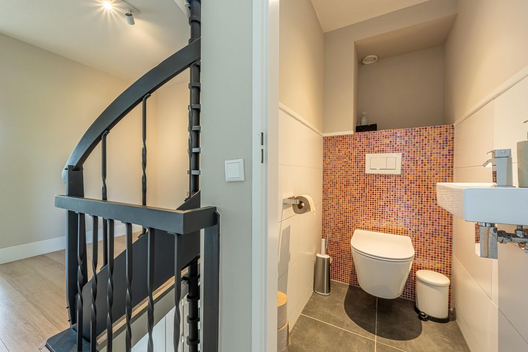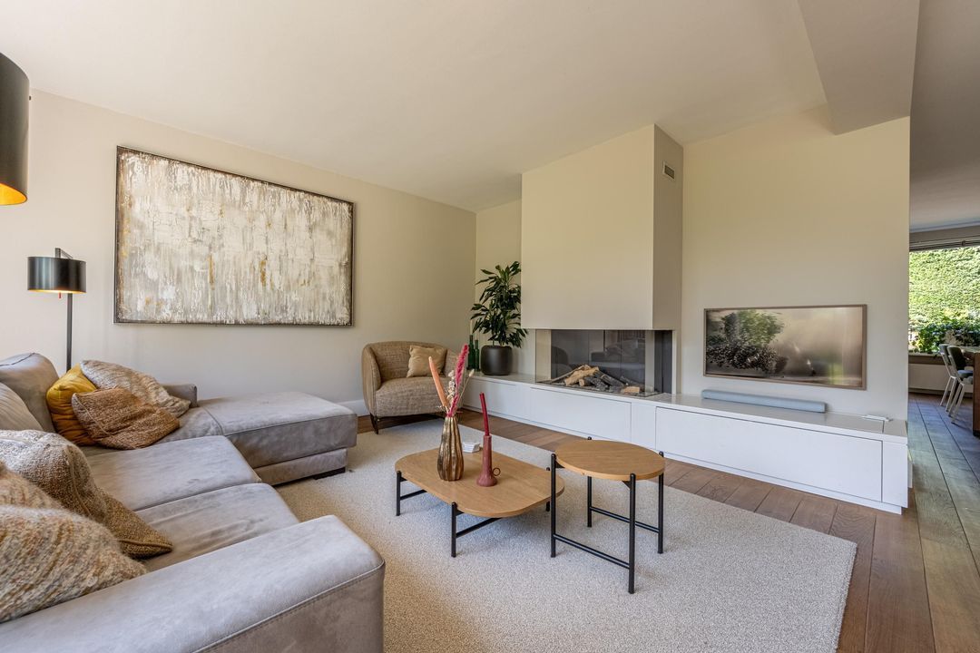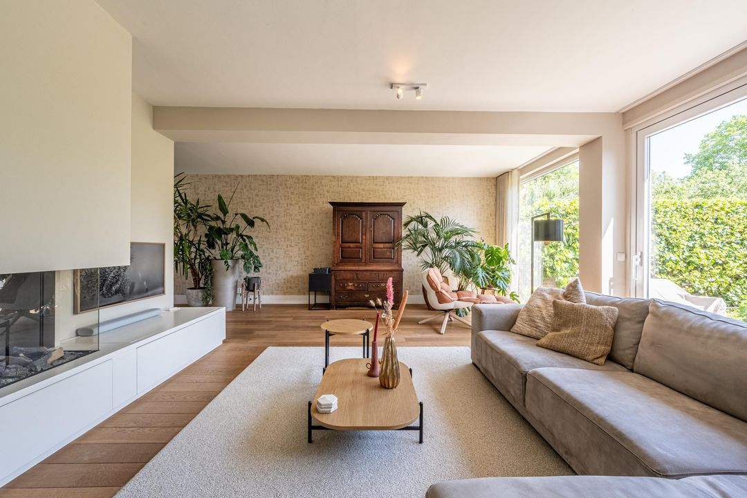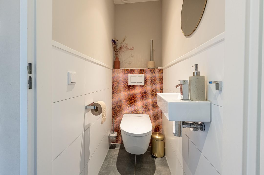 Binnenkomst in de entreehal met garderobe, meterkast, een moderne toiletruimte en de trapopgang naar boven. Vanuit de hal is de royale woonkamer toegankelijk, ingedeeld met een ruime zithoek aan de achterzijde. Grote raampartijen zorgen hier voor een zee van licht en uitzicht op de tuin. De moderne gashaard is het hart van de zithoek en zorgt voor een sfeervolle uitstraling. De schuifpui geeft toegang tot de tuin en creëert een perfecte verbinding tussen binnen en buiten.