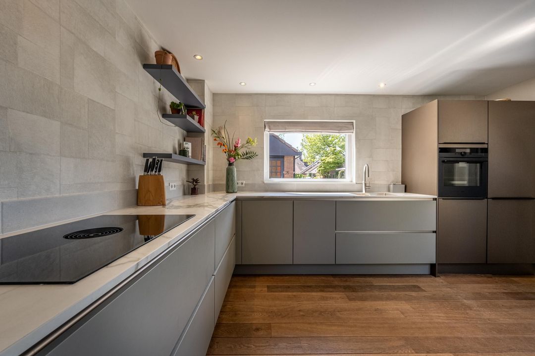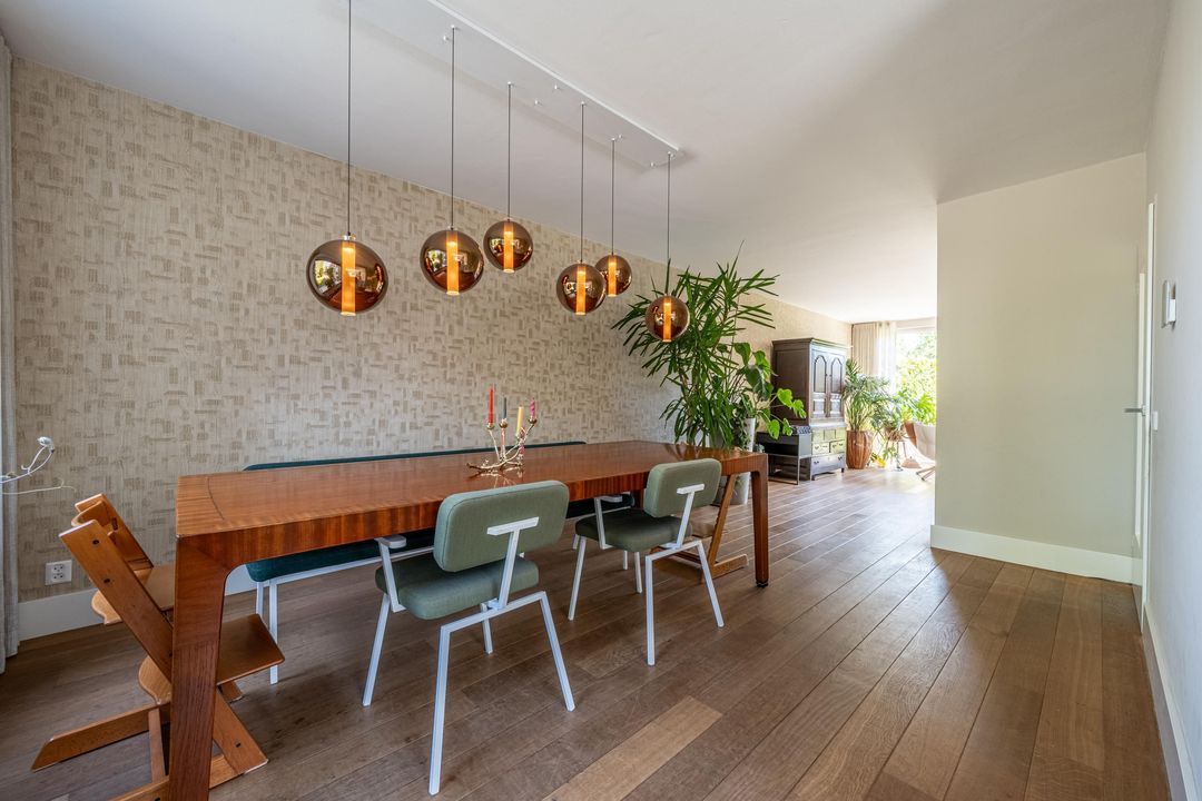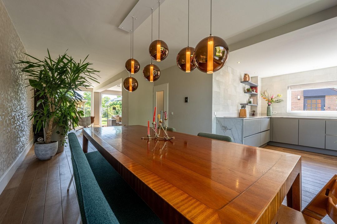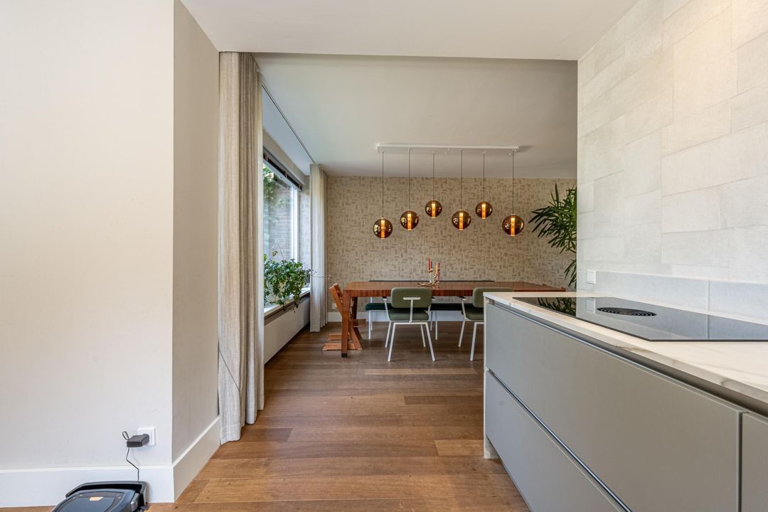 De woning profiteert van een uitzonderlijk rustige ligging aan het einde van een doodlopende straat: stilte en privacy gegarandeerd! Aan deze zijde is de royale eethoek gesitueerd met ruimte voor een grote gezinstafel. Aansluitend vind je de open keuken, compleet met Bora inductiekookplaat met geïntegreerde afzuigkap, stoomoven, extra grote koelkast, vaatwasser en Quooker. De naastgelegen bijkeuken herbergt een grote vriezer en extra opbergruimte. Daarnaast is er een vliering en zijn er praktisch inbouwkasten voor bijvoorbeeld schoenen en jassen. Vanuit de bijkeuken is de voortuin direct toegankelijk.