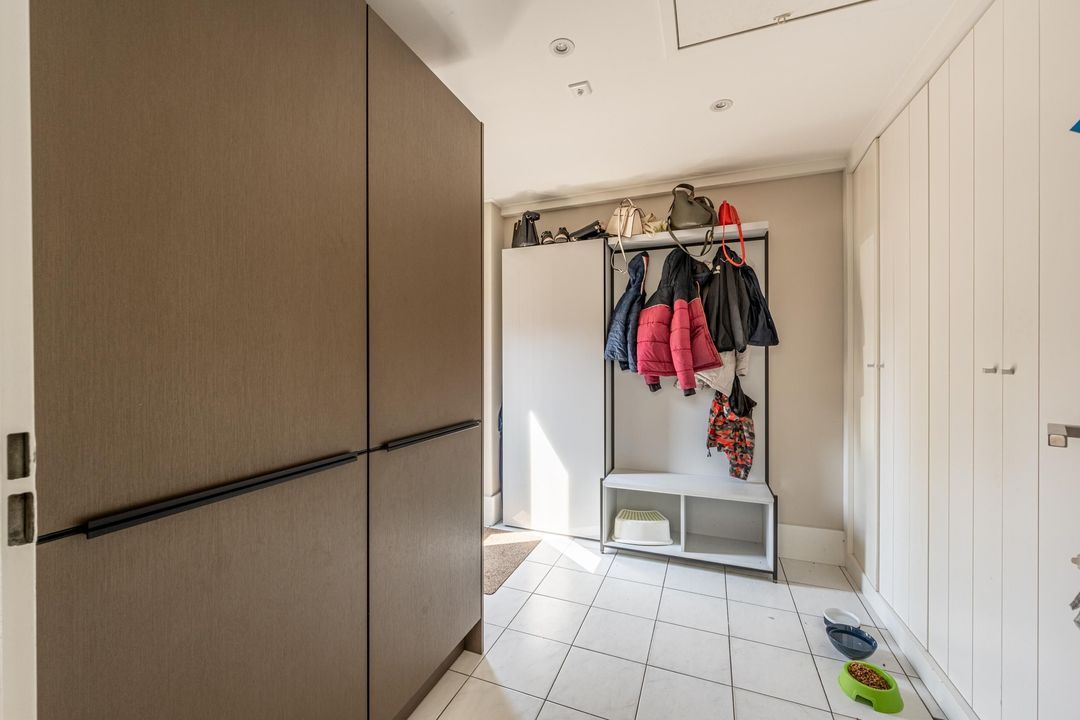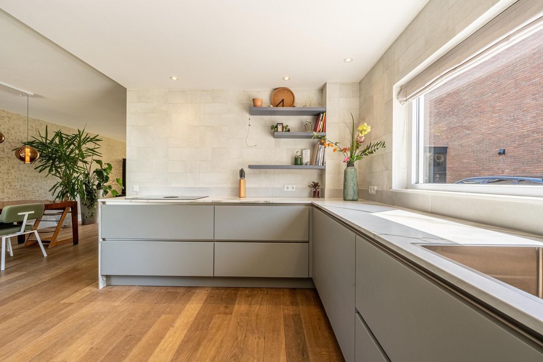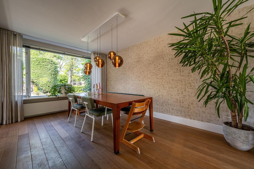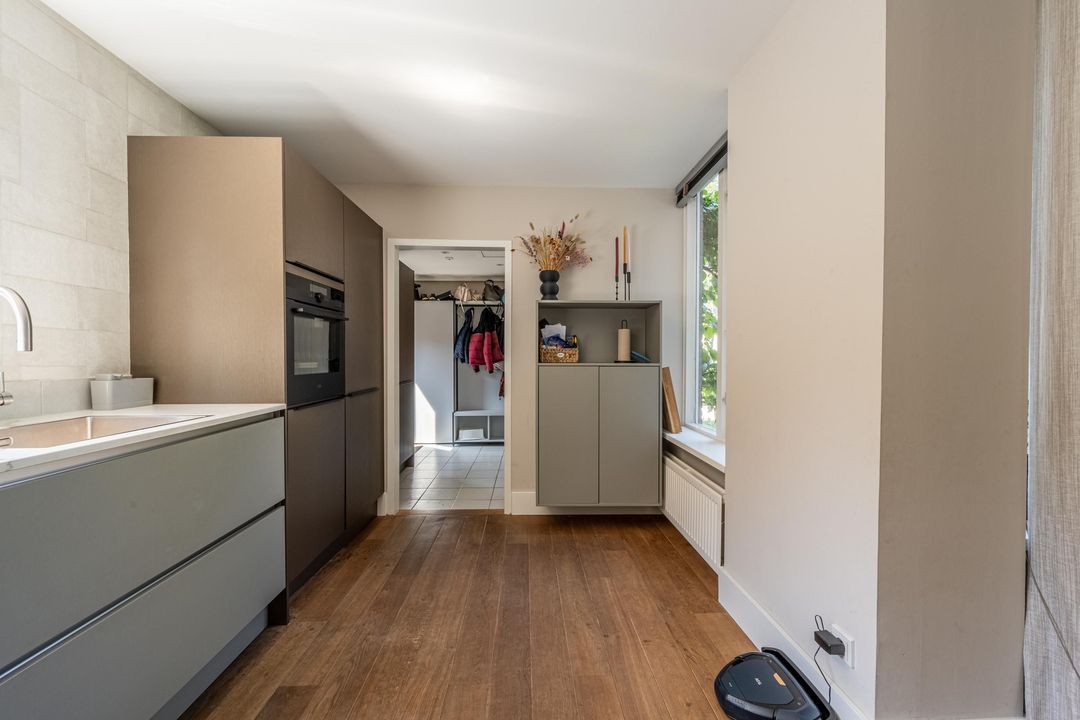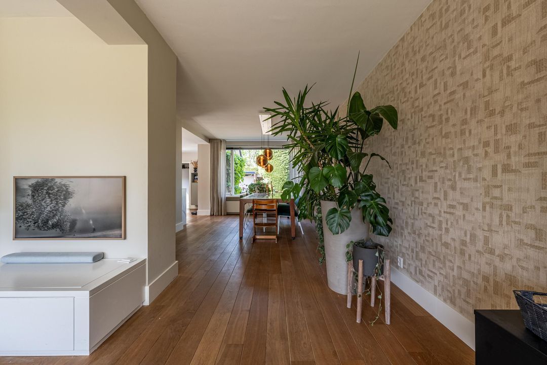 De woning profiteert van een uitzonderlijk rustige ligging aan het einde van een doodlopende straat: stilte en privacy gegarandeerd! Aan deze zijde is de royale eethoek gesitueerd met ruimte voor een grote gezinstafel. Aansluitend vind je de open keuken, compleet met Bora inductiekookplaat met geïntegreerde afzuigkap, stoomoven, extra grote koelkast, vaatwasser en Quooker. De naastgelegen bijkeuken herbergt een grote vriezer en extra opbergruimte. Daarnaast is er een vliering en zijn er praktisch inbouwkasten voor bijvoorbeeld schoenen en jassen. Vanuit de bijkeuken is de voortuin direct toegankelijk.