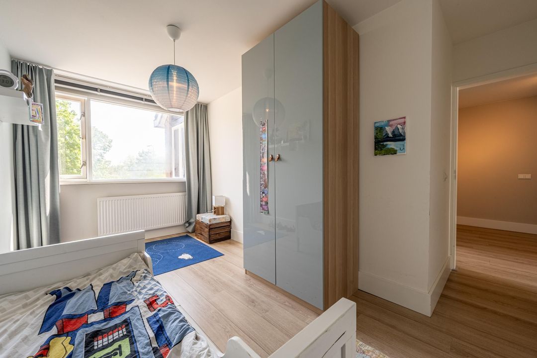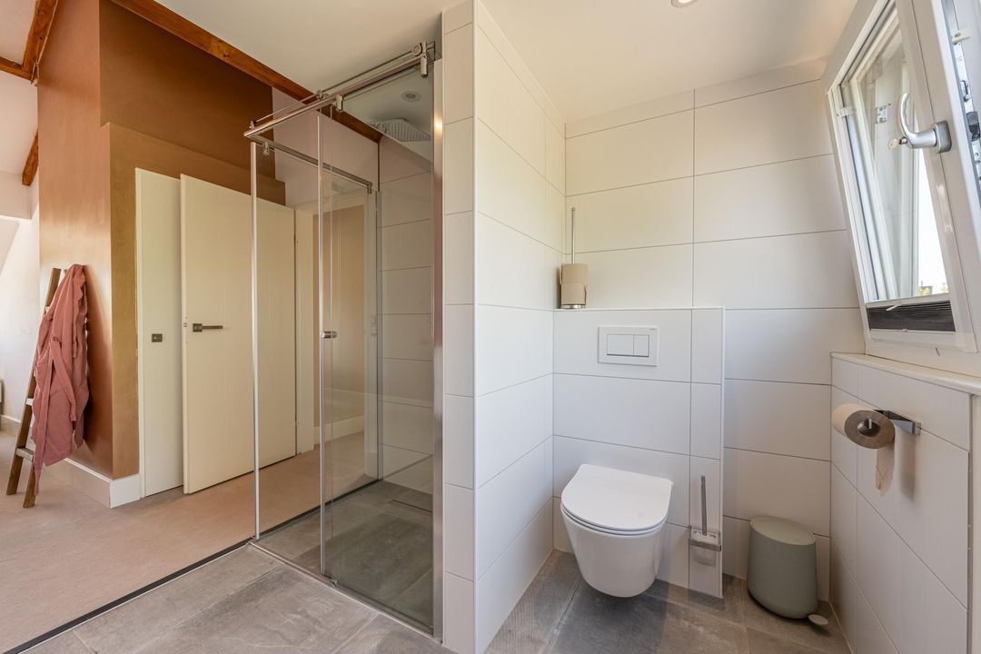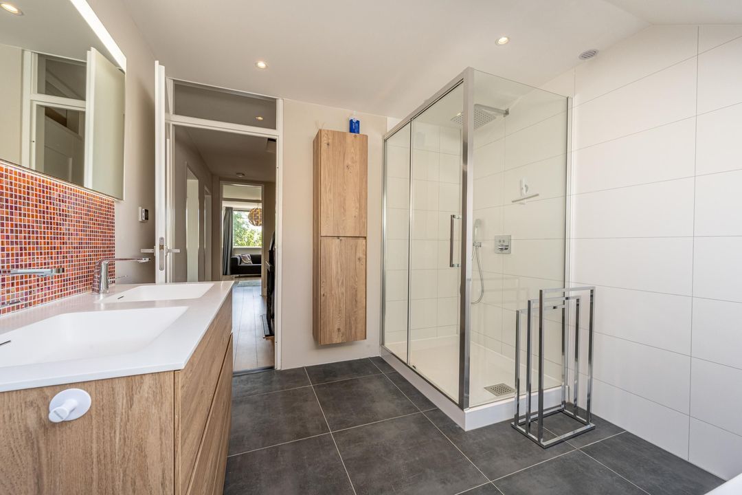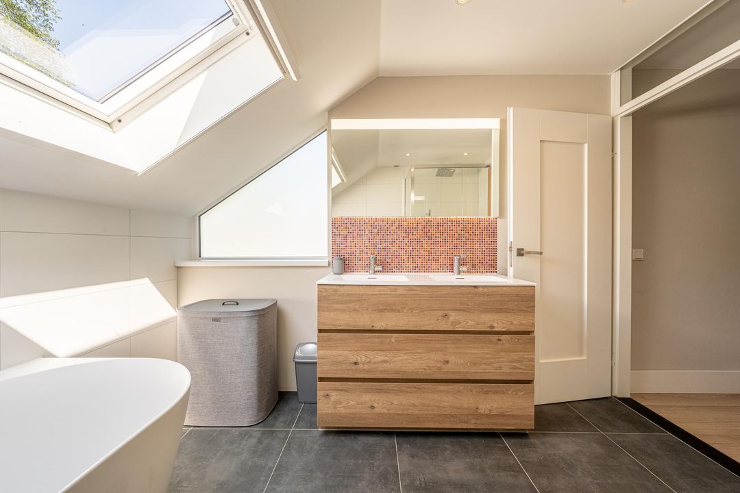 Op de eerste verdieping bevinden zich drie ruime slaapkamers, elk met voldoende lichtinval en een praktische indeling. De grootste slaapkamer is aan de voorzijde gelegen en beschikt over een balkon. Twee van de kamers zijn voorzien van een vaste kastenwand. De moderne badkamer is uitgerust met een ligbad, riante douche met regendouchekop, dubbel wastafelmeubel en een handdoekenkast. Daarnaast is er een separate toiletruimte, toegankelijk vanuit de ruime overloop.