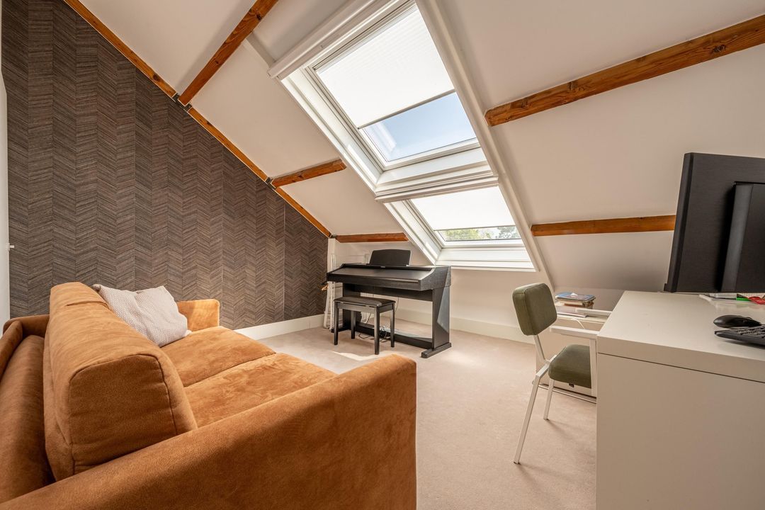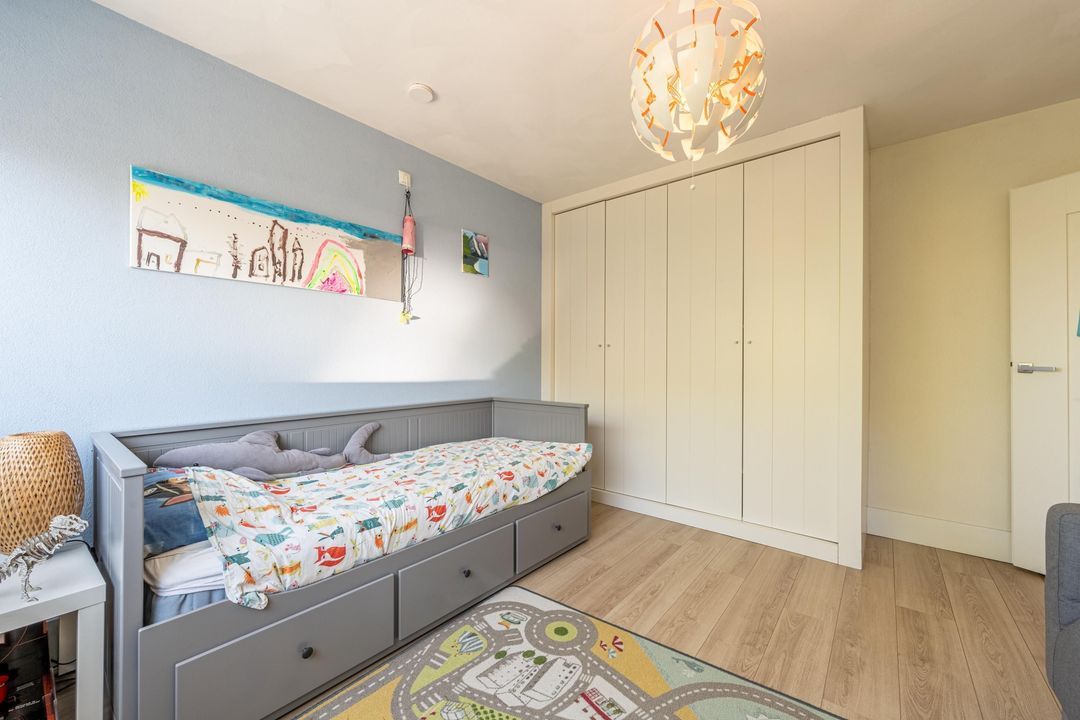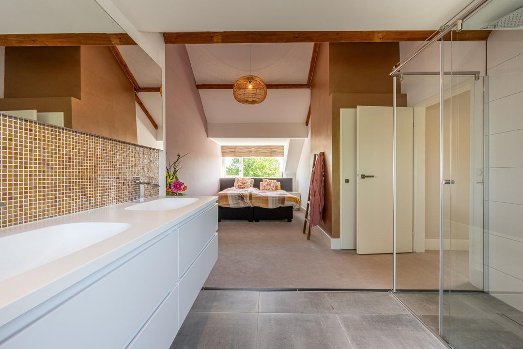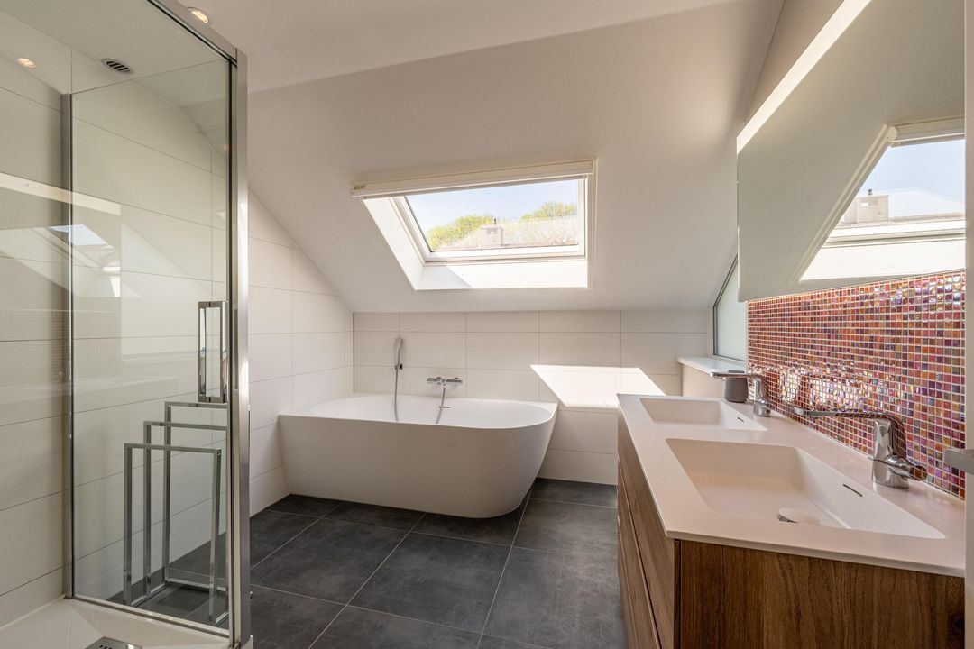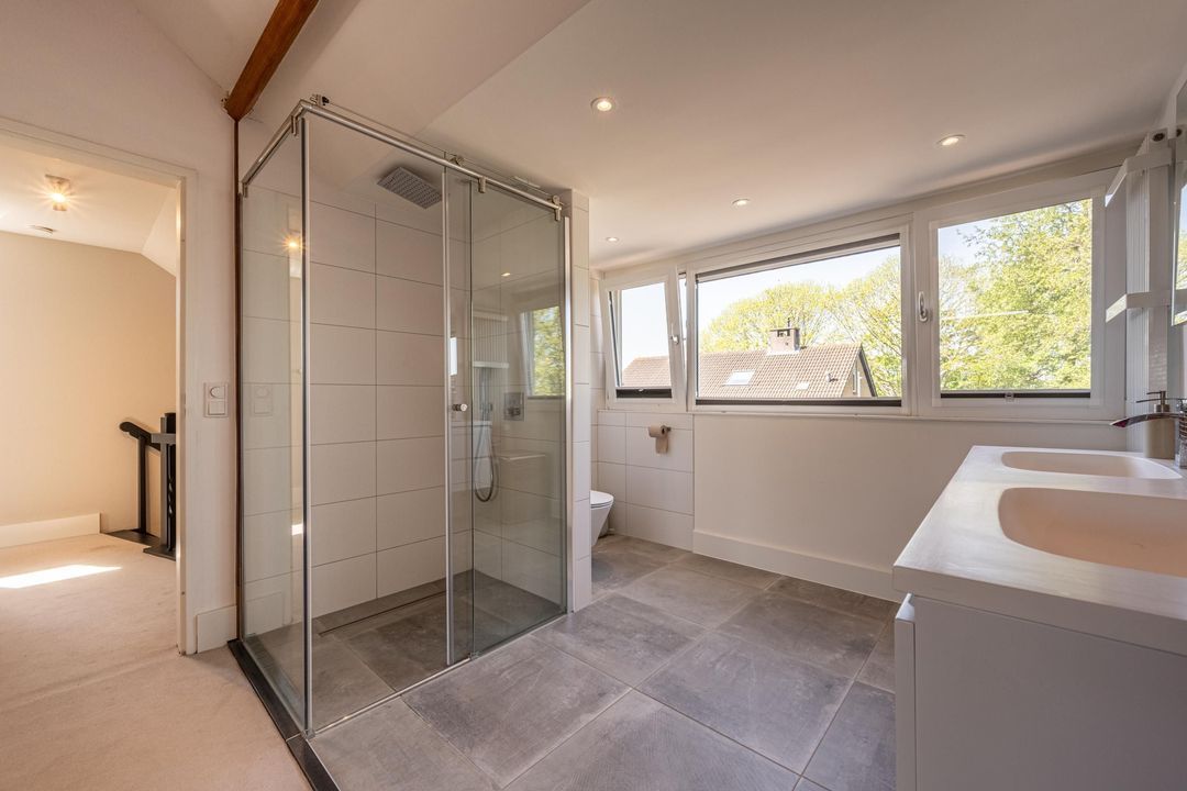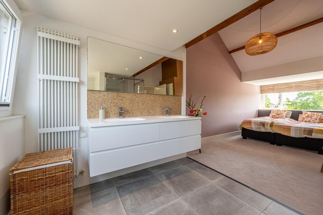 De tweede verdieping biedt nóg meer ruimte. De overloop herbergt een berging met cv-ketel en de wasmachine- en drogeropstelling. Daarnaast zijn er knieschotten voor extra opbergruimte en is er toegang tot nog eens twee slaapkamers. De master bedroom is van zeer riante formaat door de dubbele dakkapel aan weerszijde en heeft als kers op de taart een en-suite badkamer, compleet met inloopdouche, dubbel wastafelmeubel en toilet. Ideaal voor grote gezinnen of logés.