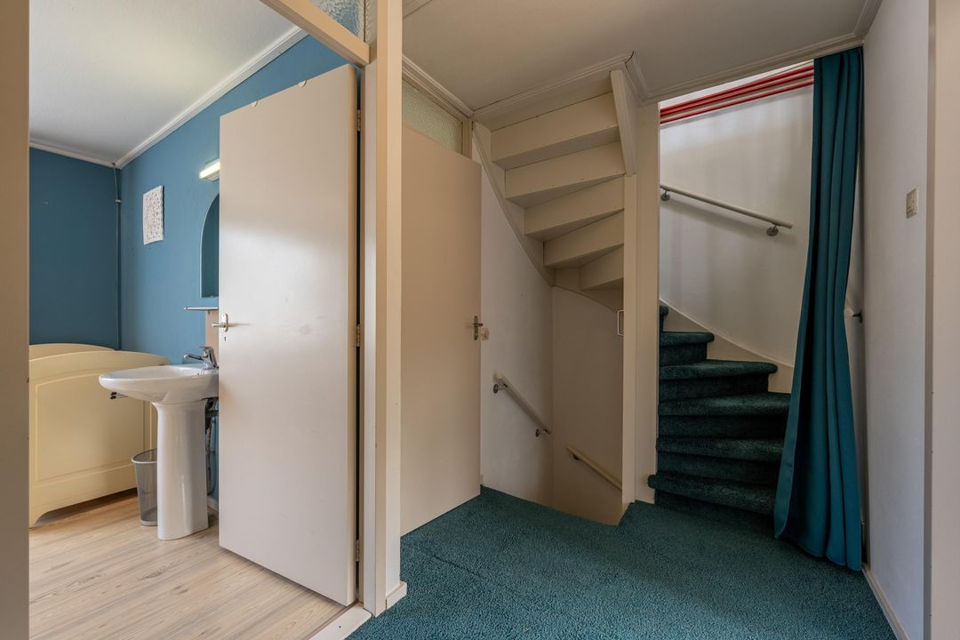 Via de hal heb je toegang tot de trapkast, het toilet, de meterkast en de woonkamer. Het toilet is uitgevoerd met beige wand- en vloertegels, een wastafel en ventilatie.