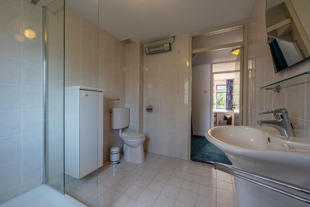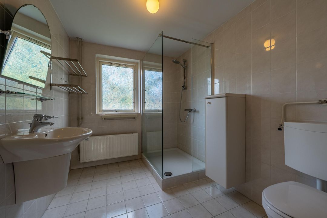 De badkamer is uitgevoerd met wit-beige tegelwerk en beschikt over een inloopdouche, wastafel, toilet, ventilatie en een radiator.