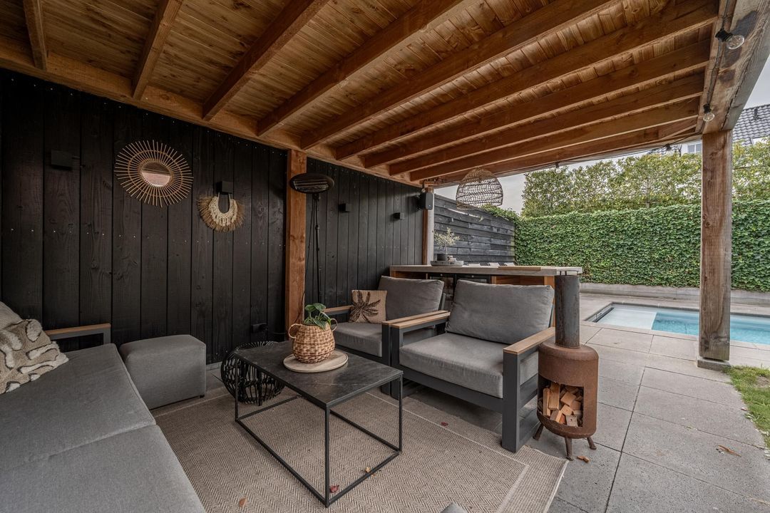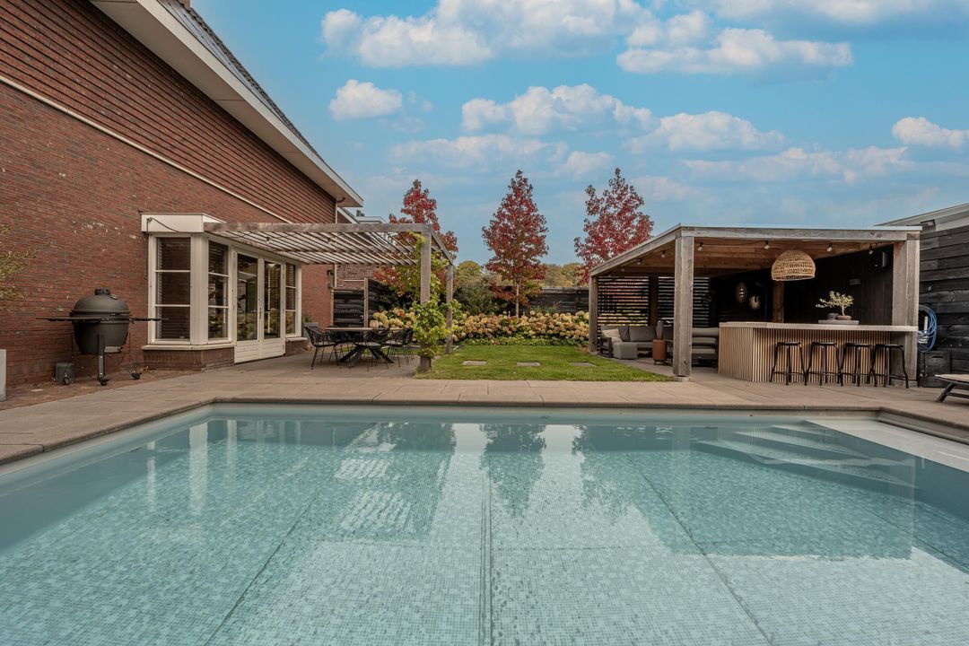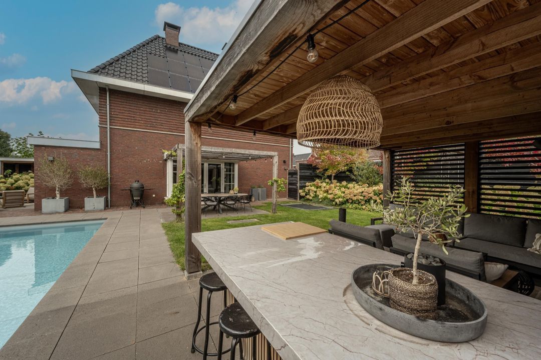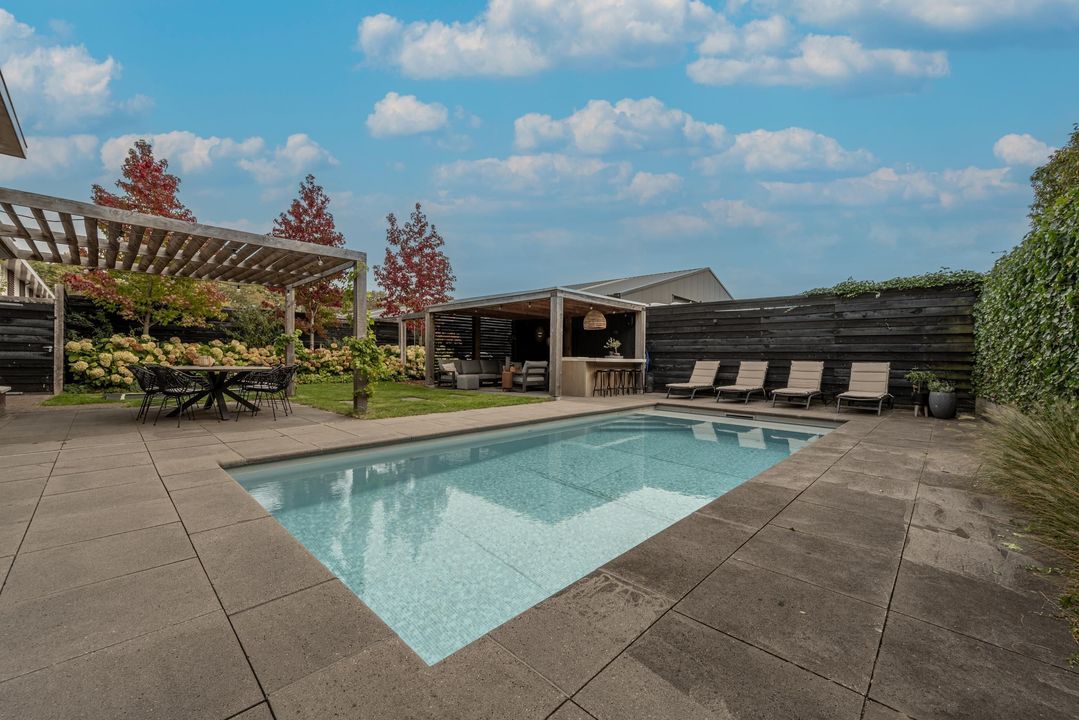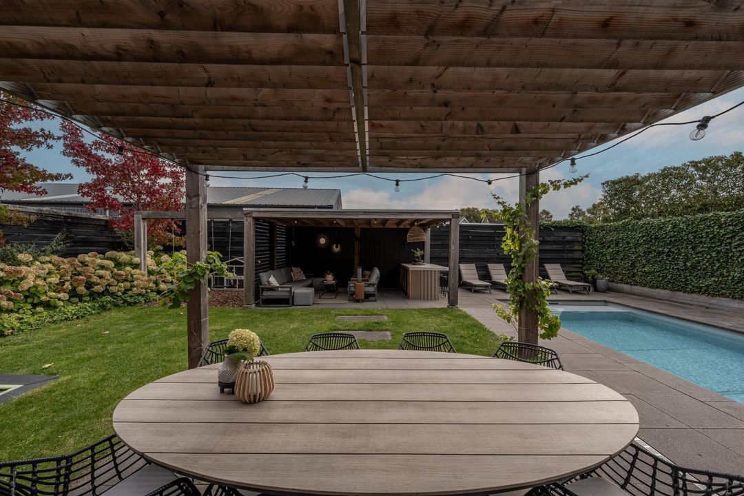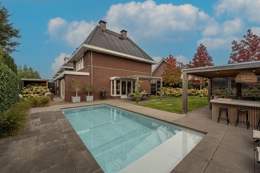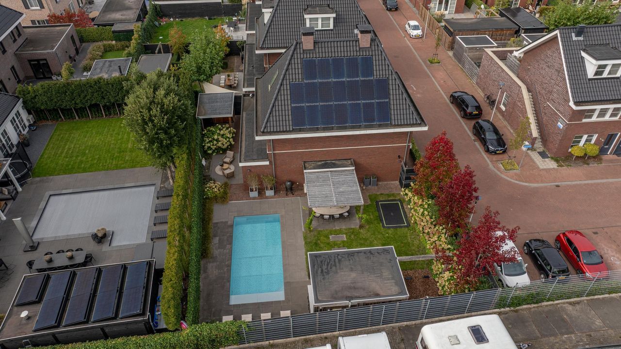 De tuin ligt op het zuiden en biedt volledige privacy. Blikvanger is het verwarmde, bouwkundige zwembad met roldek en automatische filter- en chloorinstallatie. De vrijstaande overkapping met bar en ruime loungehoek maakt het plaatje compleet en nodigt uit tot lange zomeravonden. Verder is er een sfeervolle houten zonwering bij de erker, een tweede overkapping voor fietsen en een naastgelegen berging voor de zwembadinstallatie. De oprit biedt parkeerruimte op eigen terrein en is voorzien van een laadpaal.