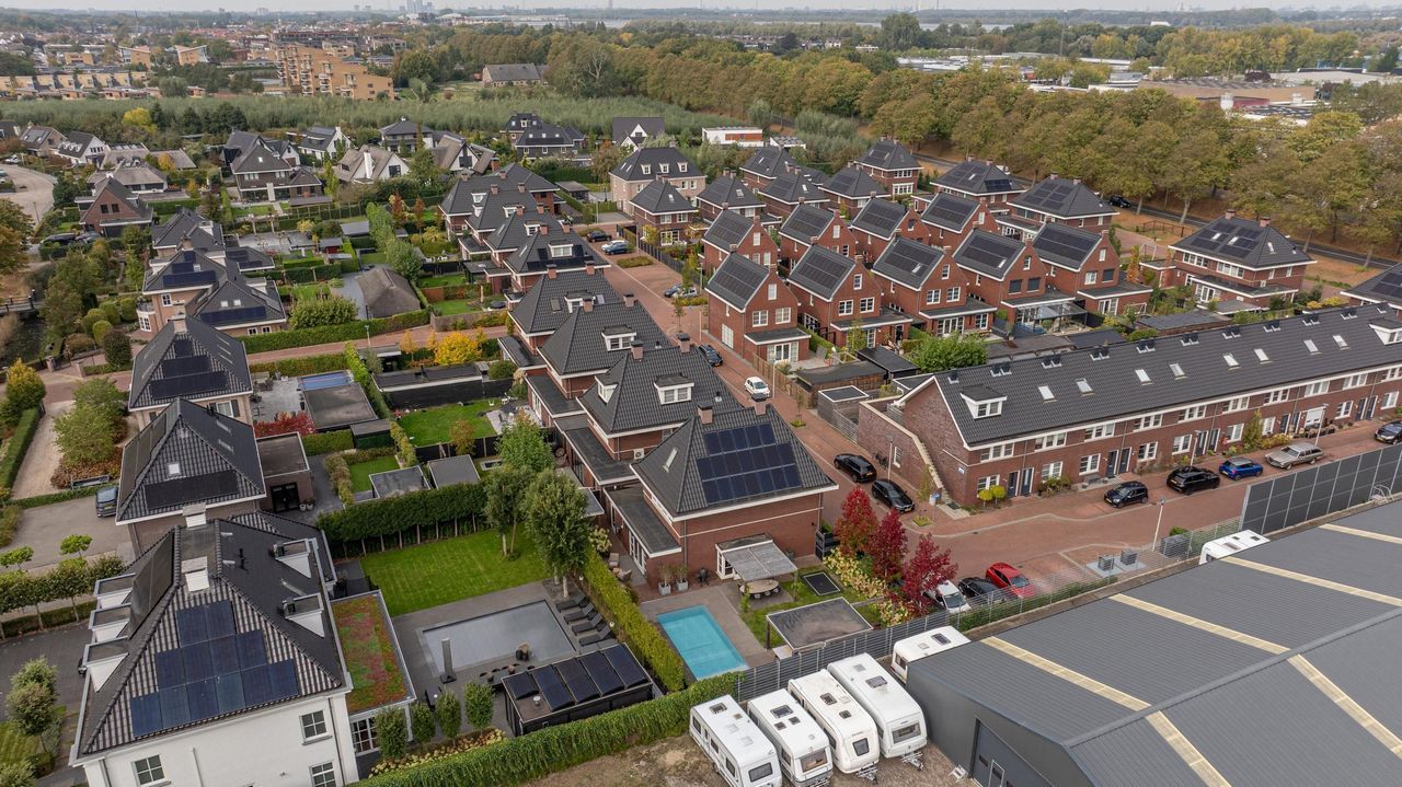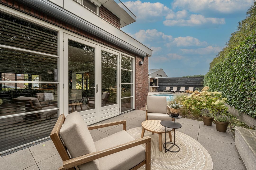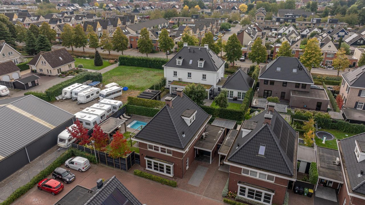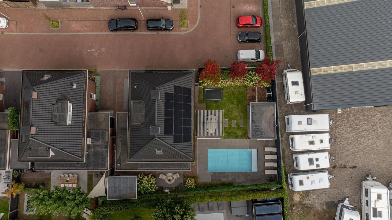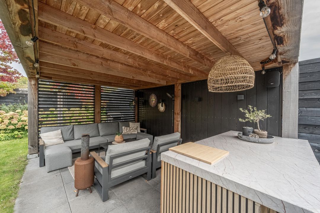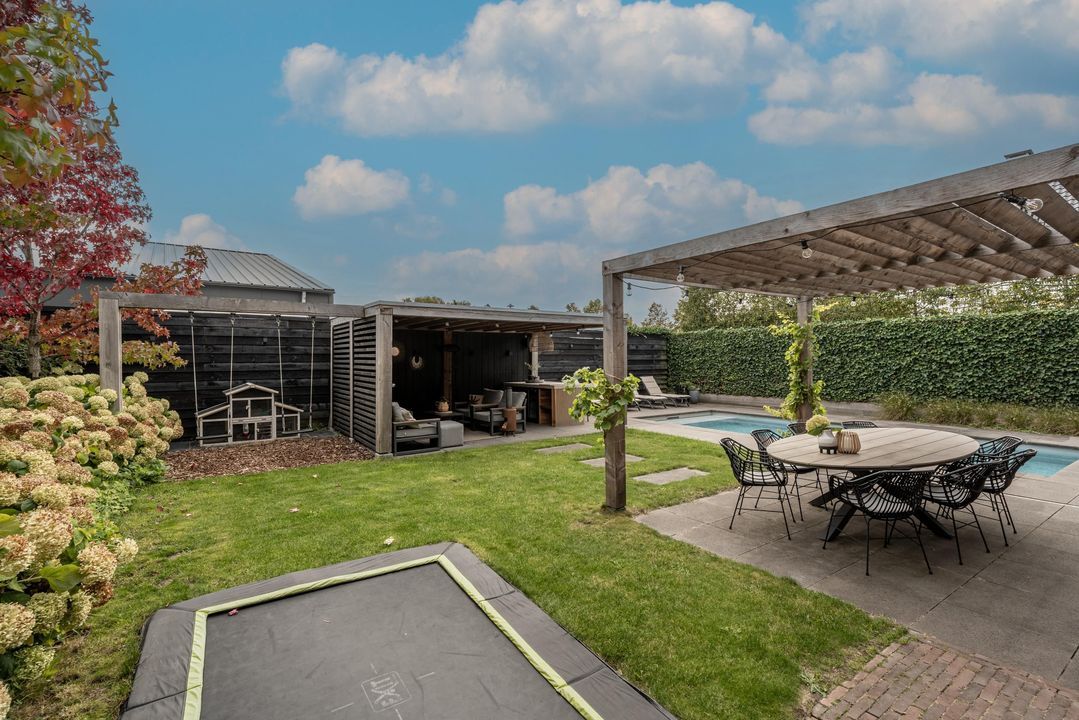 De tuin ligt op het zuiden en biedt volledige privacy. Blikvanger is het verwarmde, bouwkundige zwembad met roldek en automatische filter- en chloorinstallatie. De vrijstaande overkapping met bar en ruime loungehoek maakt het plaatje compleet en nodigt uit tot lange zomeravonden. Verder is er een sfeervolle houten zonwering bij de erker, een tweede overkapping voor fietsen en een naastgelegen berging voor de zwembadinstallatie. De oprit biedt parkeerruimte op eigen terrein en is voorzien van een laadpaal.