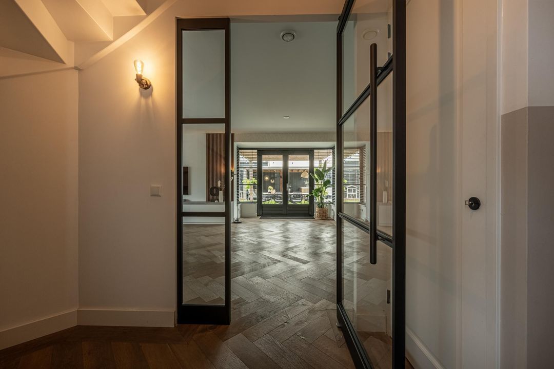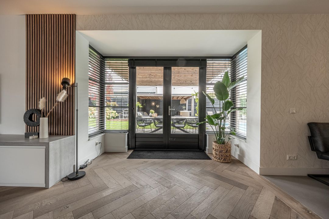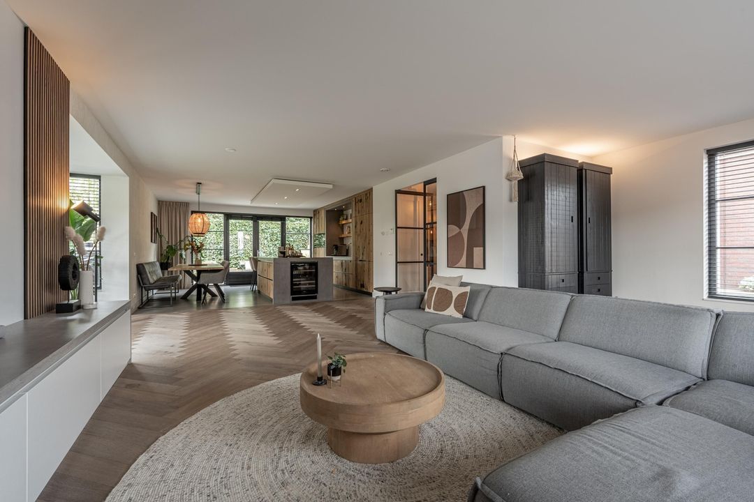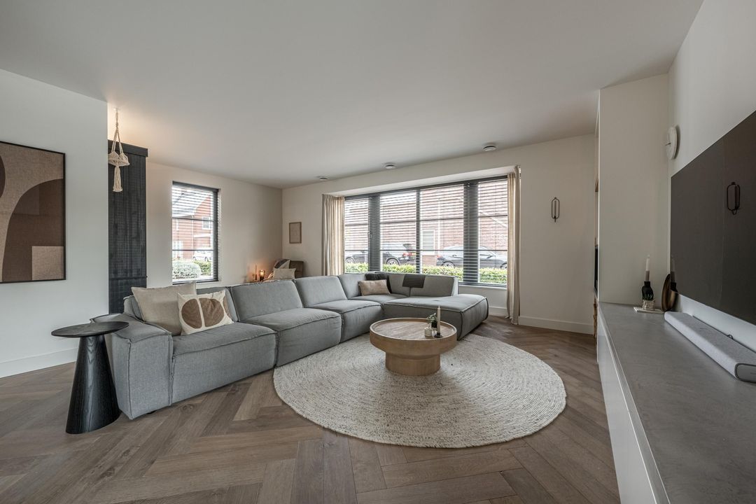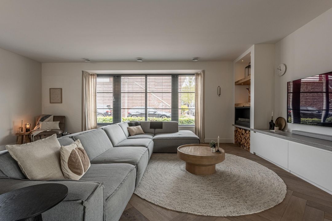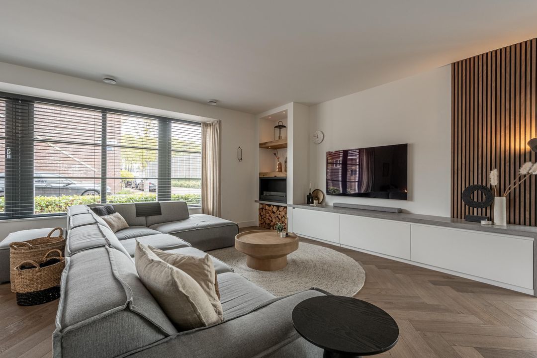 Binnen straalt alles harmonie en klasse uit. De woonkamer heeft een massief eiken visgraatvloer, glad gestuukte wanden en plafonds en een sfeervolle erker aan de zijkant van de woning. Er is een ethanolhaard en een stijlvol vast tv-meubel. De kozijnen zijn aan de binnenzijde antraciet en aan de buitenzijde wit, wat het geheel een moderne en rustige uitstraling geeft.