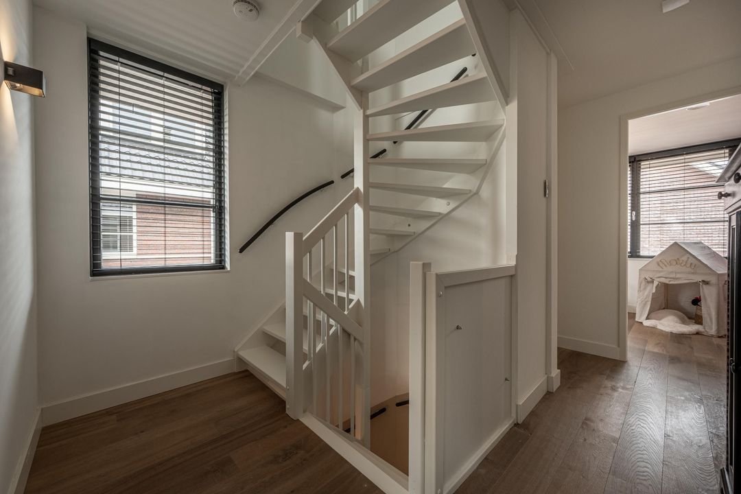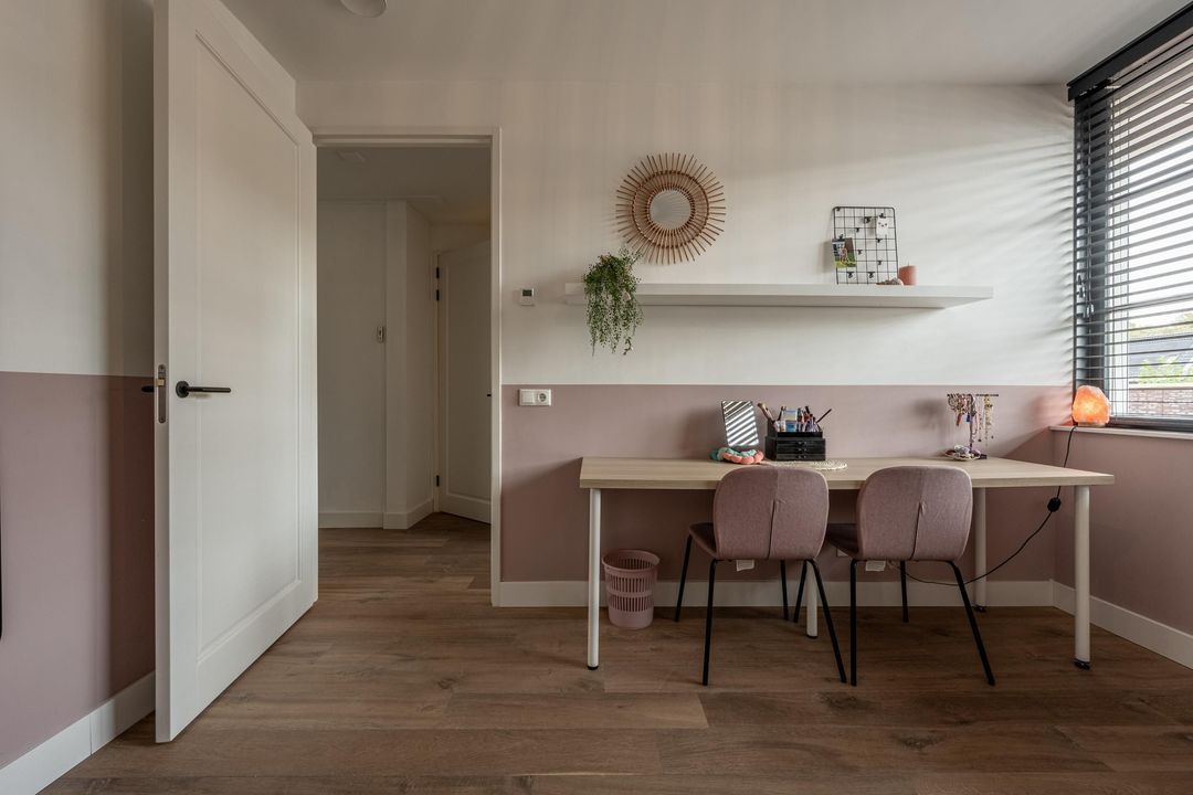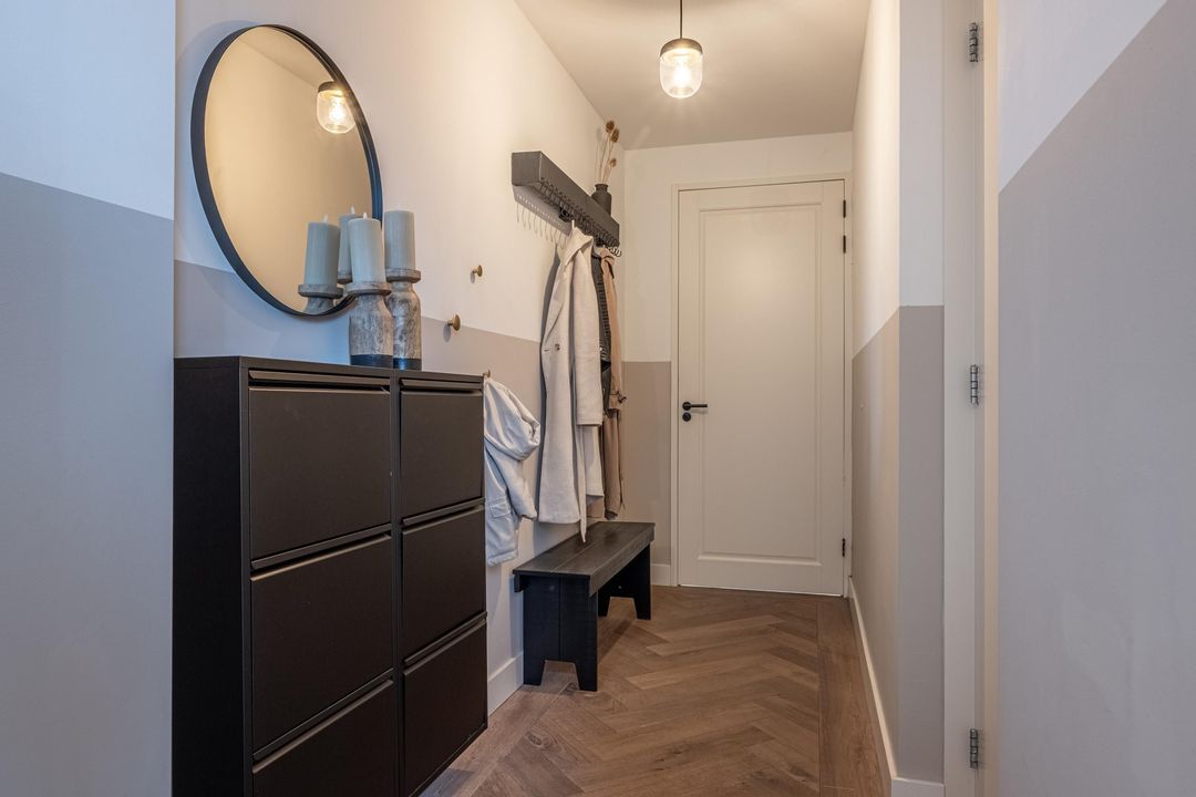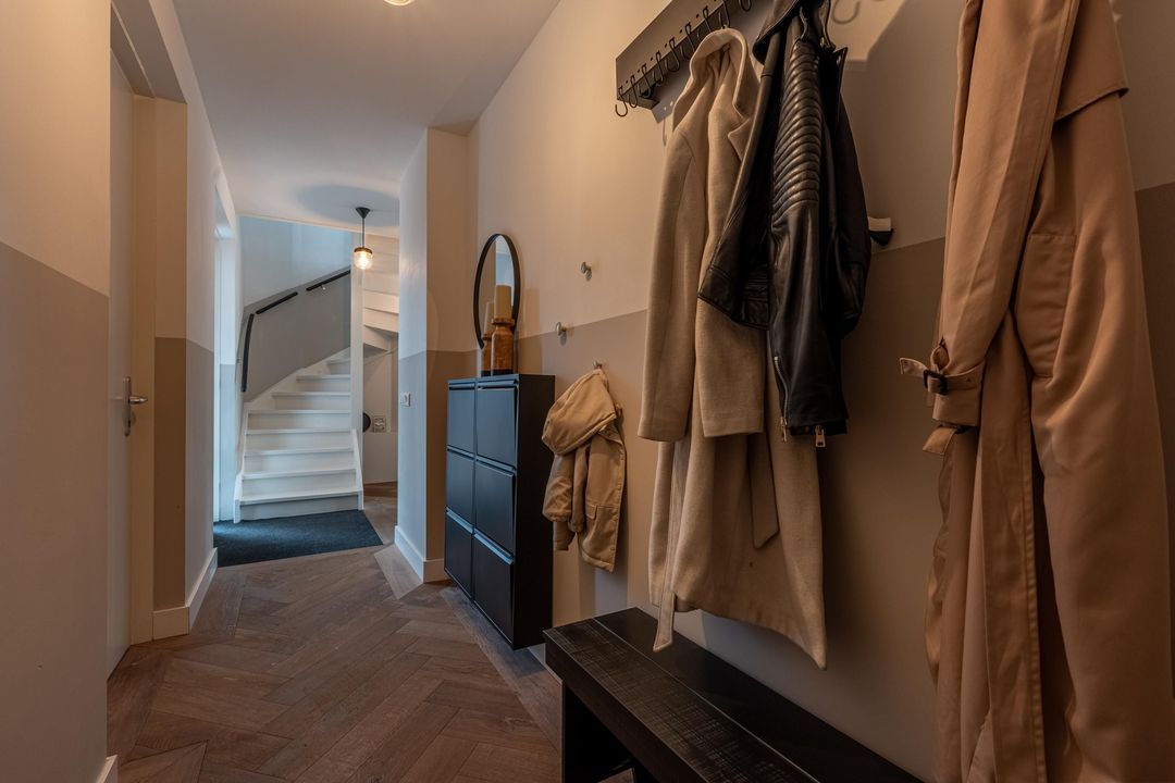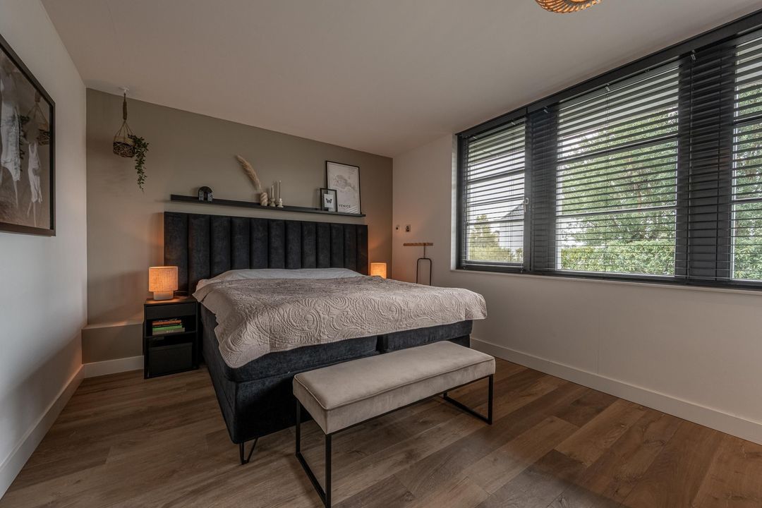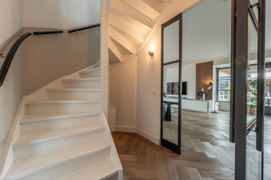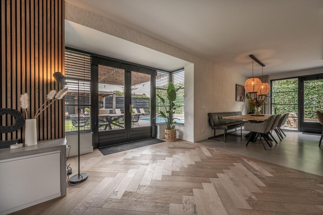 Binnen straalt alles harmonie en klasse uit. De woonkamer heeft een massief eiken visgraatvloer, glad gestuukte wanden en plafonds en een sfeervolle erker aan de zijkant van de woning. Er is een ethanolhaard en een stijlvol vast tv-meubel. De kozijnen zijn aan de binnenzijde antraciet en aan de buitenzijde wit, wat het geheel een moderne en rustige uitstraling geeft.