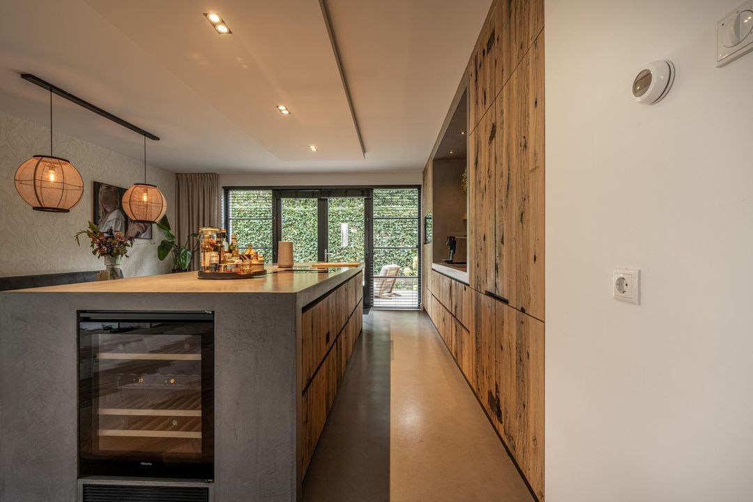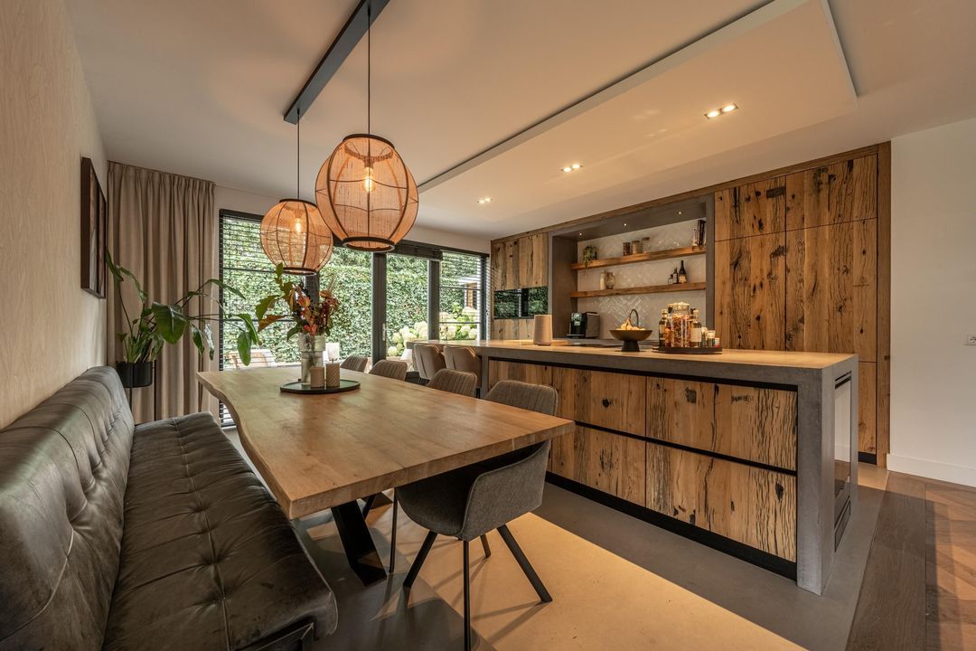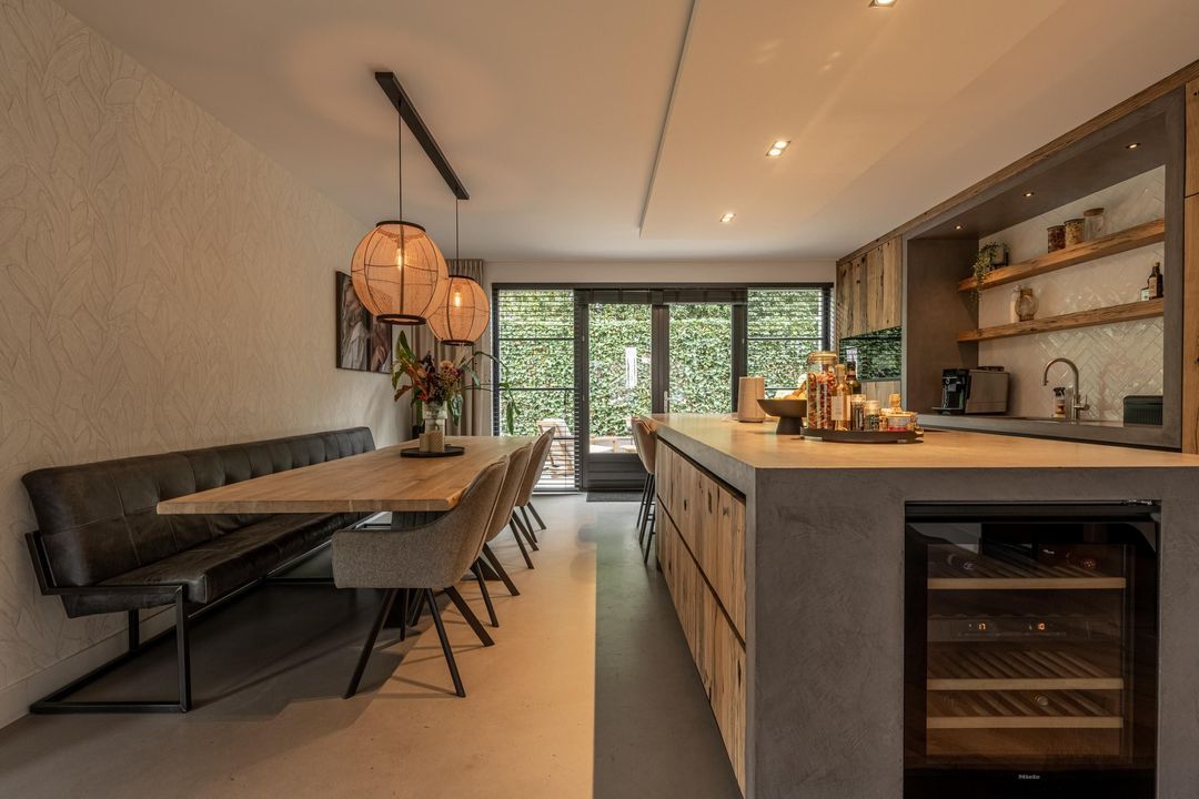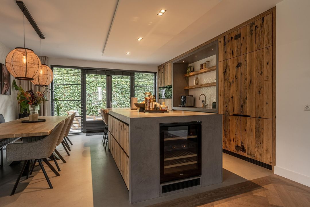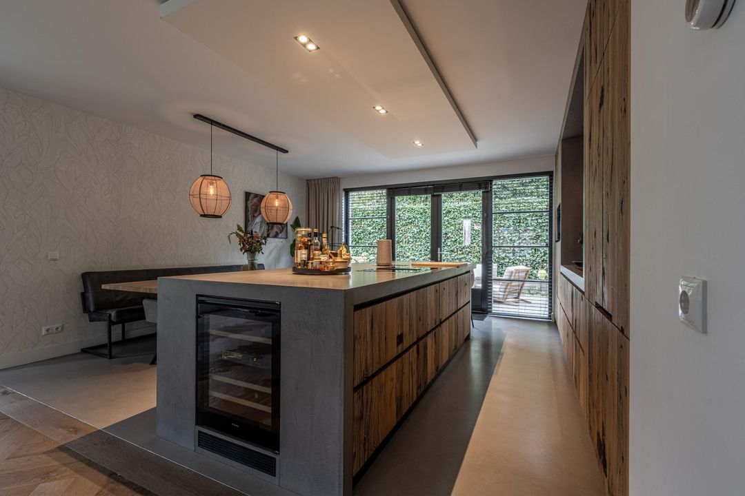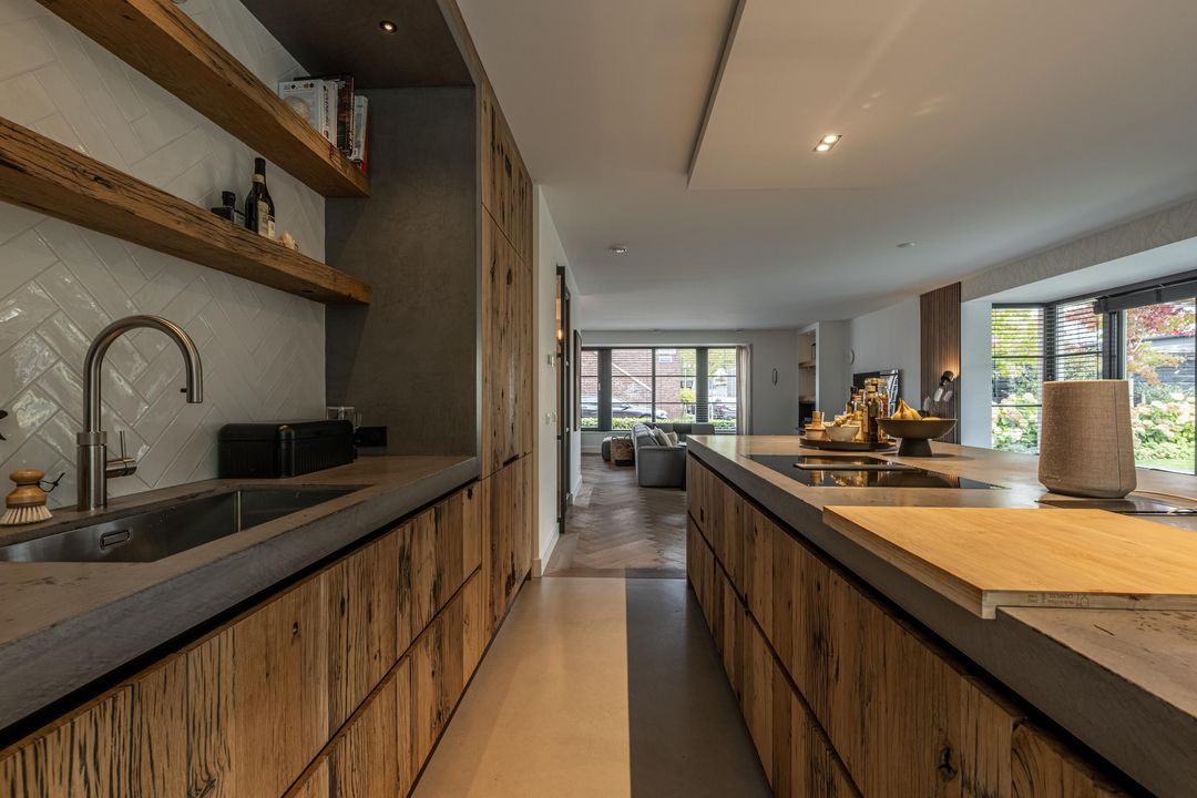 De open keuken vormt het kloppend hart van de woning. Het betonnen werkblad en de fronten van oude wagondelen geven een stoere, natuurlijke uitstraling, terwijl de hoogwaardige Miele-apparatuur met onder meer stoomoven, combimagnetron, wijnklimaatkast en inductiekookplaat met geïntegreerde afzuiging zorgt voor gebruiksgemak en stijl. De gietvloer in de keuken en eetruimte sluit naadloos aan op de eiken vloer in de woonkamer en versterkt het luxe geheel.