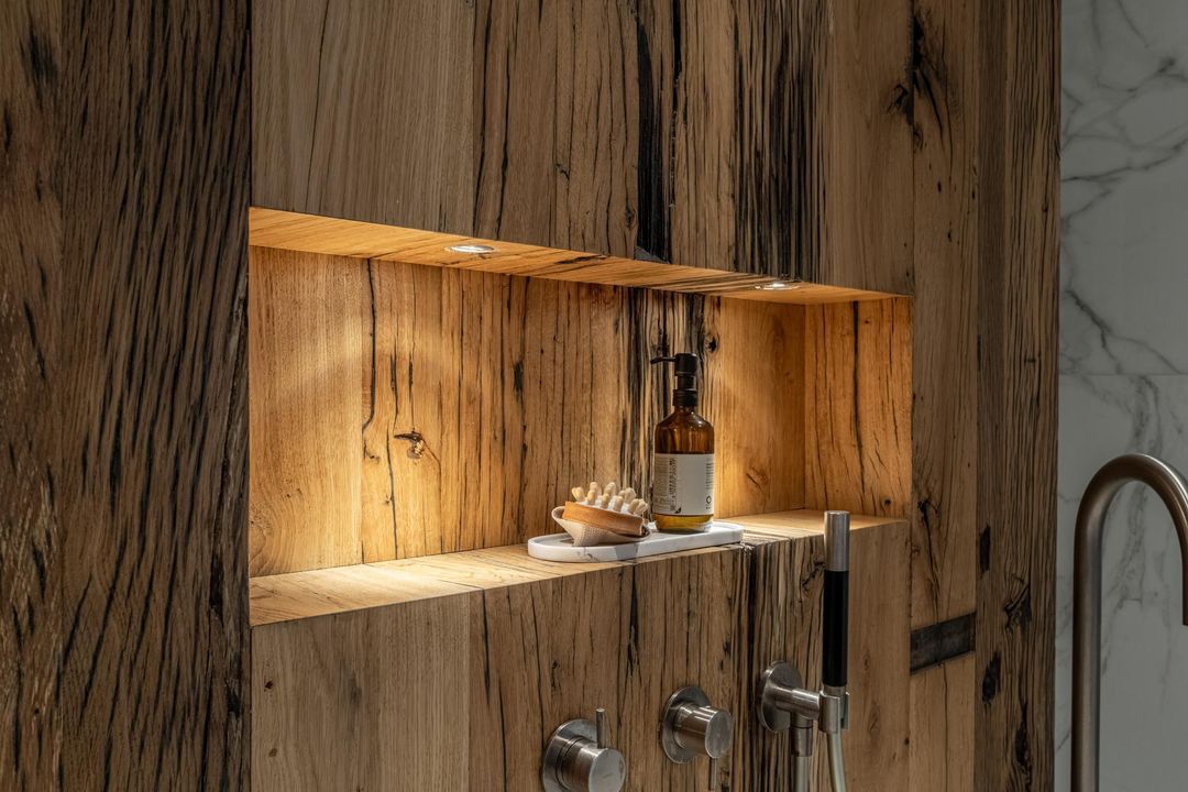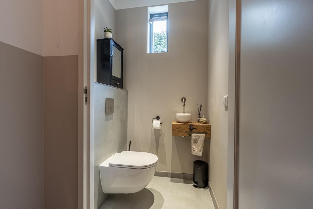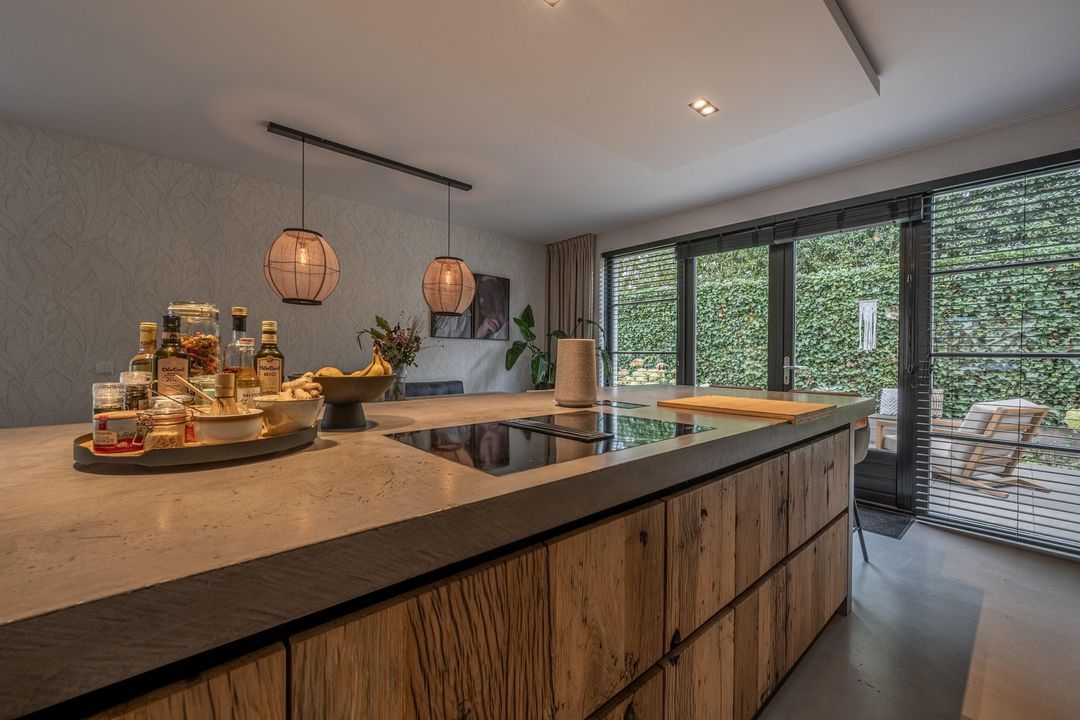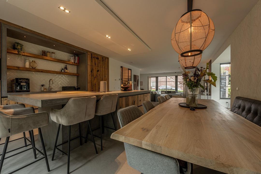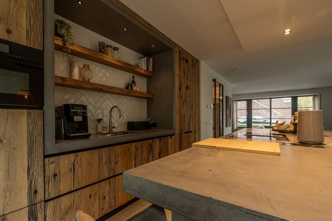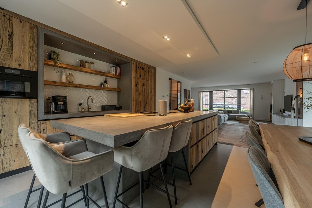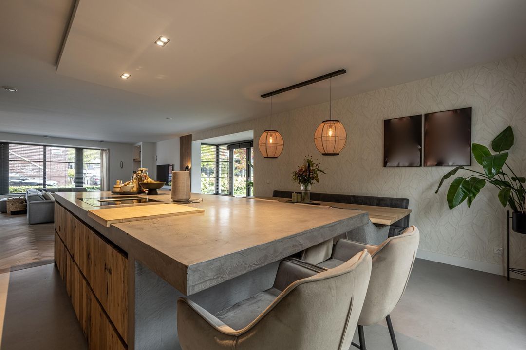 De open keuken vormt het kloppend hart van de woning. Het betonnen werkblad en de fronten van oude wagondelen geven een stoere, natuurlijke uitstraling, terwijl de hoogwaardige Miele-apparatuur met onder meer stoomoven, combimagnetron, wijnklimaatkast en inductiekookplaat met geïntegreerde afzuiging zorgt voor gebruiksgemak en stijl. De gietvloer in de keuken en eetruimte sluit naadloos aan op de eiken vloer in de woonkamer en versterkt het luxe geheel.
