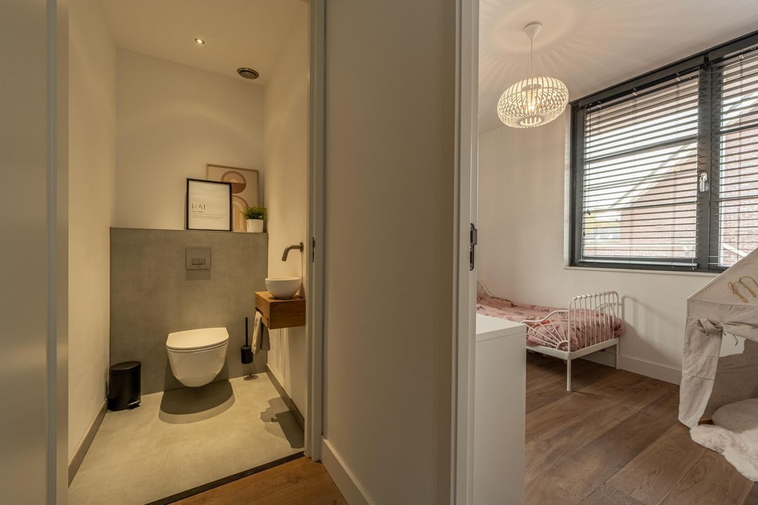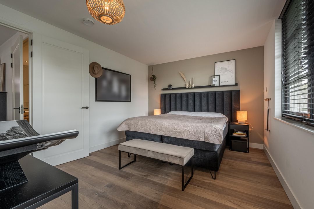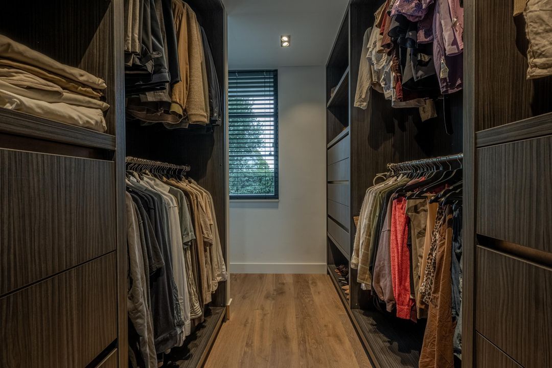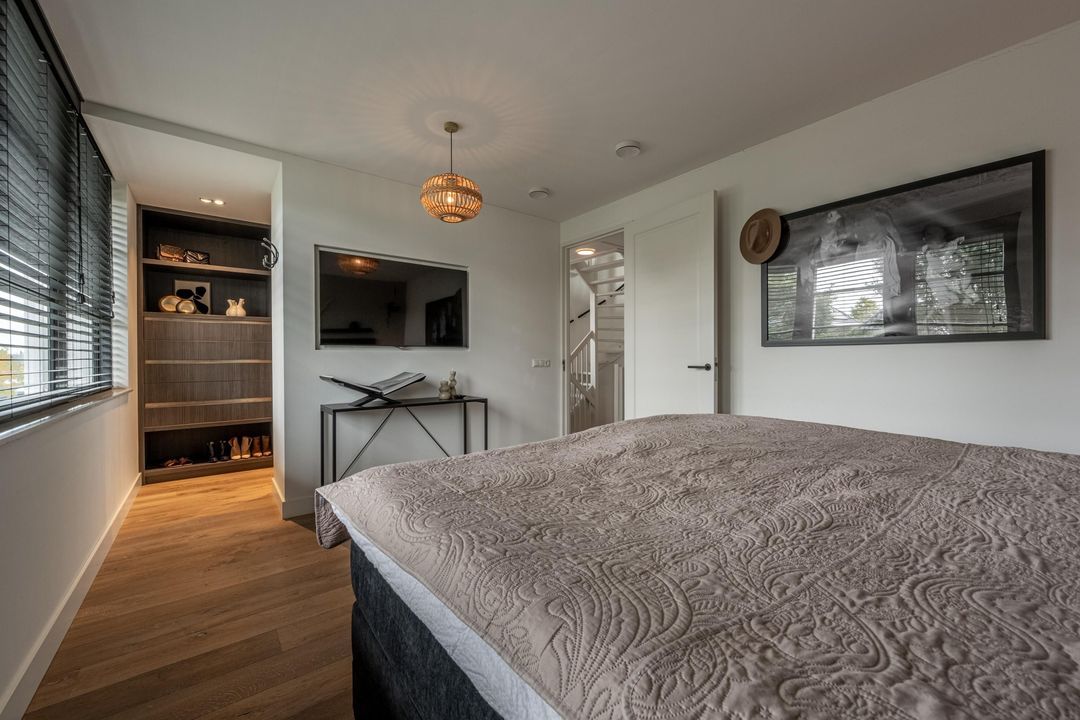 Op de eerste verdieping ligt dezelfde fraaie eiken vloer, hier in de lengterichting van het huis. De overloop is ruim en licht. De ouderslaapkamer heeft een in de wand verzonken tv en een royale walk-in closet met sfeervolle verlichting. De badkamer is een stijlvolle blikvanger met een dubbele inloopdouche achter een eiken wand, een vrijstaand ligbad, twee opzetwastafels, marmeren wanden en verfijnde details in verlichting en kranen. Het separate toilet is in dezelfde strakke stijl uitgevoerd als op de begane grond.