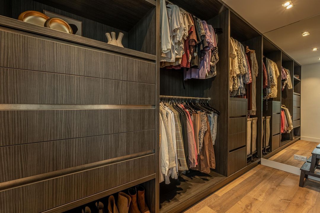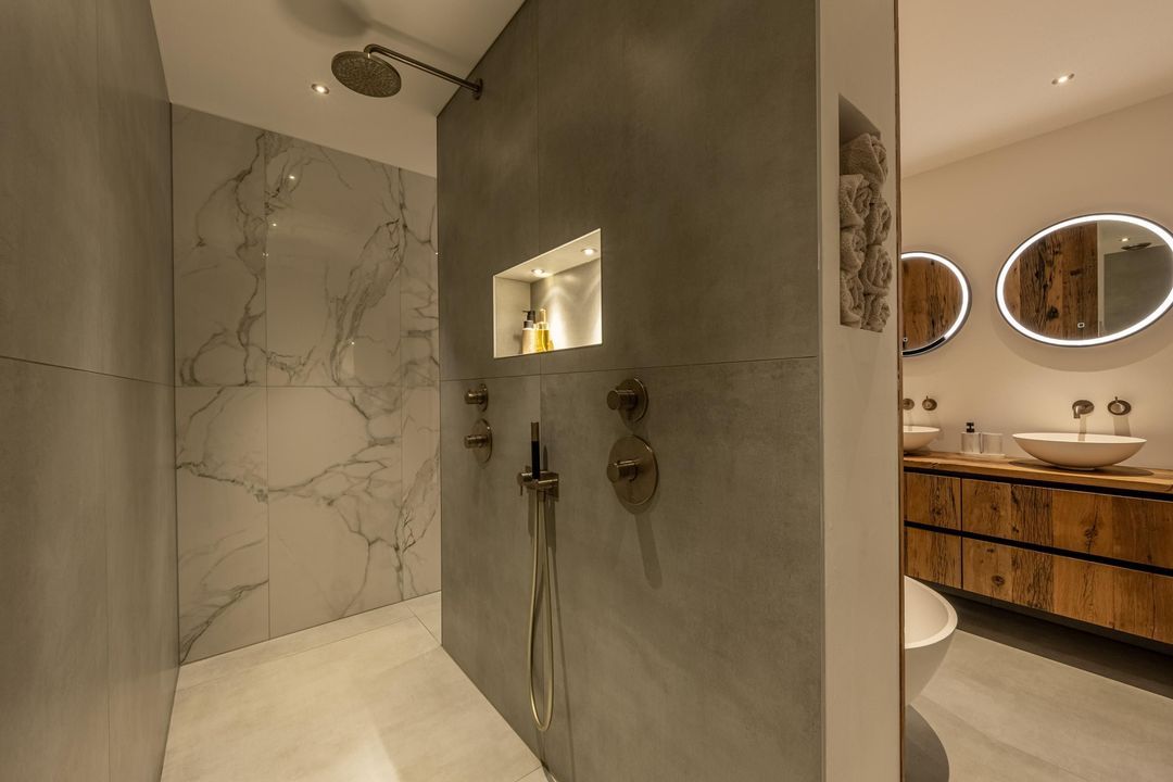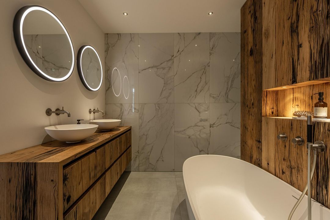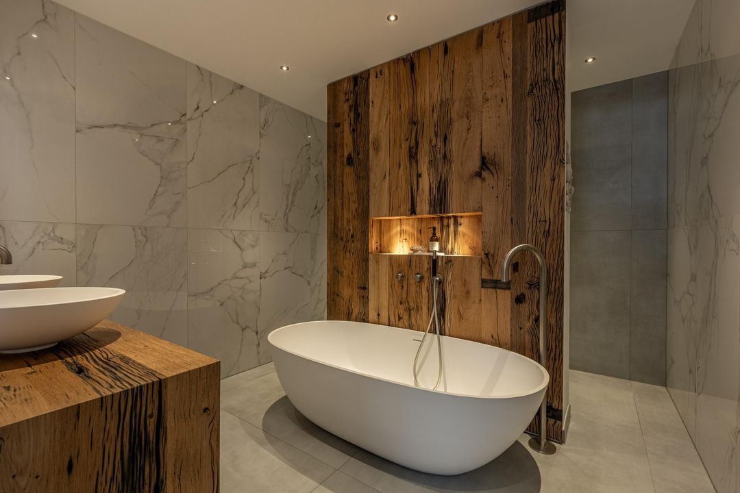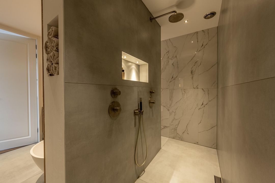 Op de eerste verdieping ligt dezelfde fraaie eiken vloer, hier in de lengterichting van het huis. De overloop is ruim en licht. De ouderslaapkamer heeft een in de wand verzonken tv en een royale walk-in closet met sfeervolle verlichting. De badkamer is een stijlvolle blikvanger met een dubbele inloopdouche achter een eiken wand, een vrijstaand ligbad, twee opzetwastafels, marmeren wanden en verfijnde details in verlichting en kranen. Het separate toilet is in dezelfde strakke stijl uitgevoerd als op de begane grond.