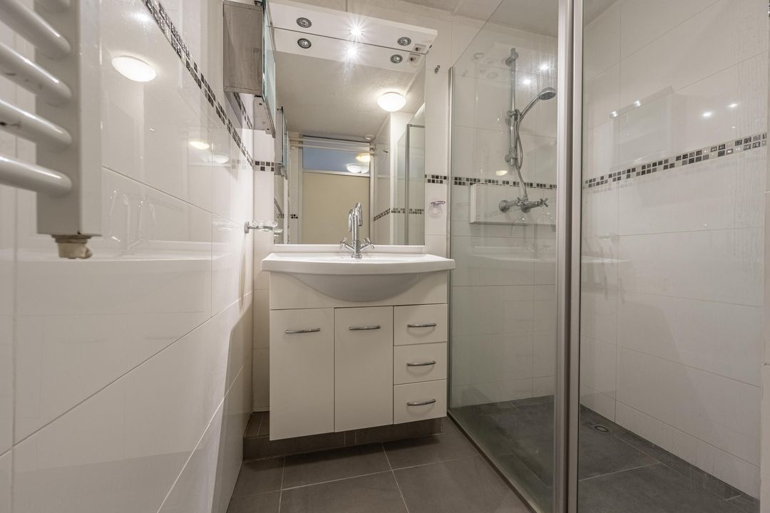 De badkamer met grijze vloer- en witte wandtegels, is ingericht met een inloopdouche, een wastafel met meubel en een designradiator.