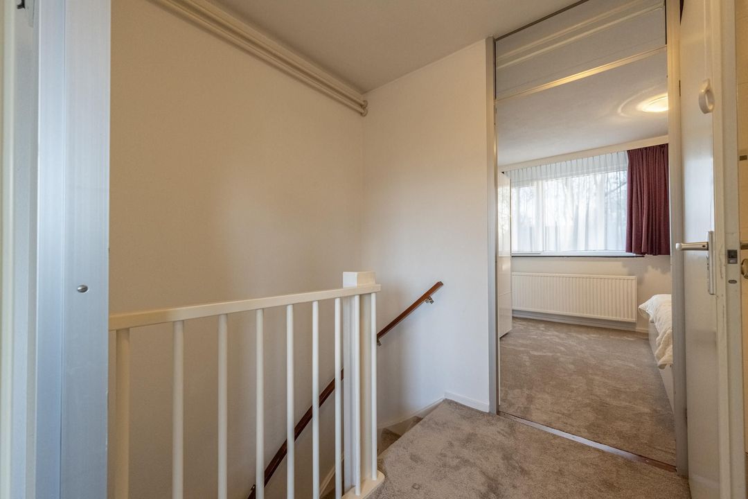 Overloop met toegang tot twee slaapkamers en de badkamer, waarbij de nieuwe vloerbedekking doorloopt over de gehele verdieping. Op de overloop bevindt zich tevens de CV ketel uit 2017 en de omvormer van de zonnepanelen.