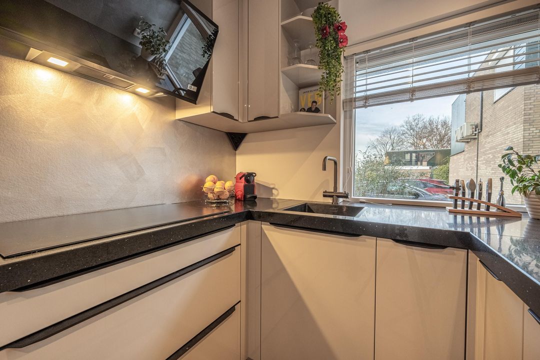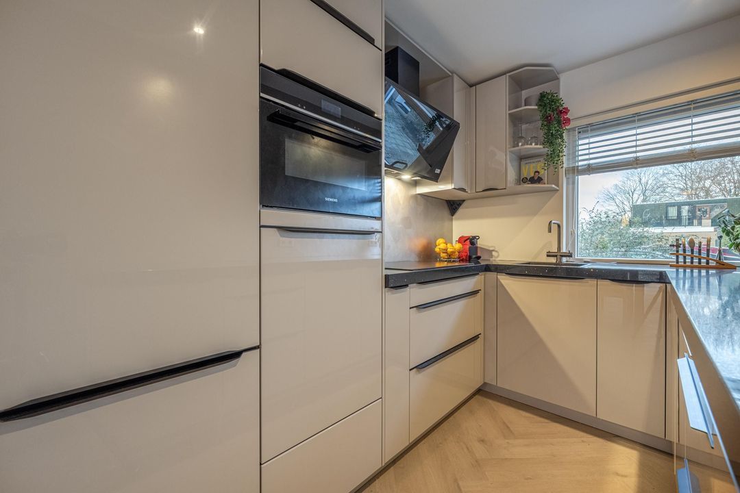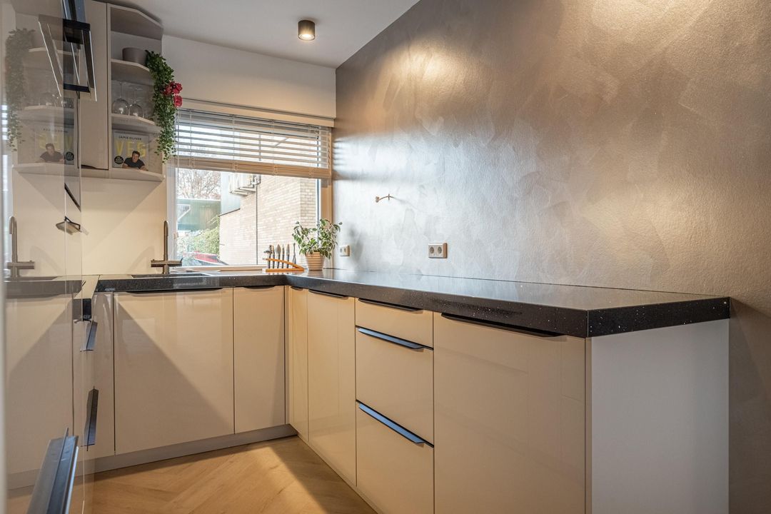 Aan de voorkant van de woning is de keuken. De keuken in U-vorm is ingericht met de benodigde inbouwapparatuur, zoals een 4-pits inductiekookplaat met bijpassende afzuigkap, combi oven/ magnetron met zelfreinigend vermogen (pyrolyse-functie)en vaatwasser. Ook is hier een Selsiuz boiler en een ingebouwde wasmachine. De keuken is in 2025 vernieuwd en afgewerkt met beige kasten en stenen werkblad.