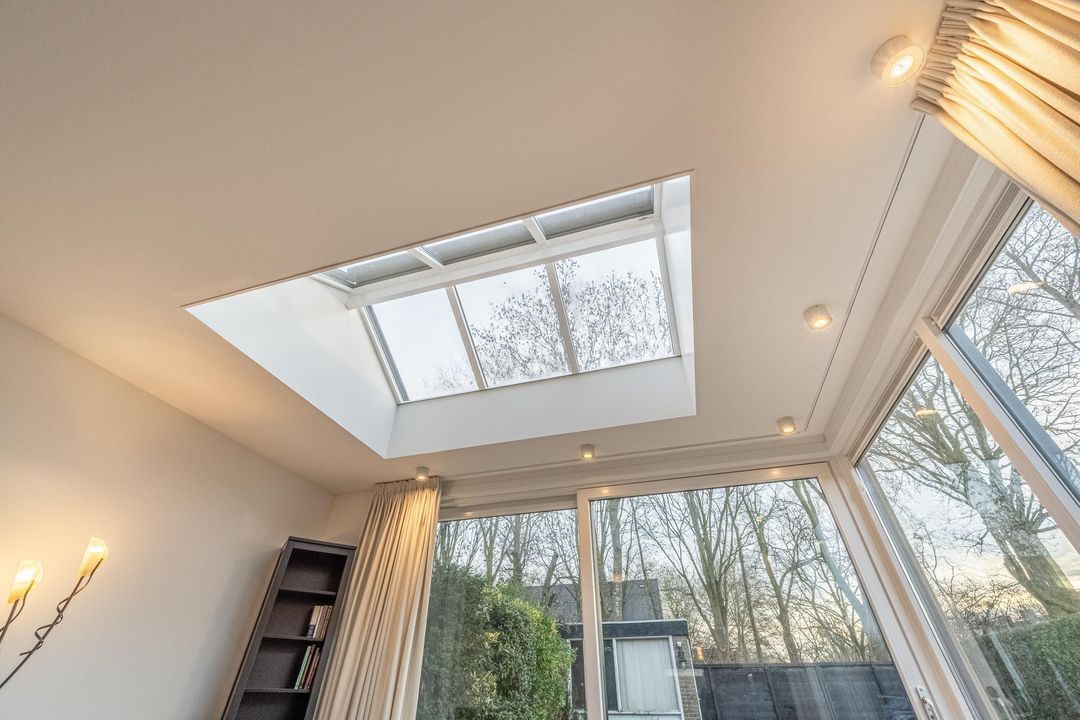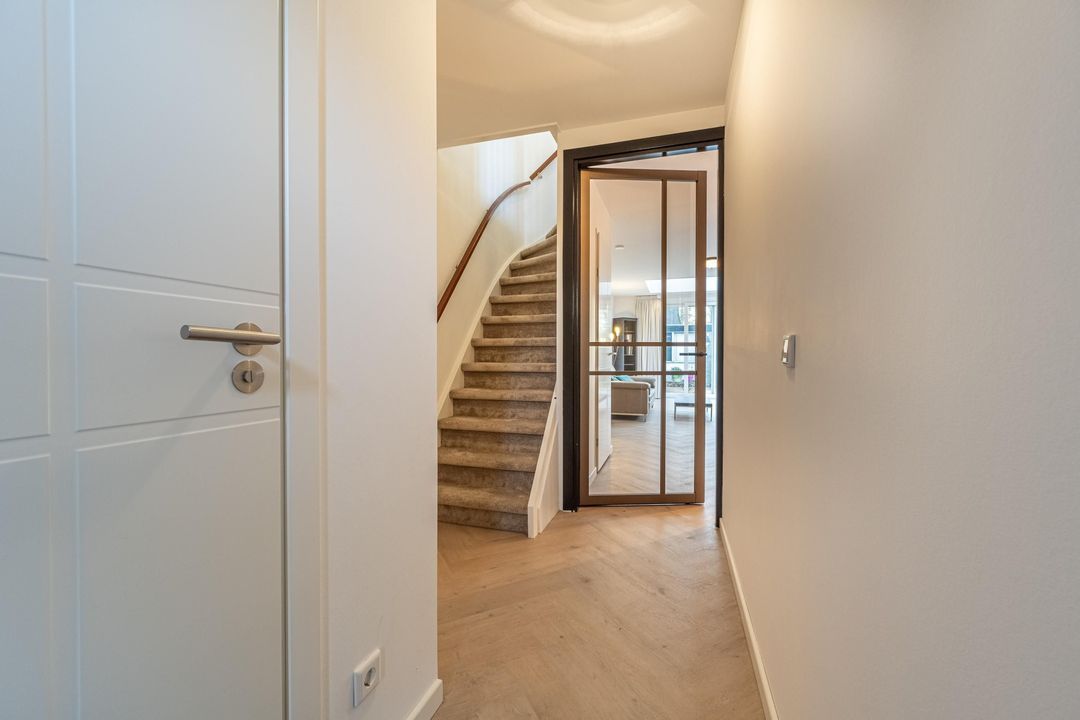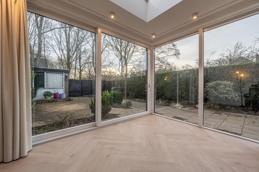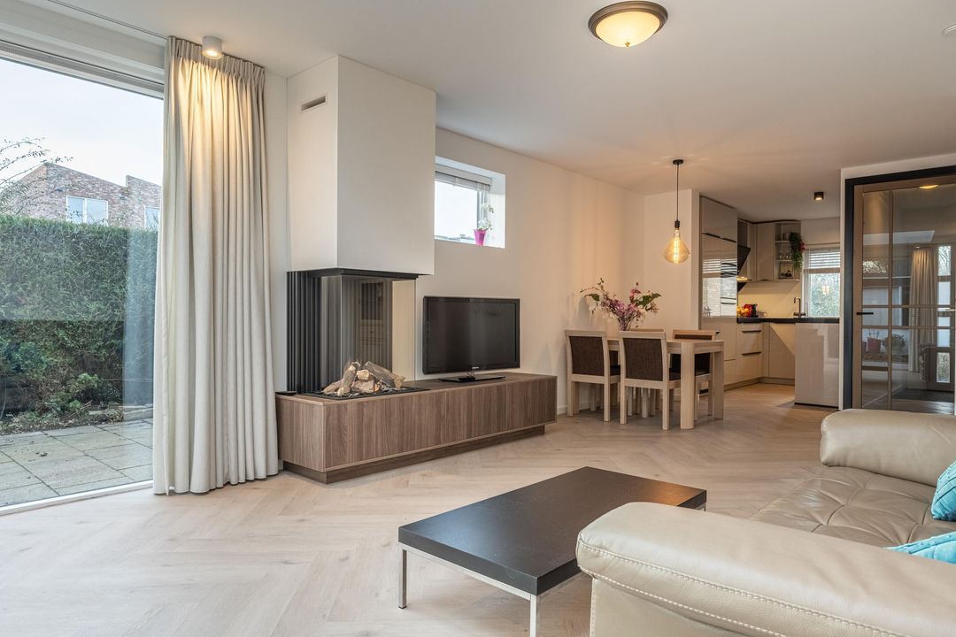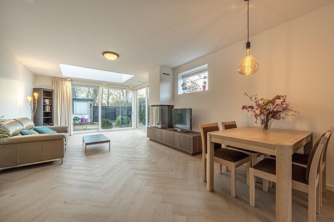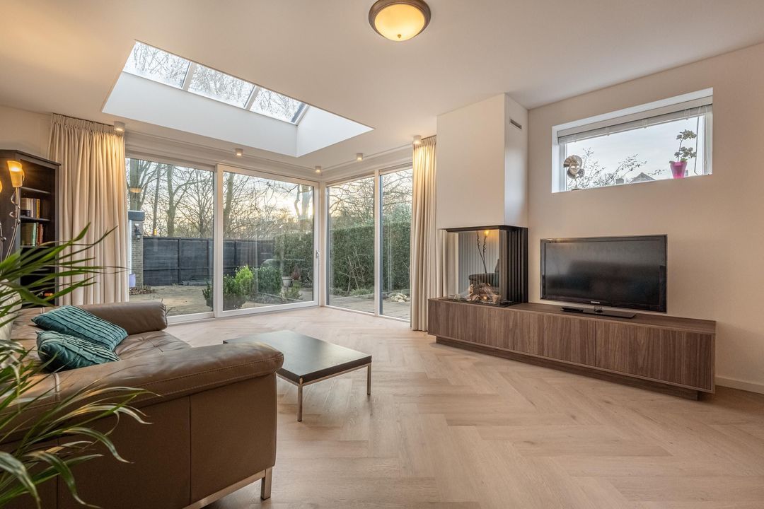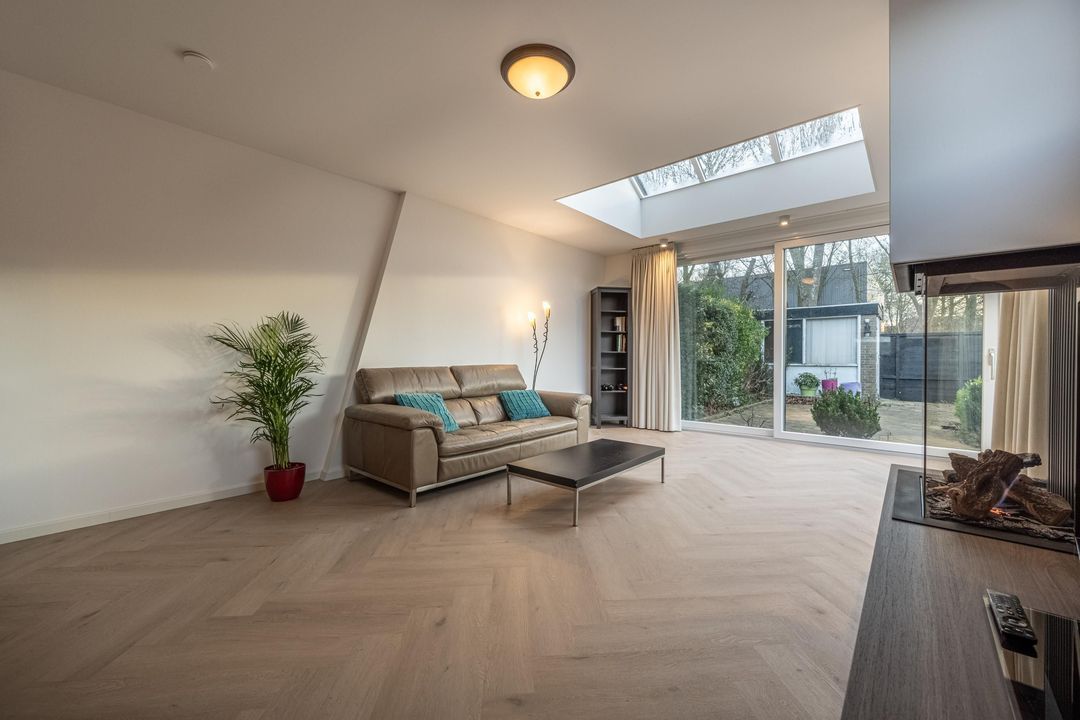 De in 2025 uitgebouwde en tuingerichte woonkamer met schuifpui is een fantastische leefruimte, met heerlijk lichtinval door de vele raampartijen en het dakraam. De gashaard zorgt voor sfeer en warmte op winterse avonden. De pvc vloer met vloerverwarming maken het geheel compleet samen met de praktische trapkast.