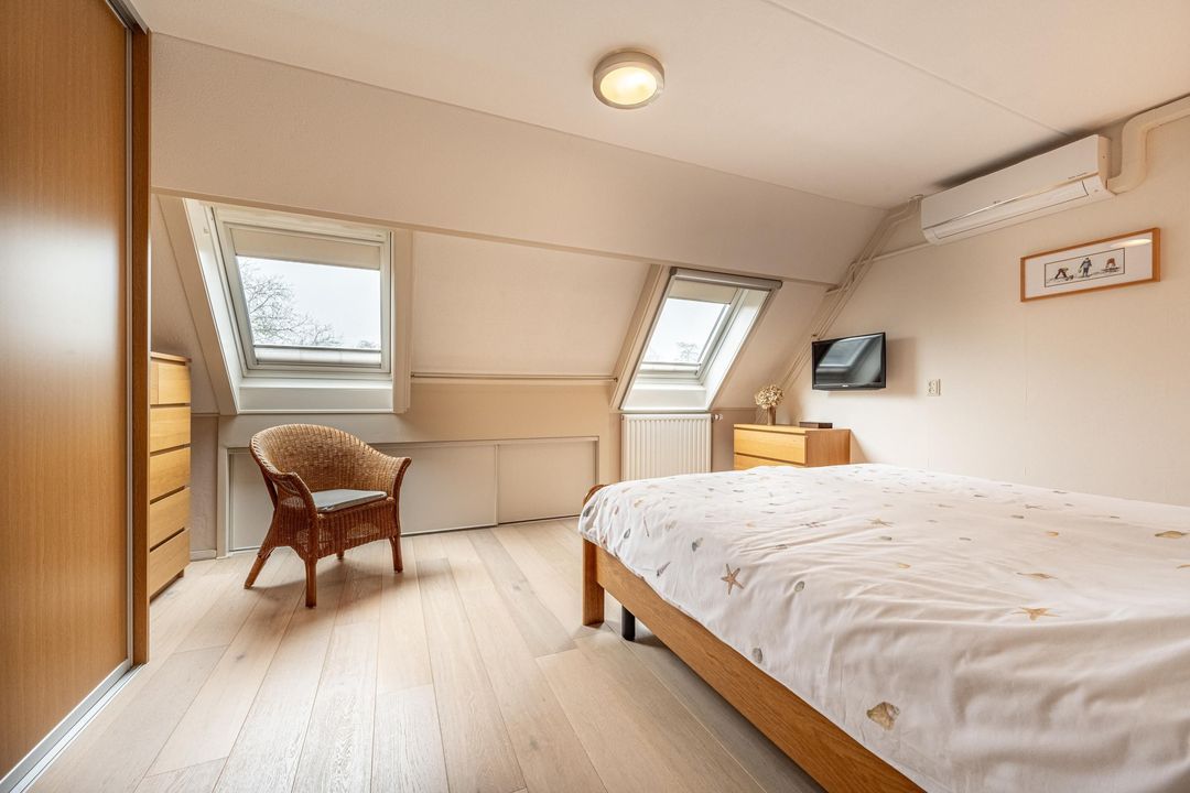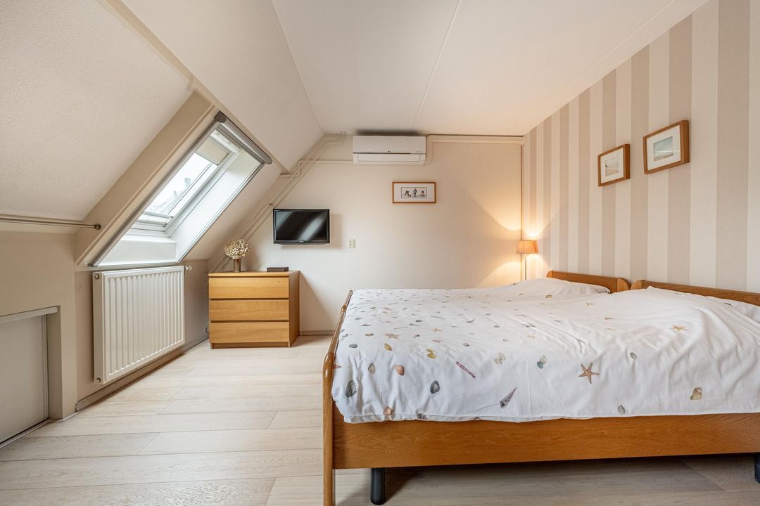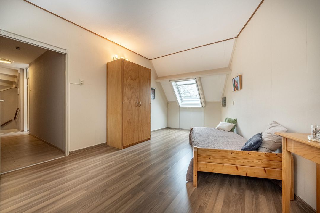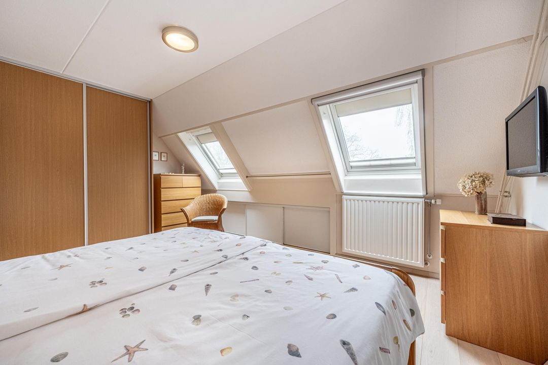 De eerste slaapkamer, gelegen aan de zijkant van de woning, is ruim en licht dankzij de combinatie van een dakraam en grote ramen aan de voorzijde. De kamer is afgewerkt met een neutrale laminaatvloer en voorzien van een kunststof Velux dakraam met plisségordijn, zonnescherm en horren. Aan de achterzijde bevindt zich een tweede, ruime slaapkamer met een fineerparketvloer met houten deklaag in een warme houtkleur. Deze kamer beschikt over een ingebouwde linnenkast met hang- en leggedeelte, airconditioning en twee dakramen, beide voorzien van plisségordijnen, zonnescherm en één insectenhor. De derde slaapkamer aan de voorzijde is compacter van formaat en afgewerkt met laminaat. Deze ruimte is ideaal te gebruiken als kinder-, werk- of hobbykamer.