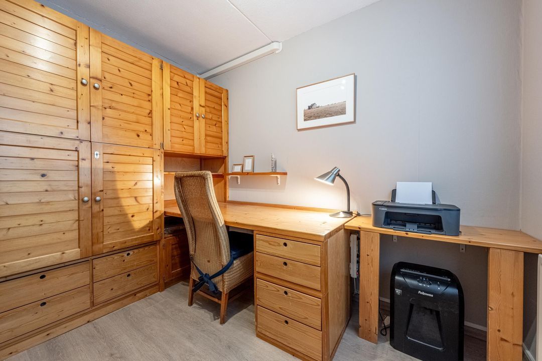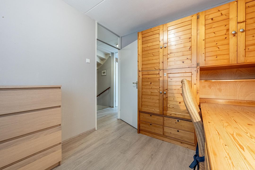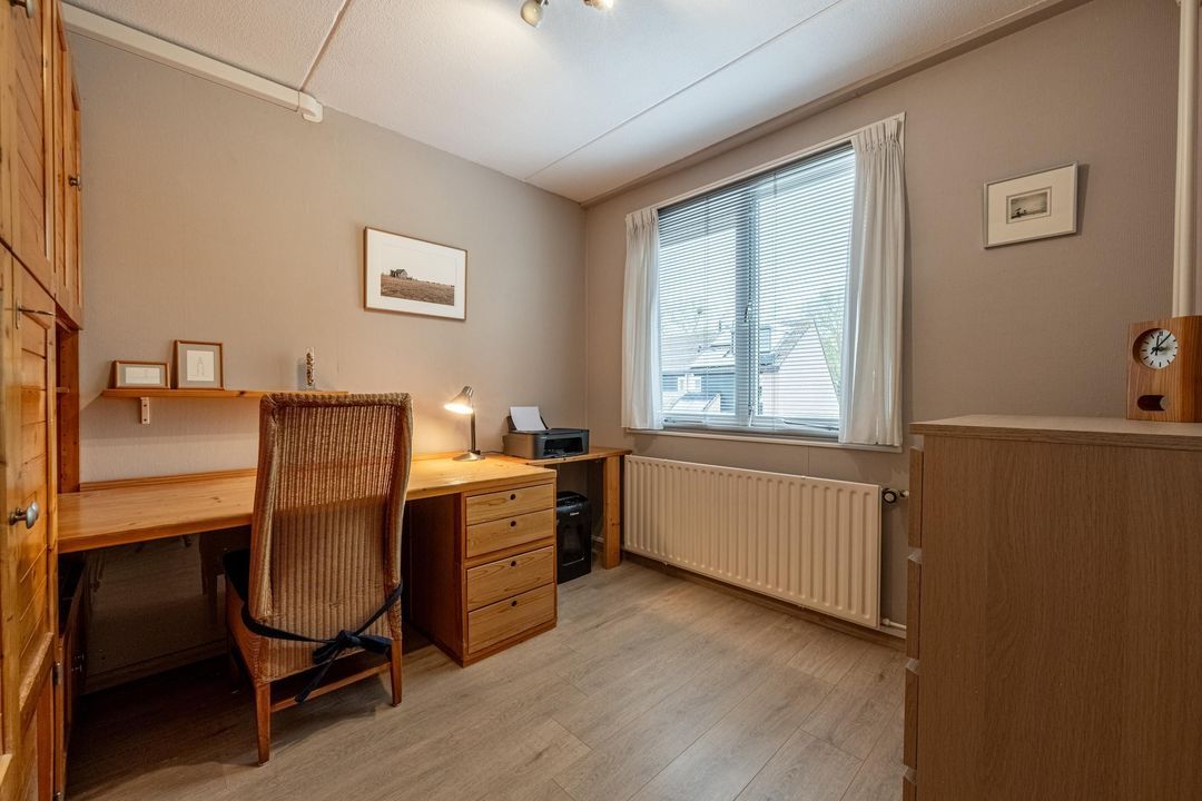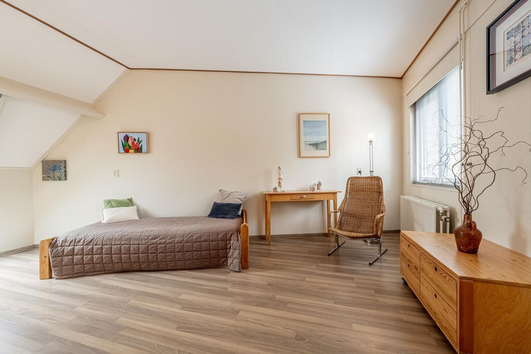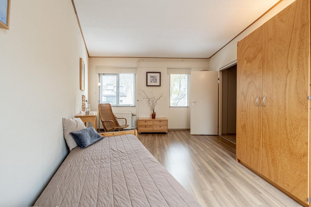 De eerste slaapkamer, gelegen aan de zijkant van de woning, is ruim en licht dankzij de combinatie van een dakraam en grote ramen aan de voorzijde. De kamer is afgewerkt met een neutrale laminaatvloer en voorzien van een kunststof Velux dakraam met plisségordijn, zonnescherm en horren. Aan de achterzijde bevindt zich een tweede, ruime slaapkamer met een fineerparketvloer met houten deklaag in een warme houtkleur. Deze kamer beschikt over een ingebouwde linnenkast met hang- en leggedeelte, airconditioning en twee dakramen, beide voorzien van plisségordijnen, zonnescherm en één insectenhor. De derde slaapkamer aan de voorzijde is compacter van formaat en afgewerkt met laminaat. Deze ruimte is ideaal te gebruiken als kinder-, werk- of hobbykamer.