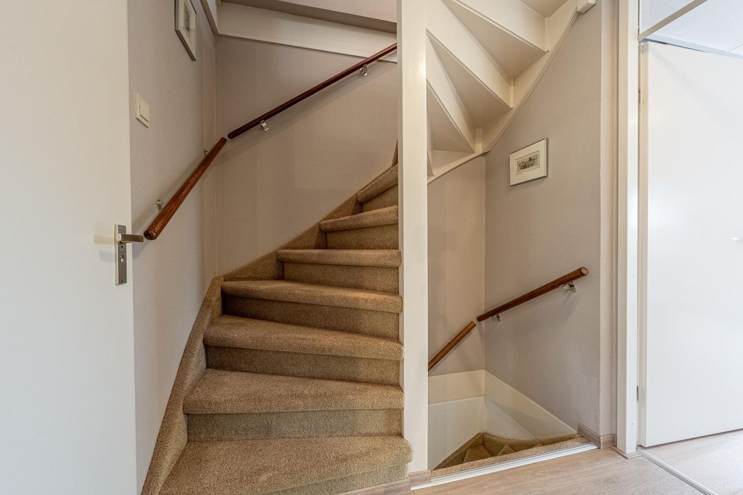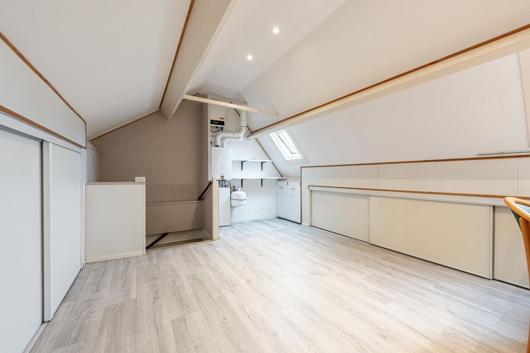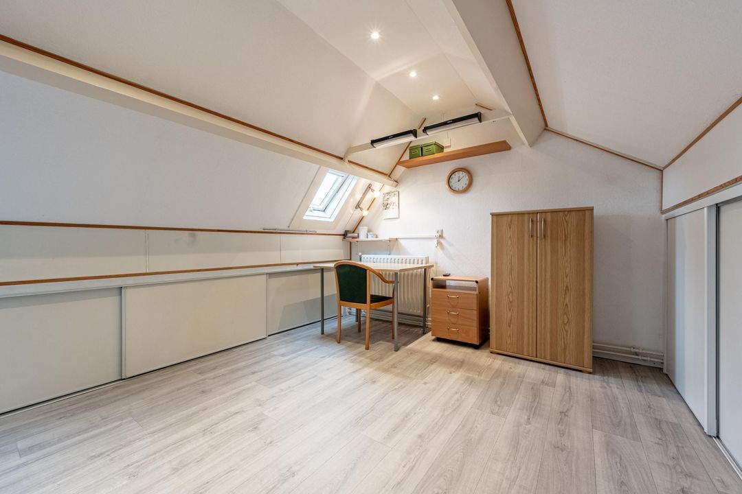 Via een vaste trap, afgewerkt met vloerbedekking, bereik je de zolderverdieping. Deze ruimte is voorzien van een vinyl vloer en een plafond met inbouwspots. Hier bevindt zich de hybride spaarpomp (Inventum, 2020), welke tevens zorgt voor de mechanische ventilatie in de woning. Daarnaast zijn hier de cv-ketel (Remeha Avanta, 2018) en de omvormer voor de zonnepanelen geplaatst. Verder is er veel praktische bergruimte aanwezig achter de knieschotten. De zolder beschikt over twee dakramen, wat zorgt voor een prettige lichtinval.