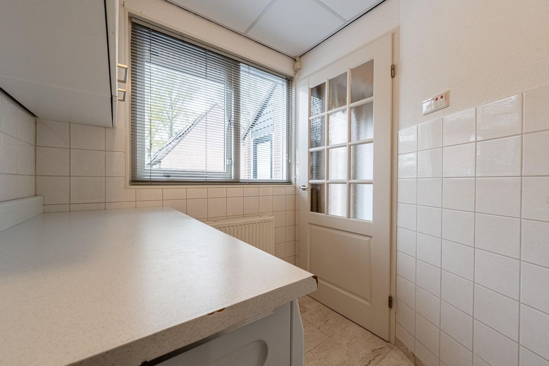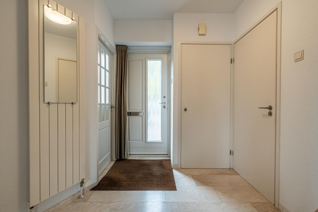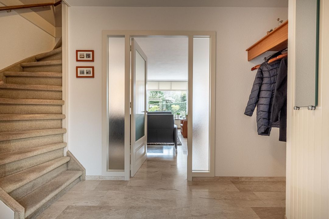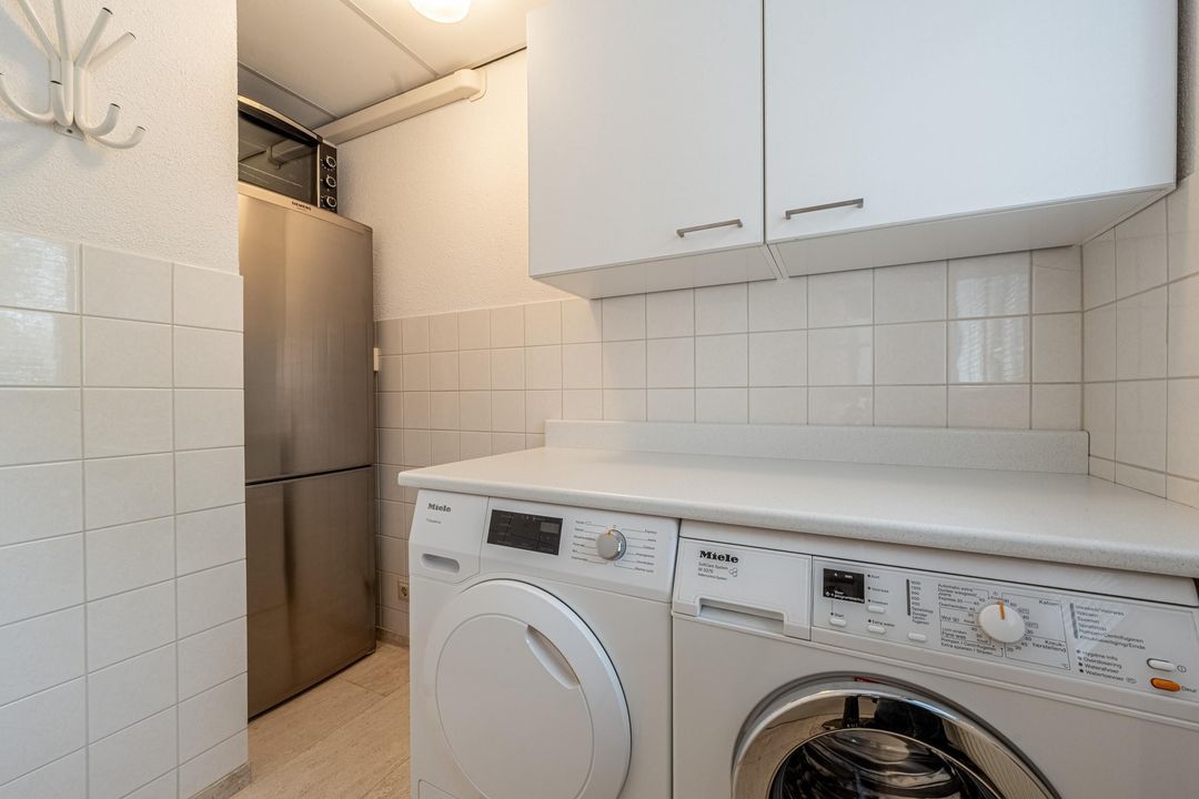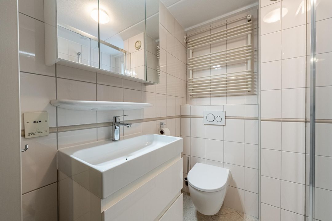 Bij binnenkomst kom je in de hal met toegang tot een praktische bergruimte met aansluitingen voor de wasmachine en droger, het toilet, de trapopgang naar de eerste verdieping en de woonkamer. Het toilet is netjes afgewerkt en voorzien van een hangend toilet, wastafel en radiator.
