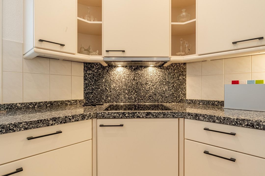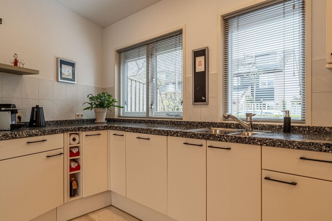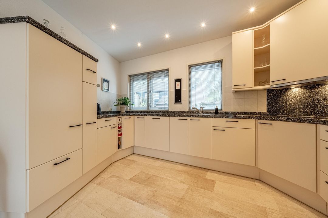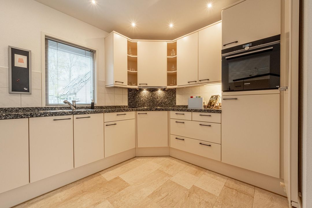 De keuken is uitgevoerd in een lichte kleurstelling met beige fronten en een granieten werkblad. De keuken is voorzien van diverse inbouwapparatuur, waaronder een 4-pits keramische kookplaat, afzuigsysteem, Siemens vaatwasser, dubbele spoelbak en een koelkast. Het plafond is afgewerkt met inbouwspots.