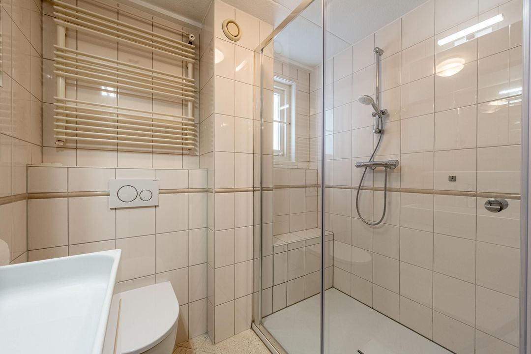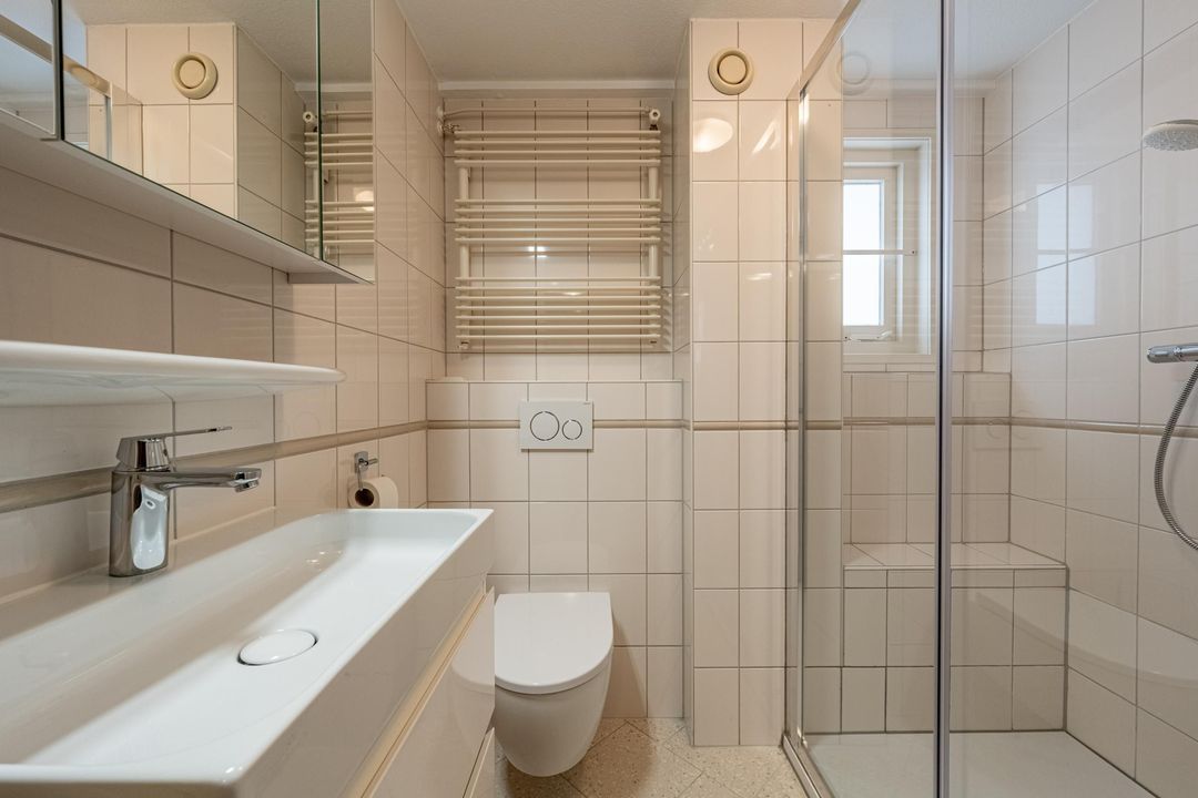 De badkamer bevindt zich aan de voorzijde van de woning en is ruim opgezet. Deze is voorzien van een inloopdouche, een raam voor natuurlijke ventilatie, een wastafelmeubel, een hangend toilet en een designradiator. De ruimte is afgewerkt met zandkleurige wand- en vloertegels.
