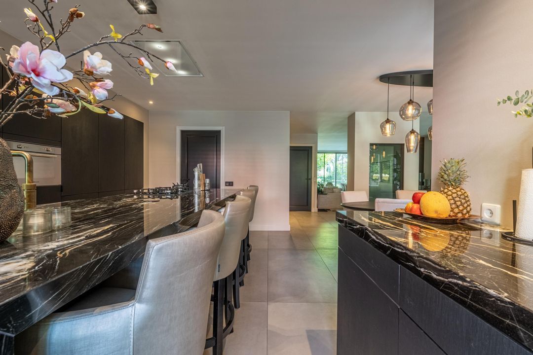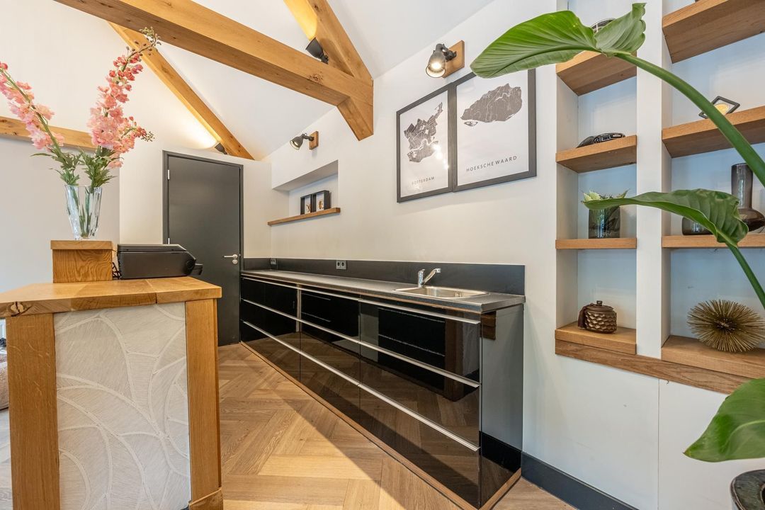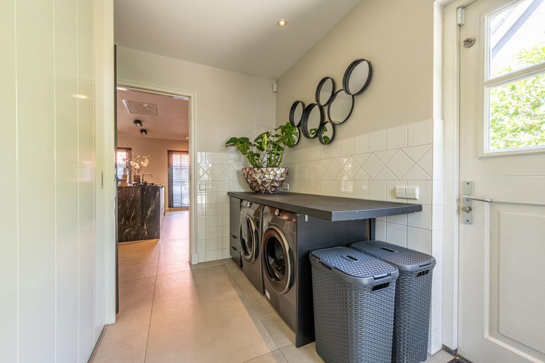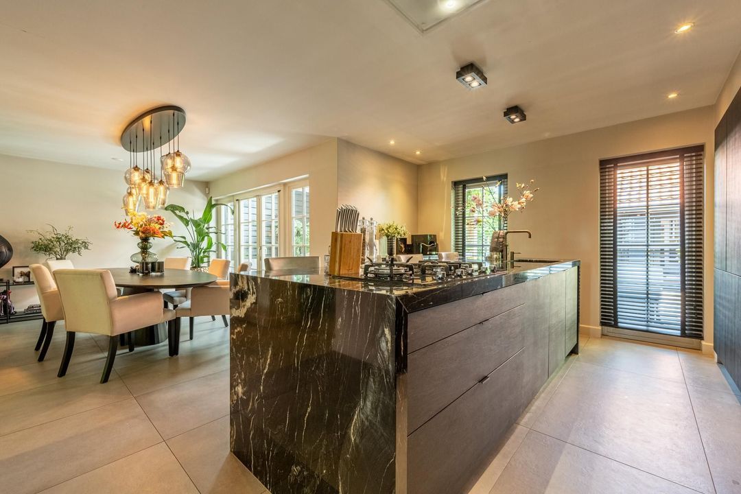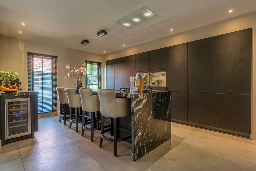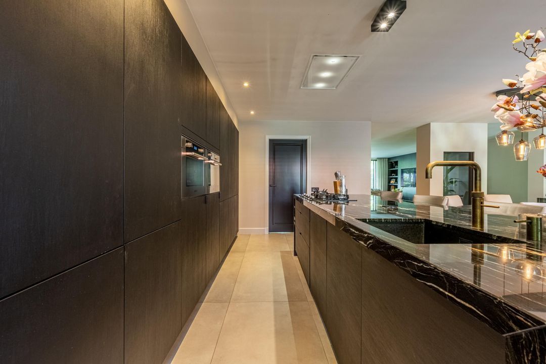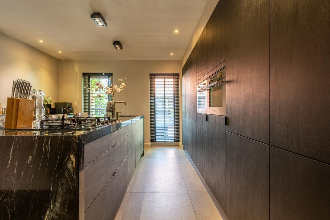 De keukenwand geeft ruimte aan een koelkast, vriezer, stoomoven en combimagnetron. Het kookeiland is voorzien van alle een 5-pits gasfornuis met afzuigkap, wasbak met Quooker, de vaatwasser en ruimte voor gasten aan de bar. Daarnaast is er een koffiecorner met wijnklimaatkast. Aangrenzend bevindt zich een praktische bijkeuken met wasmachine- en droger opstelling en toegang tot de zijtuin.