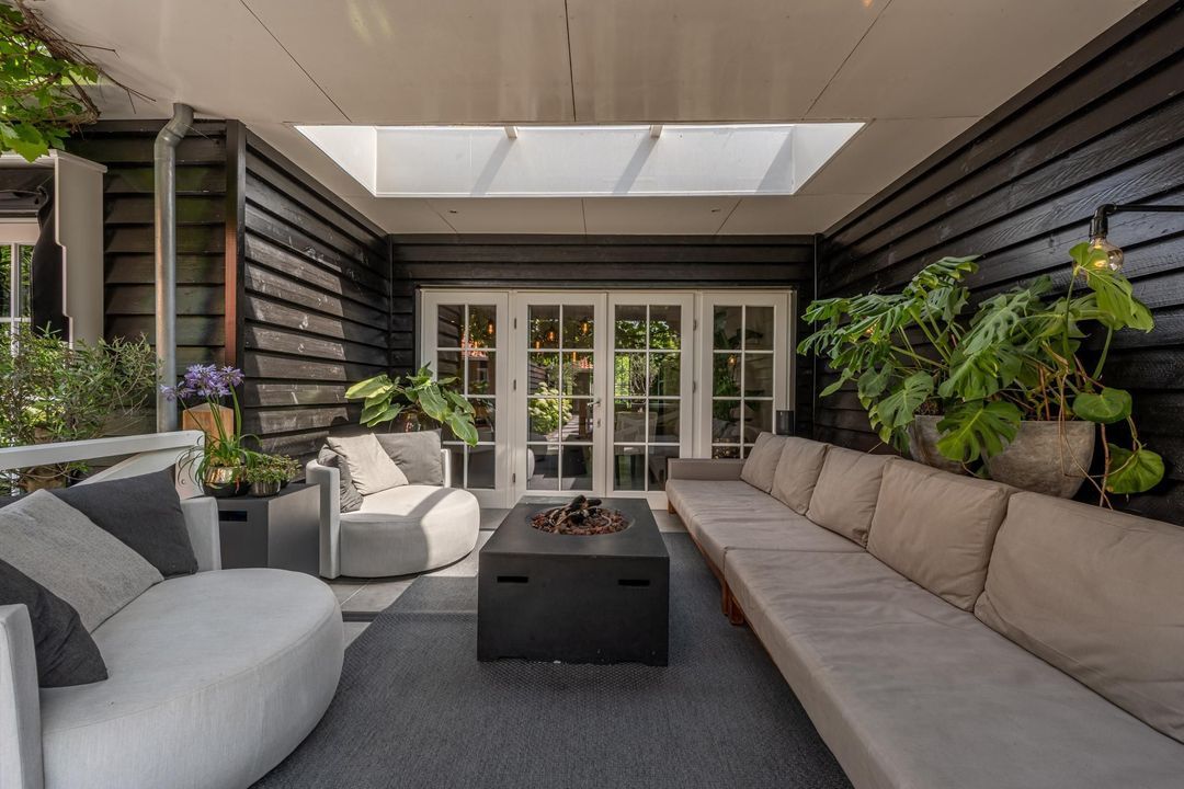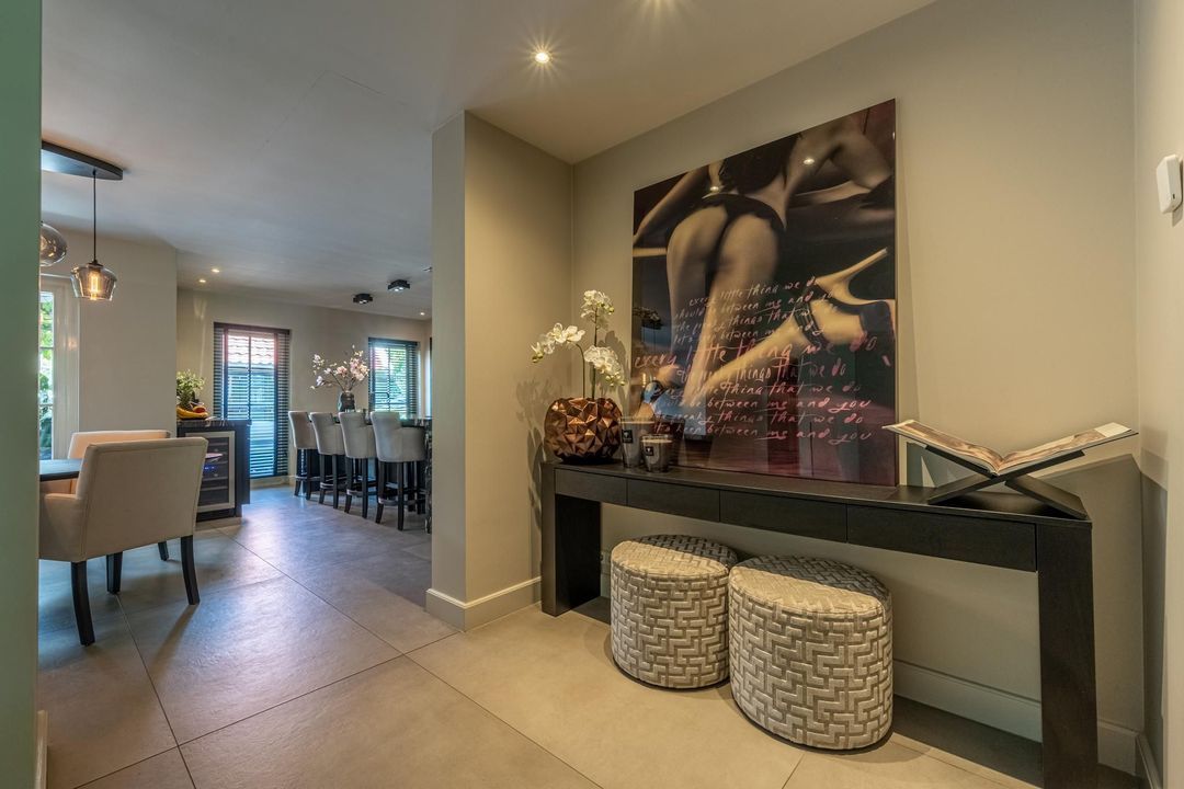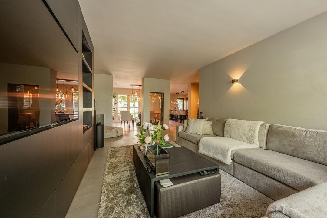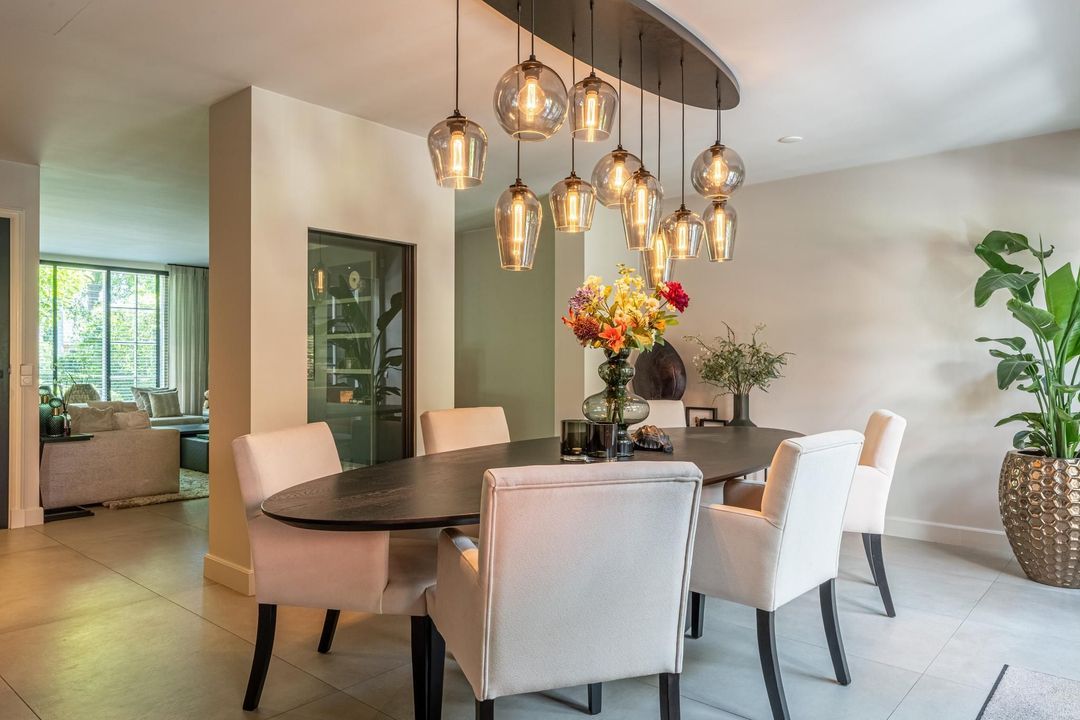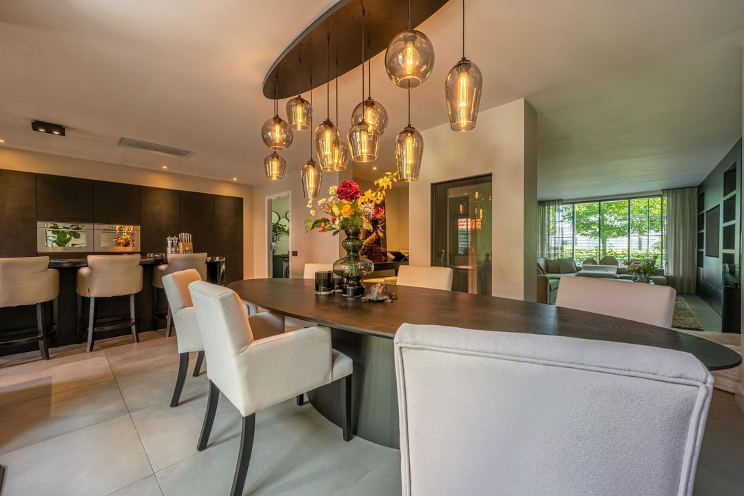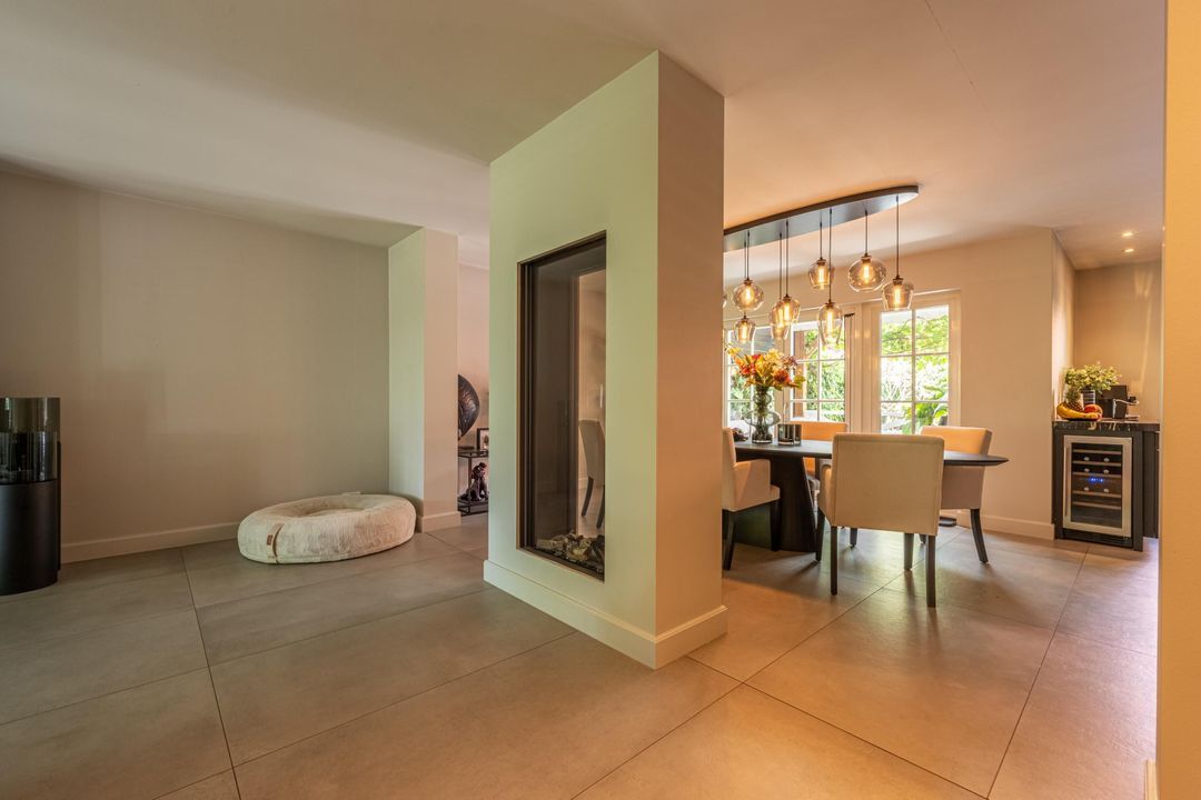 Zeer royaal uitgebouwde woonkamer met een sfeervolle zithoek aan de voorzijde, voorzien van een cinema wall. In het verlengde is een moderne tunnel gashaard gesitueerd met speelse doorkijk naar de ruim opgezette eethoek die naadloos aansluit op de moderne keuken met kookeiland. Vanuit de eetkamer met openslaande deuren loop je zo de sfeervolle veranda op.