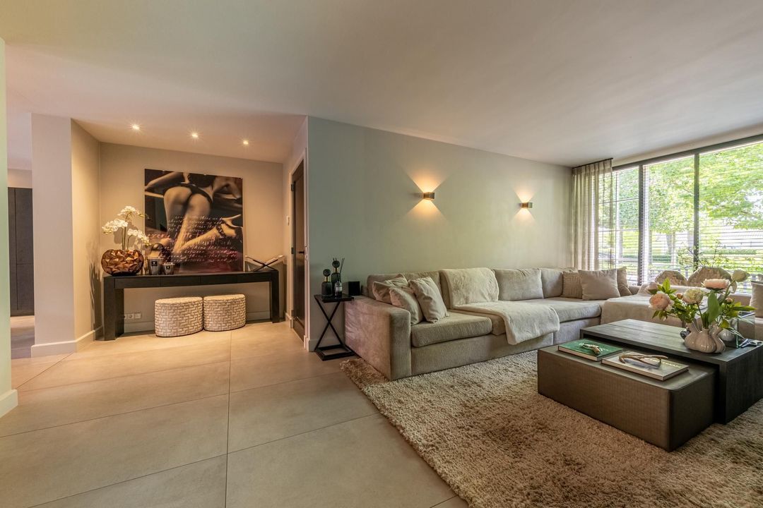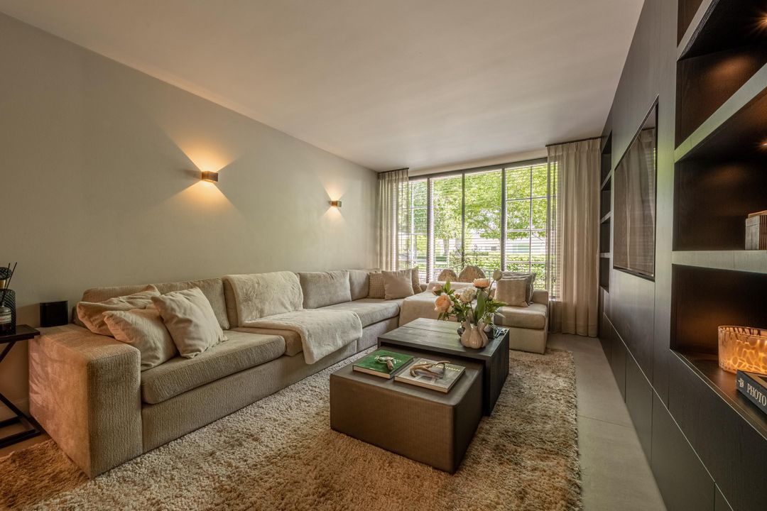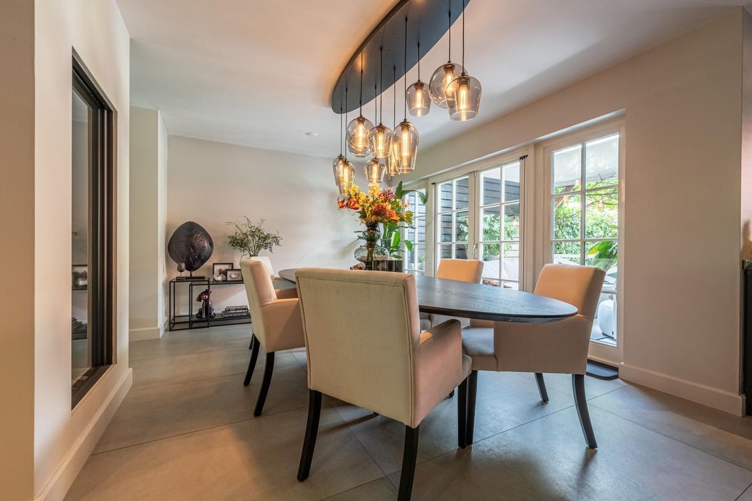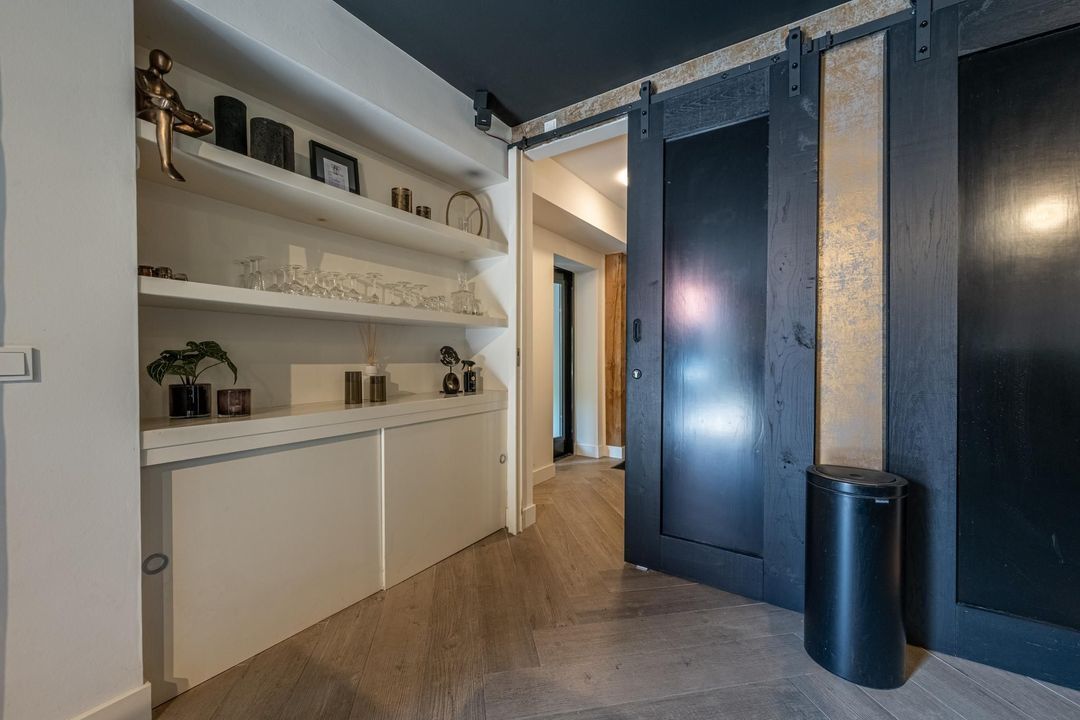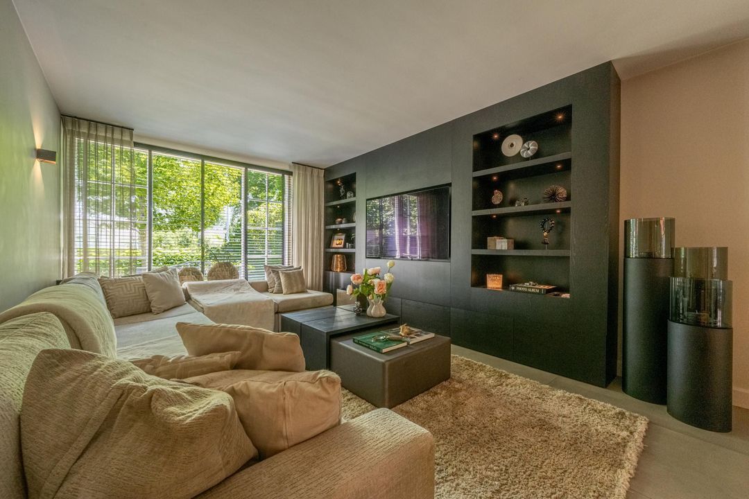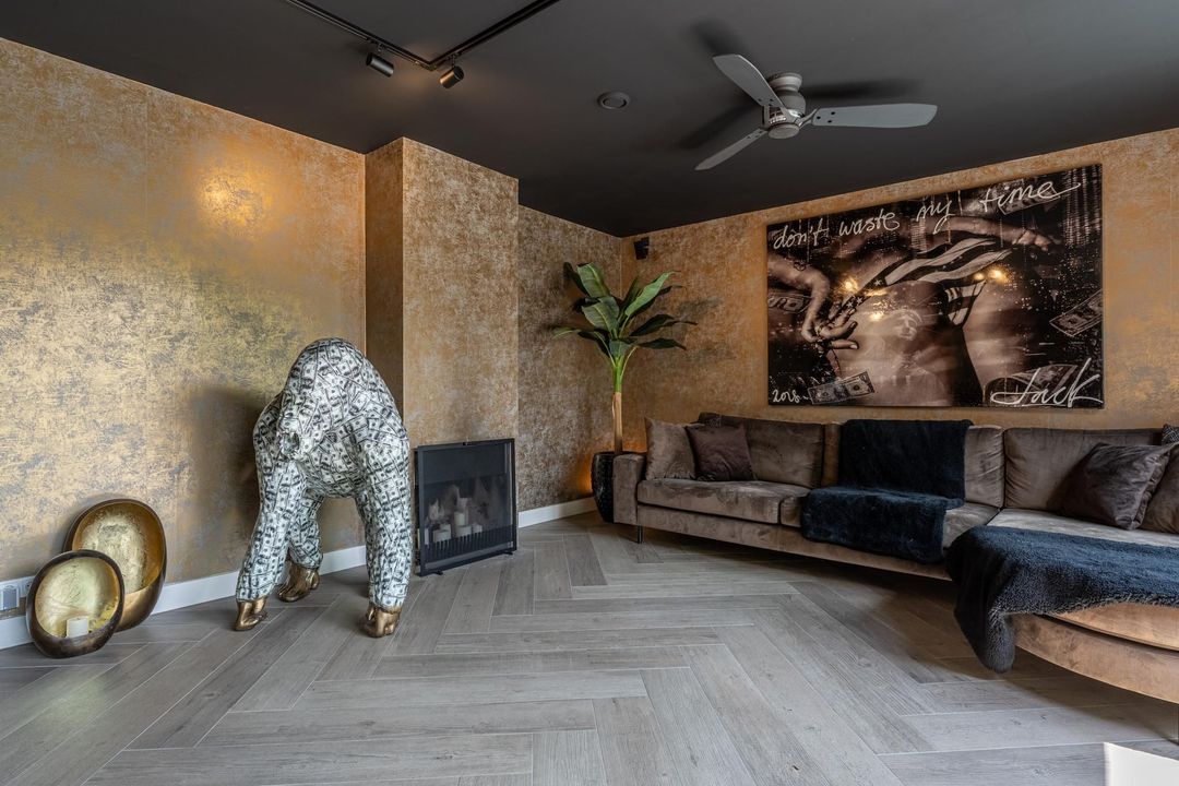 Zeer royaal uitgebouwde woonkamer met een sfeervolle zithoek aan de voorzijde, voorzien van een cinema wall. In het verlengde is een moderne tunnel gashaard gesitueerd met speelse doorkijk naar de ruim opgezette eethoek die naadloos aansluit op de moderne keuken met kookeiland. Vanuit de eetkamer met openslaande deuren loop je zo de sfeervolle veranda op.