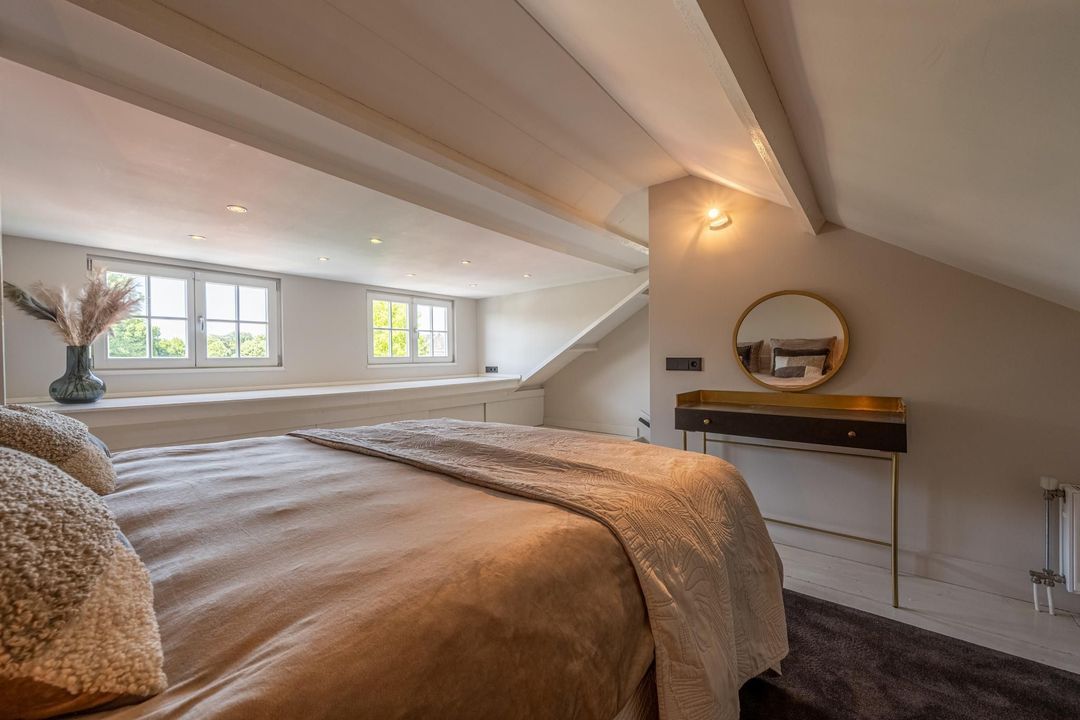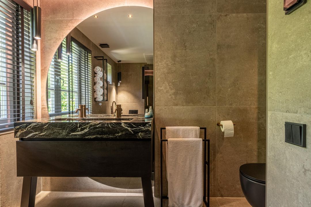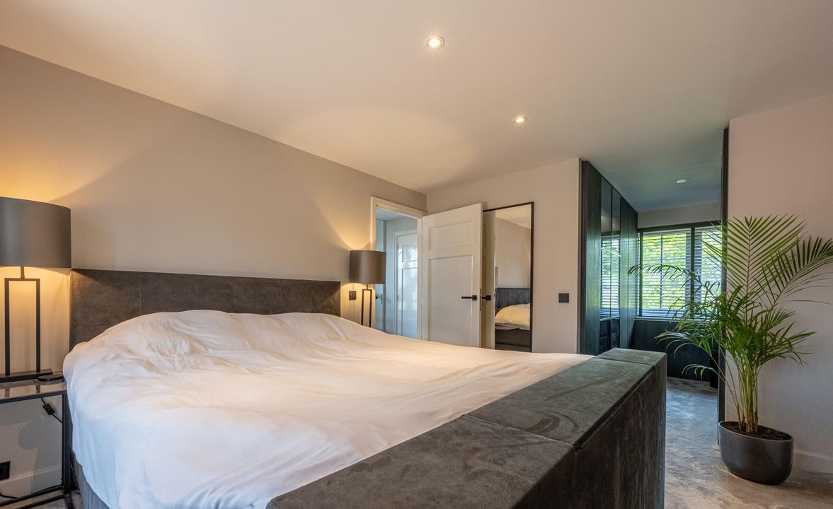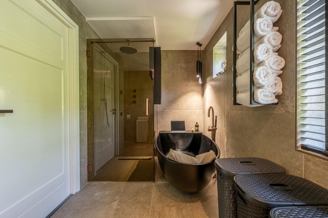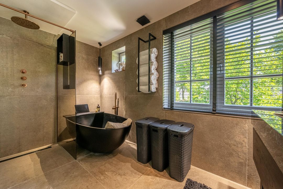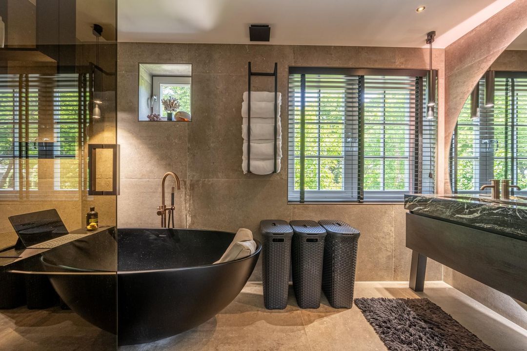De moderne badkamer is van alle luxe voorzien: een vrijstaand ligbad, ruime inloopdouche met regendouchekop, dubbele wastafel met verwarmde en verlichte spiegel, toilet en elektrische vloerverwarming voor extra comfort.
