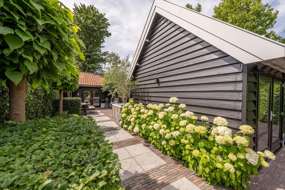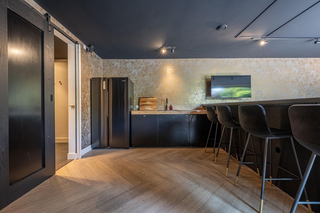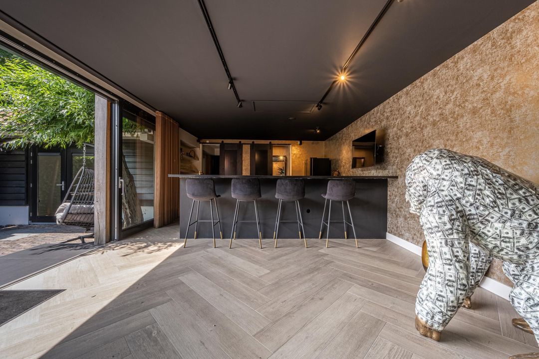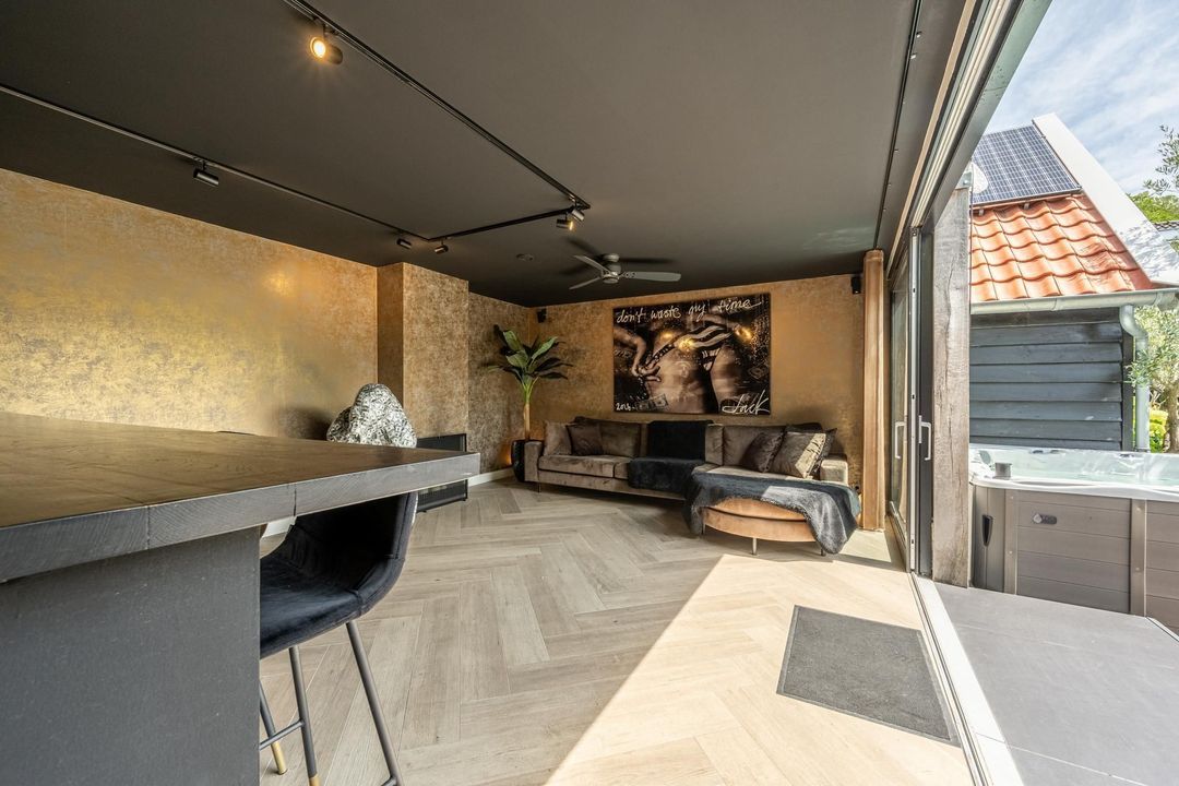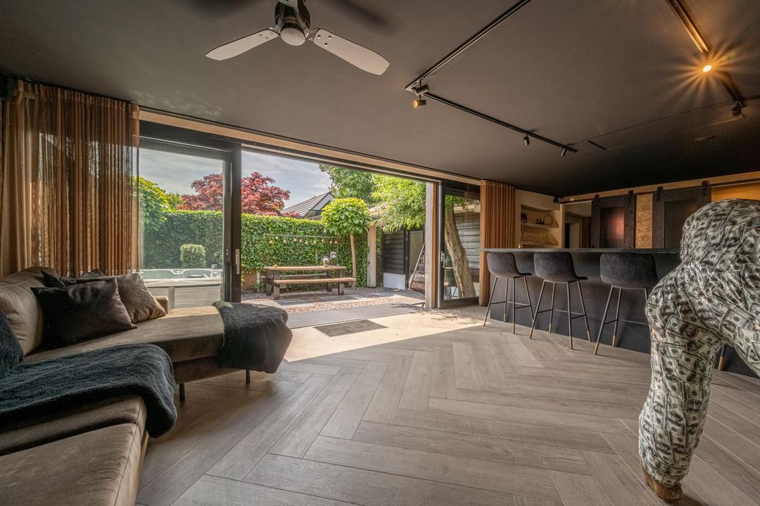 Het bijgebouw met dubbele schuifpui is ideaal in gebruik als gastenverblijf, eigen woonruimte voor een tiener of als recreatieruimte. De woonkamer is voorzien van dubbele beglazing en een plavuizen visgraatvloer met vloerverwarming. Er is ruimte voor een zit- en eethoek en de open keuken is voorzien van een Amerikaanse koelkast, Quooker, vaatwasser, oven, koffiemachine en ruime bar.