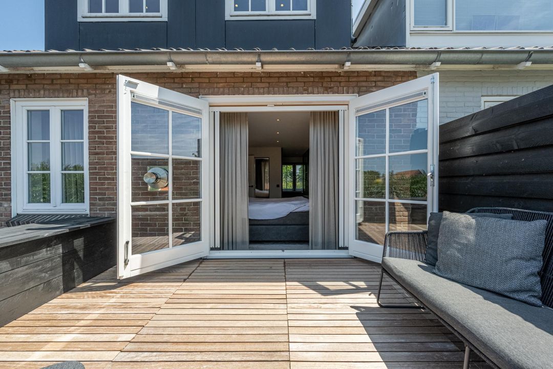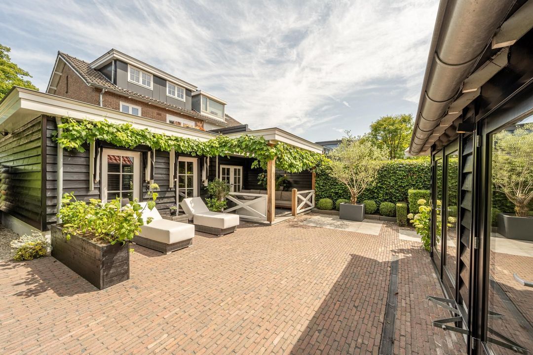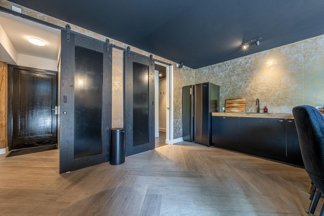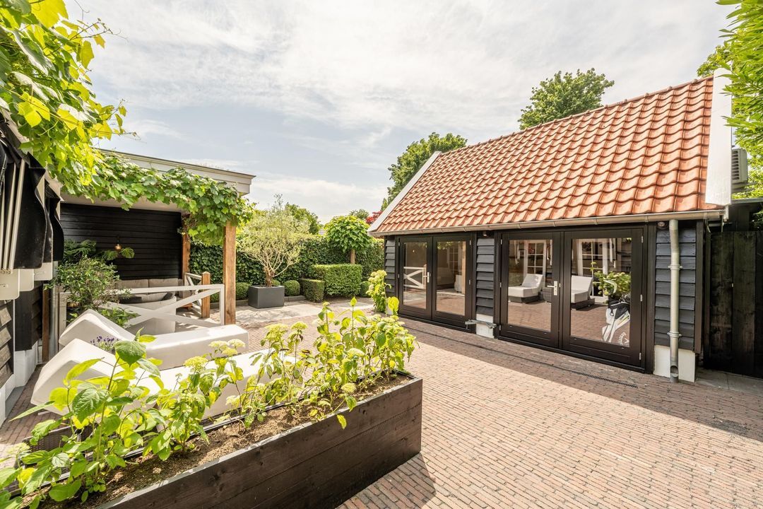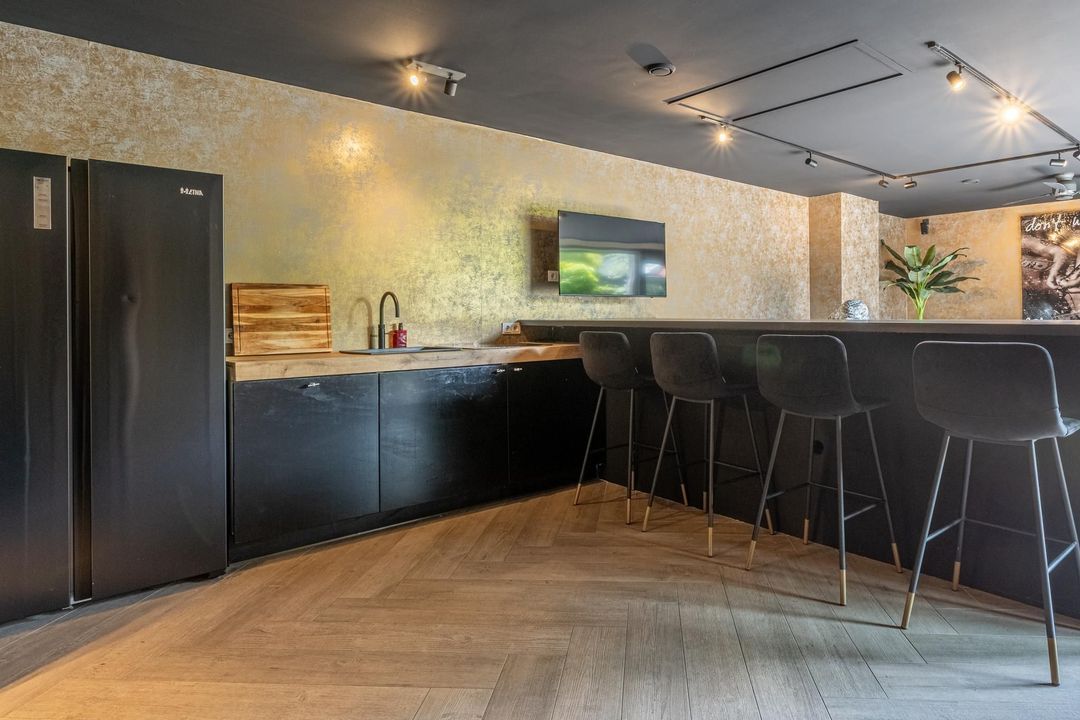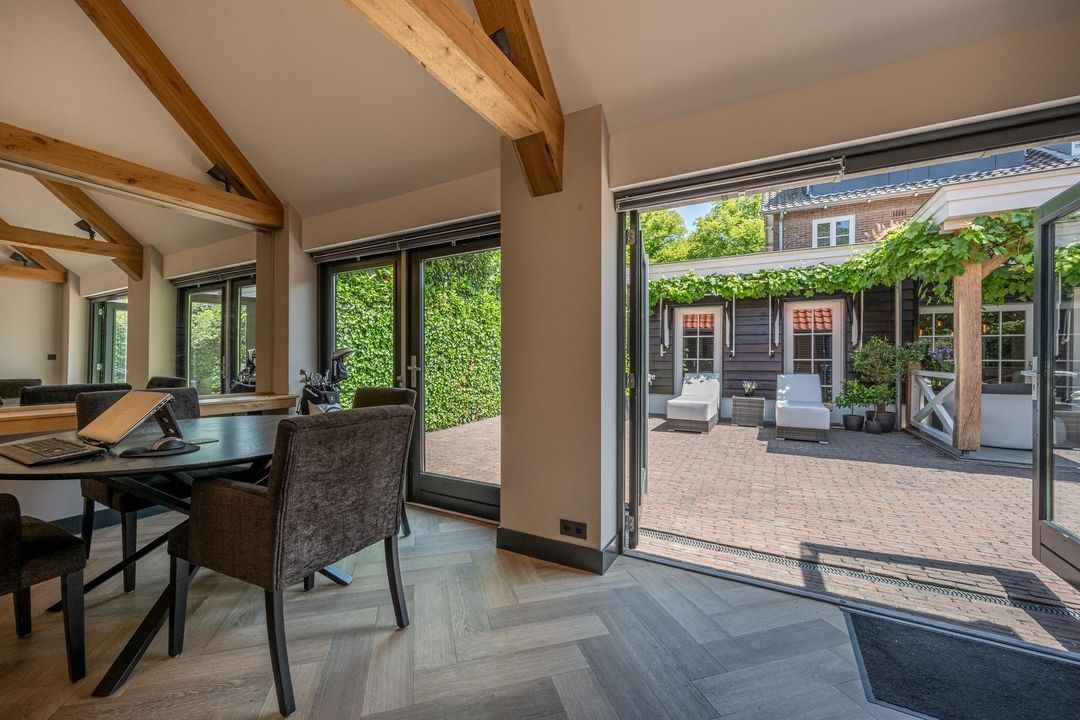 Het bijgebouw met dubbele schuifpui is ideaal in gebruik als gastenverblijf, eigen woonruimte voor een tiener of als recreatieruimte. De woonkamer is voorzien van dubbele beglazing en een plavuizen visgraatvloer met vloerverwarming. Er is ruimte voor een zit- en eethoek en de open keuken is voorzien van een Amerikaanse koelkast, Quooker, vaatwasser, oven, koffiemachine en ruime bar.