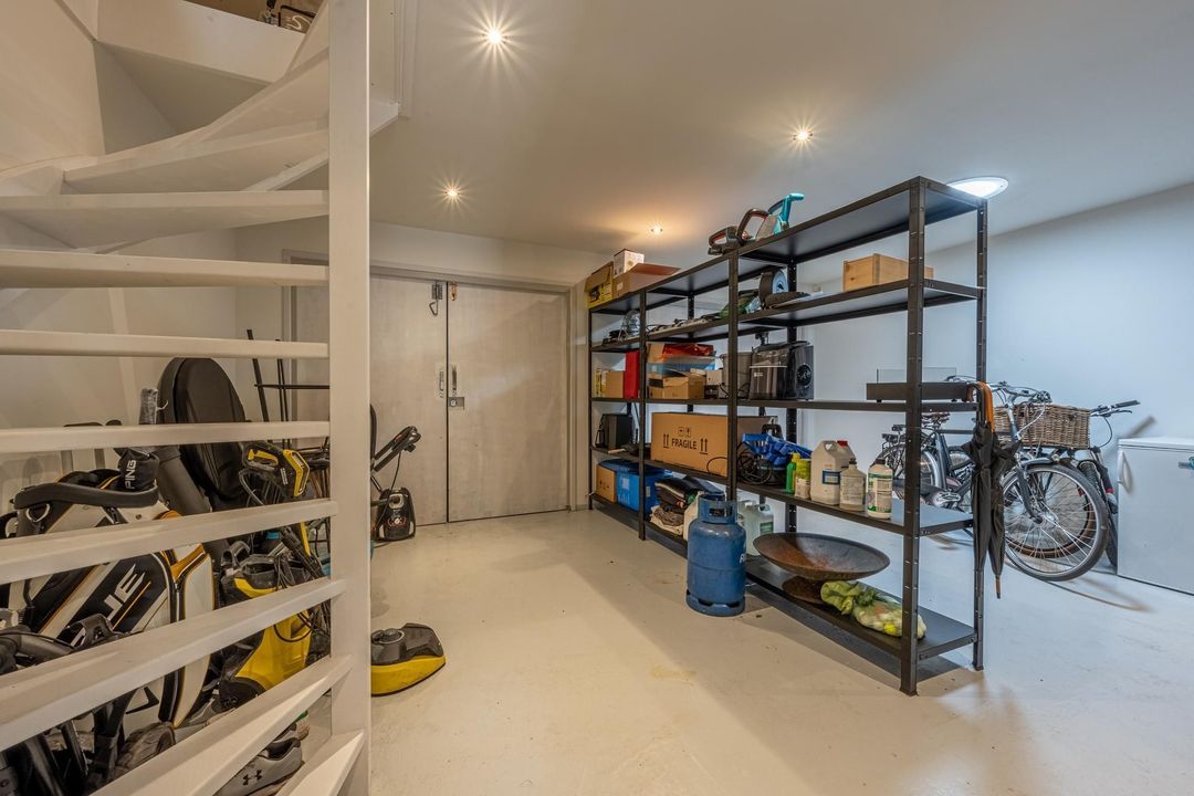 Riante berging met ruimte voor fietsen, motoren en (tuin)gereedschap. Via een vaste trap is een vliering toegankelijk.