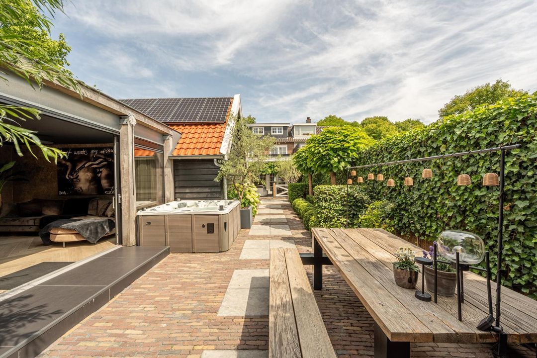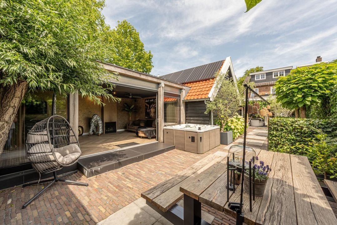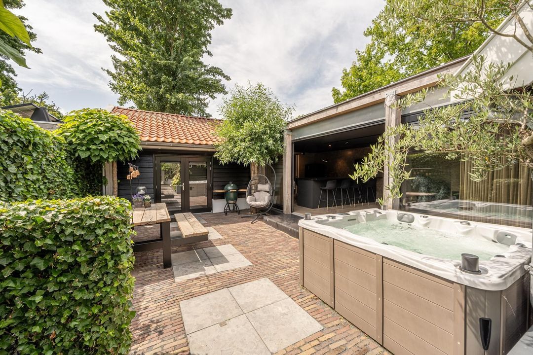 In het verlengde van de tuin is een gezellige patio met een grote eettafel en een jacuzzi, perfect gepositioneerd voor privacy en ontspanning. Via de tuin is er tevens toegang tot het vrijstaande bijgebouw.
