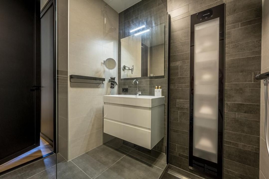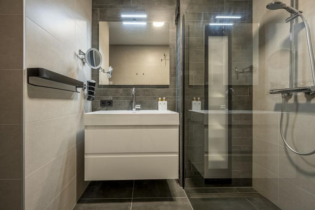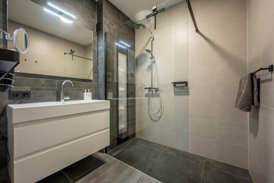 De badkamer heeft een moderne en luxe uitstraling. De badkamer is ingericht met een ruime inloopdouche met regen- en handdouche en een heerlijke sunshower, wastafelmeubel met spiegelverlichting, designradiator en afzuigsysteem.