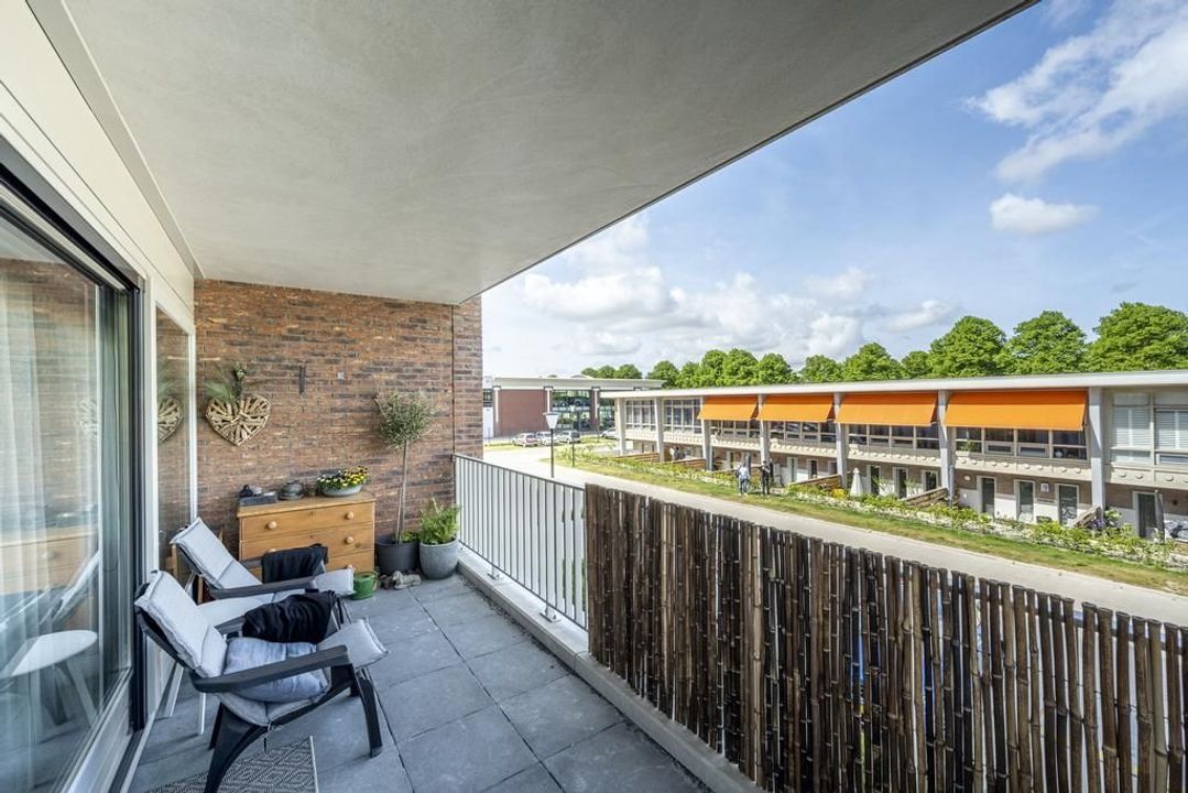 Via de hoge moderne taatsdeur is er toegang tot de woonkamer en de keuken. Wat een mooie ruimte! Doordat het appartement een hoekligging heeft, is er een zijraam met vrij uitzicht richting Croonenburg. Het overdekte balkon is gelegen op het westen en via de schuifpui, met hordeur, te bereiken. Zet op een mooie dag de schuifpui open en het balkon wordt een verlengstuk van de living.