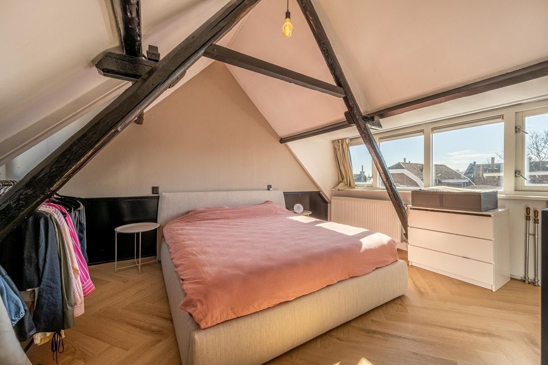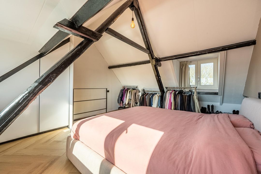 Op de eerste verdieping bevindt zich de slaapkamer. Deze ruimte is verrassend licht dankzij de dakkapellen aan zowel de voor- als achterzijde. De combinatie van het balkenwerk en de nette laminaatvloer geeft de kamer een warme en sfeervolle uitstraling.