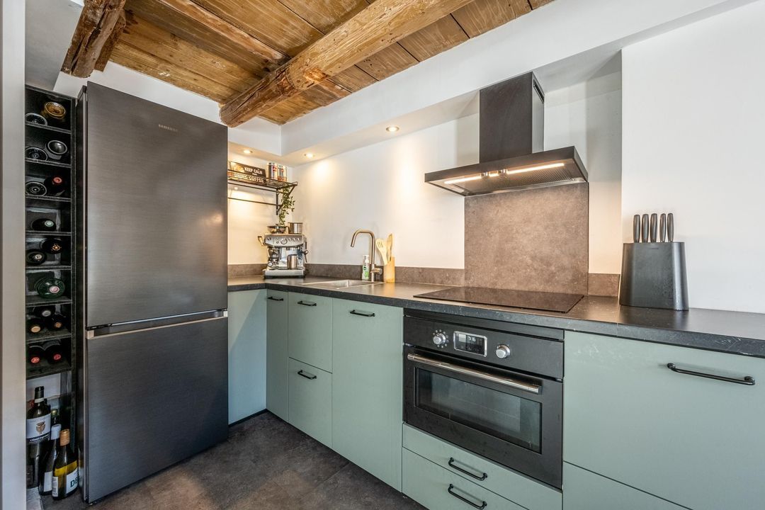 De leefkeuken is in 2021 vernieuwd en combineert sfeer met comfort dankzij de sierbalken en ingebouwde spots. De keuken is uitgerust met een wasbak, 4-pits inductiekookplaat met recirculatie afzuigsysteem, vaatwasser en combimagnetron.